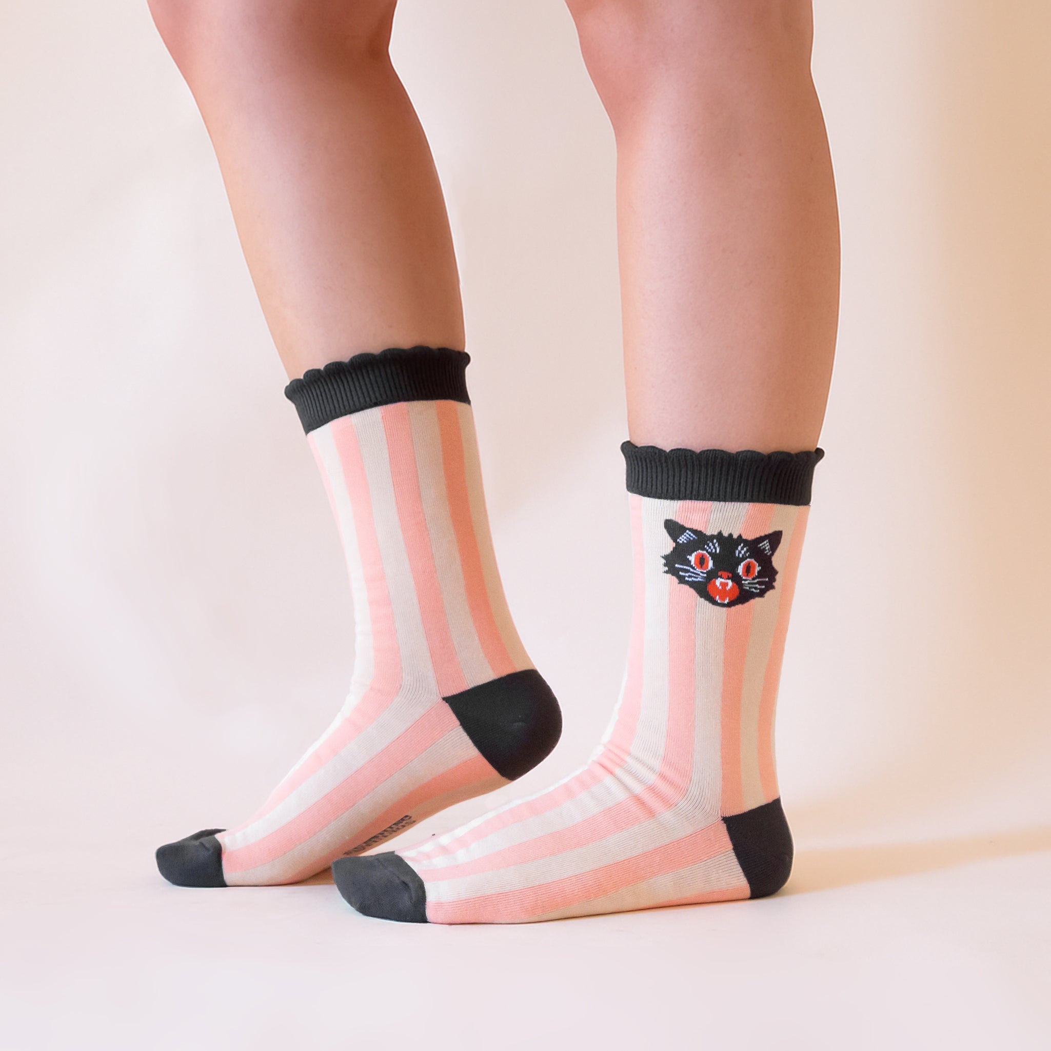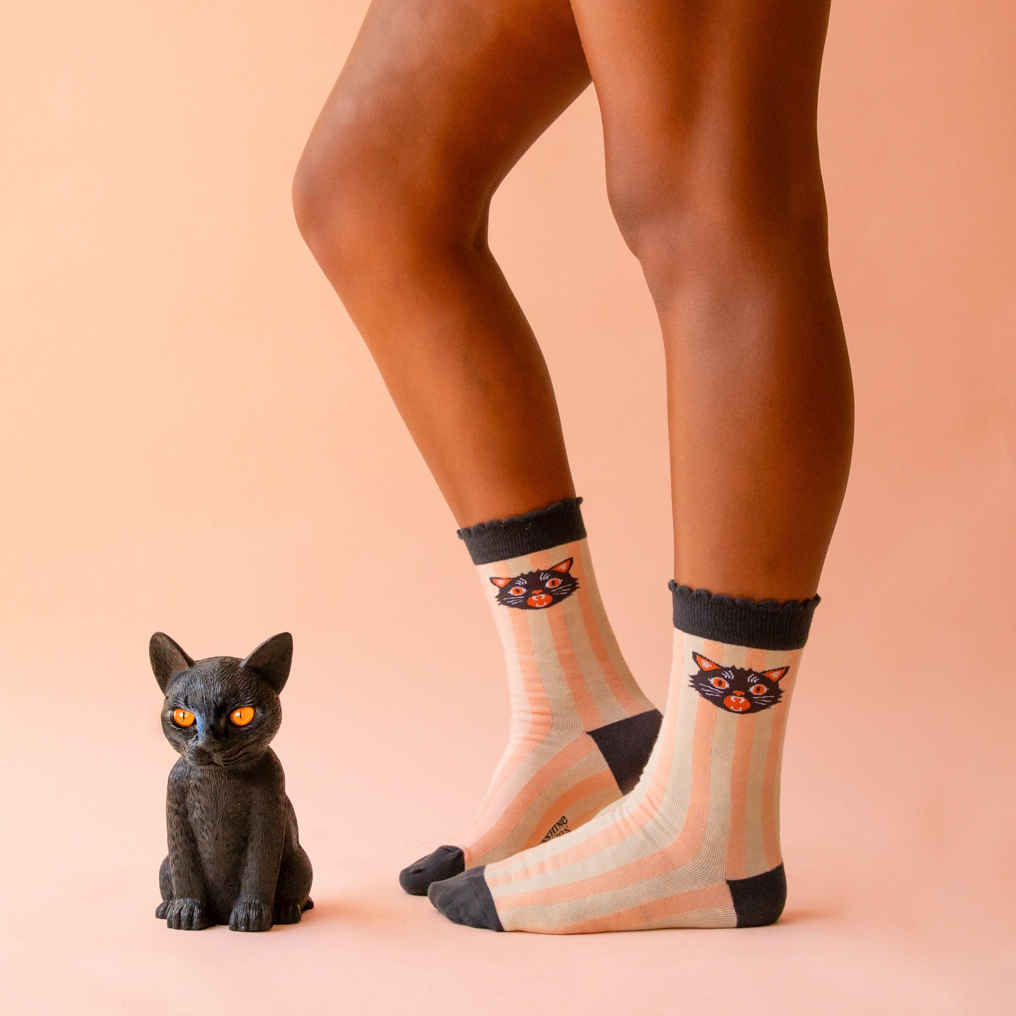 Step into a world of fun with these Spooky Kitty Crew Socks! Featuring an adorable black cat, black ruffle trim, and playful Halloween vibes, they add a touch of whimsy to your everyday look. Cozy and comfortable, these socks are perfect for keeping your feet warm while showing off your festive spirit. Whether for trick-or-treating or just lounging around, they’re a purr-fect way to celebrate the spooky season in style.
