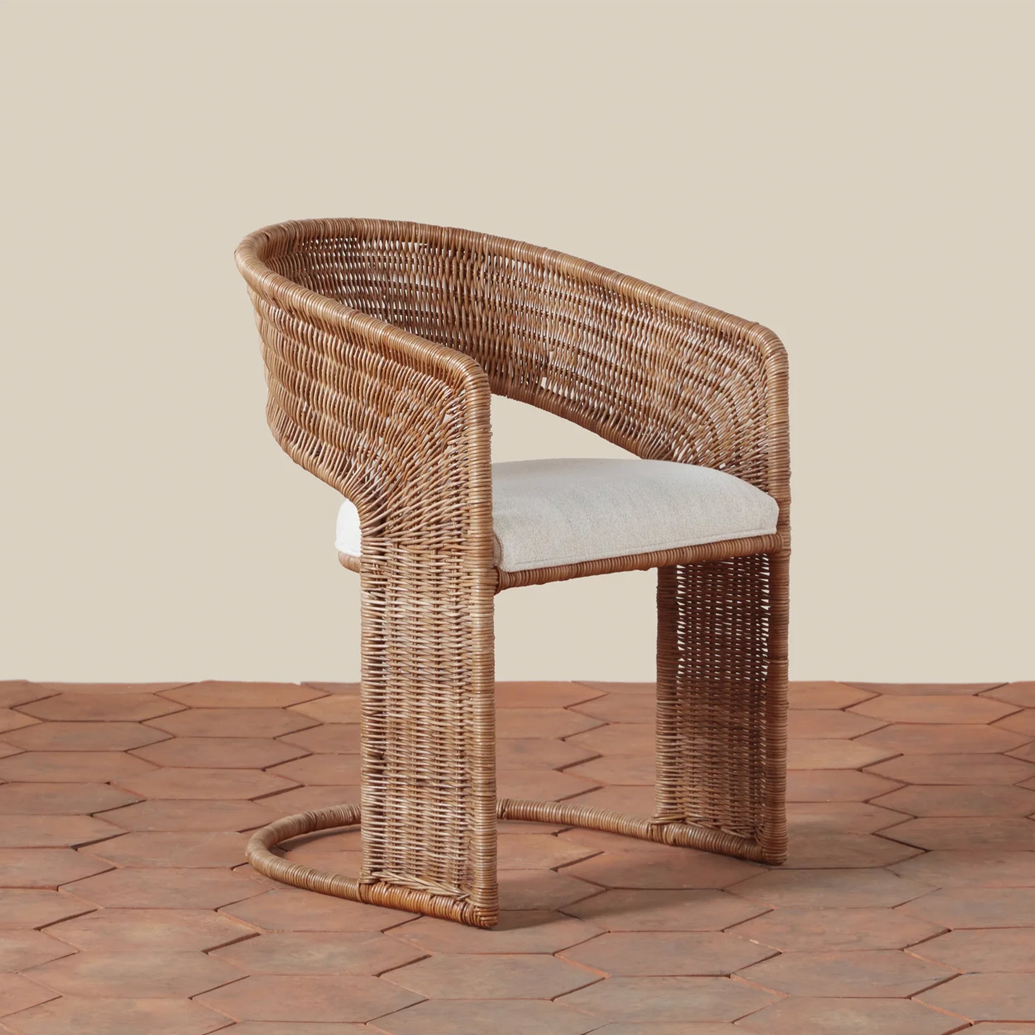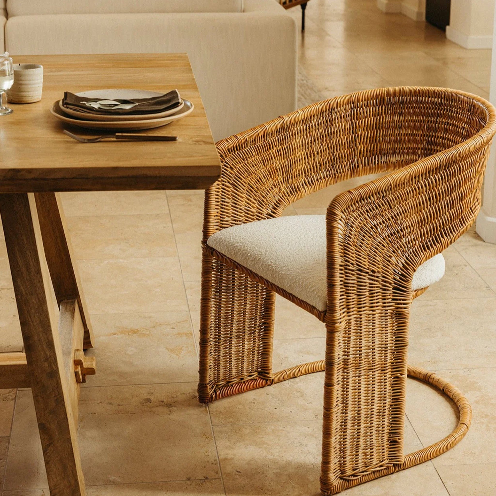Inspired by a particularly special vintage find, this architectural curved-back dining chair unites organic textures and sculptural clean lines thanks to expertly shaped handwoven wicker. Completed with an upholstered boucle cushion, this chair effortlessly elevates dining spaces and home offices with a touch of relaxed refinement.