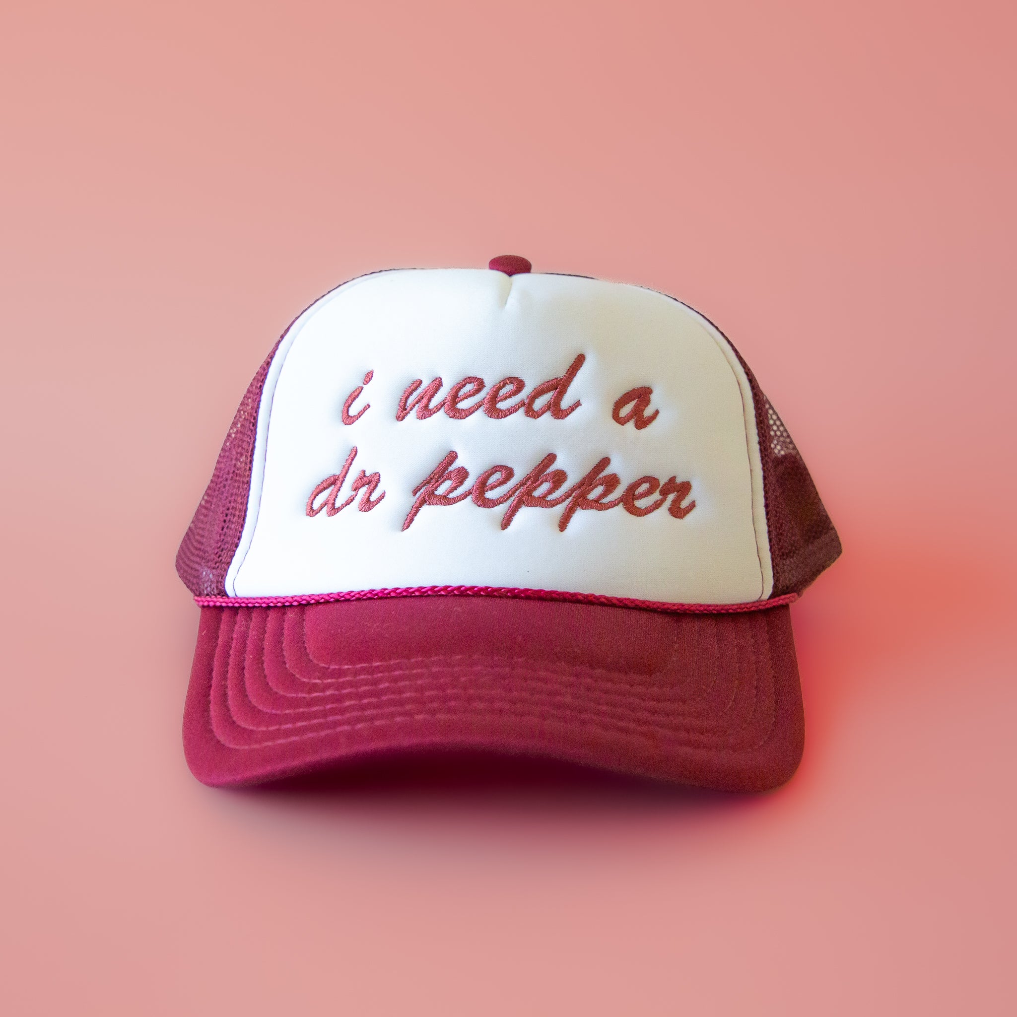 For all our girls and guys that love a Dr. Pepper - don't we all? The perfect foam trucker hat with a kitschy saying and in a Dr. Pepper inspired maroon hue.