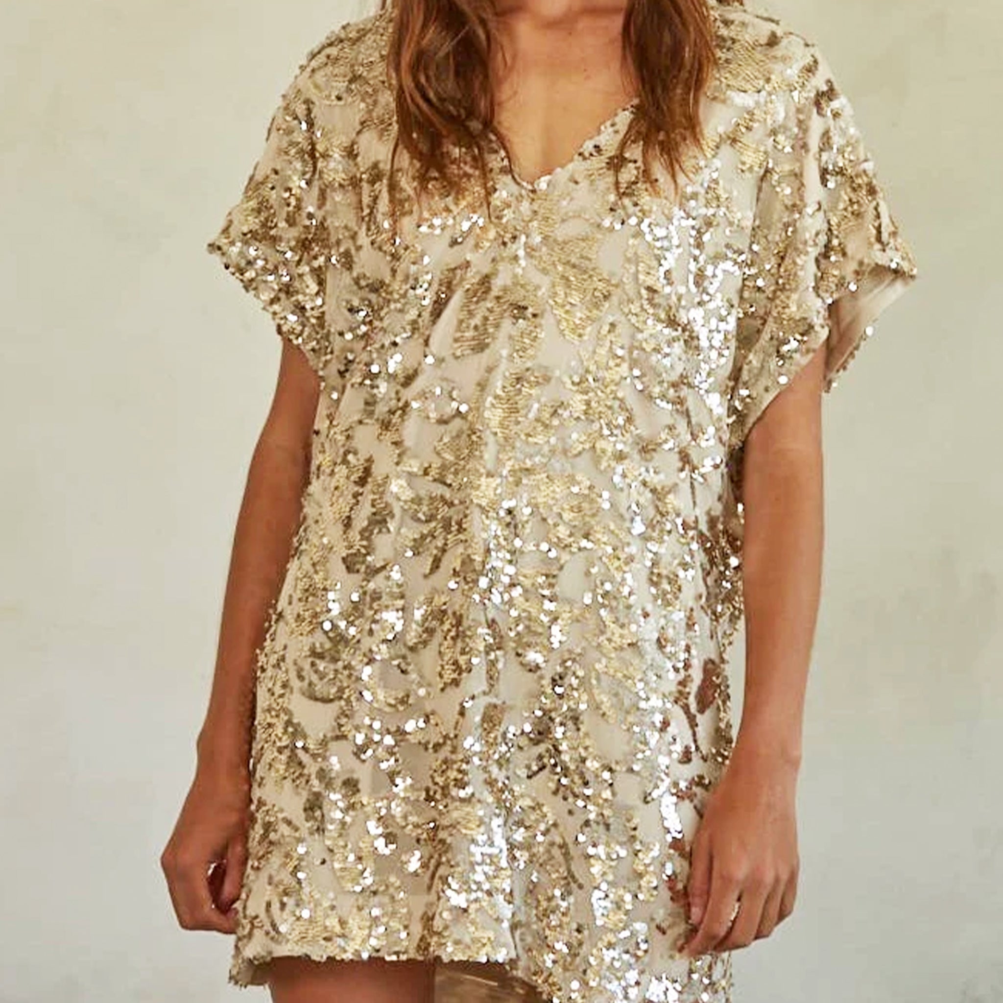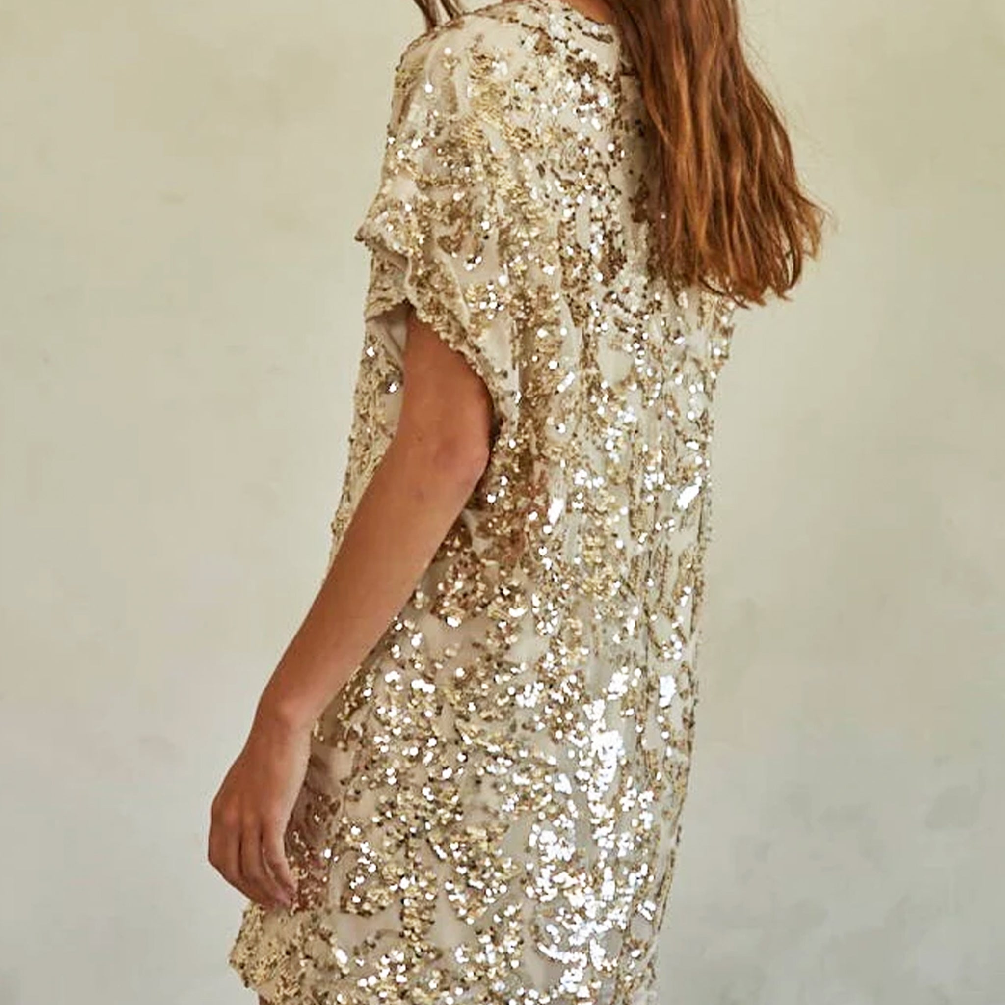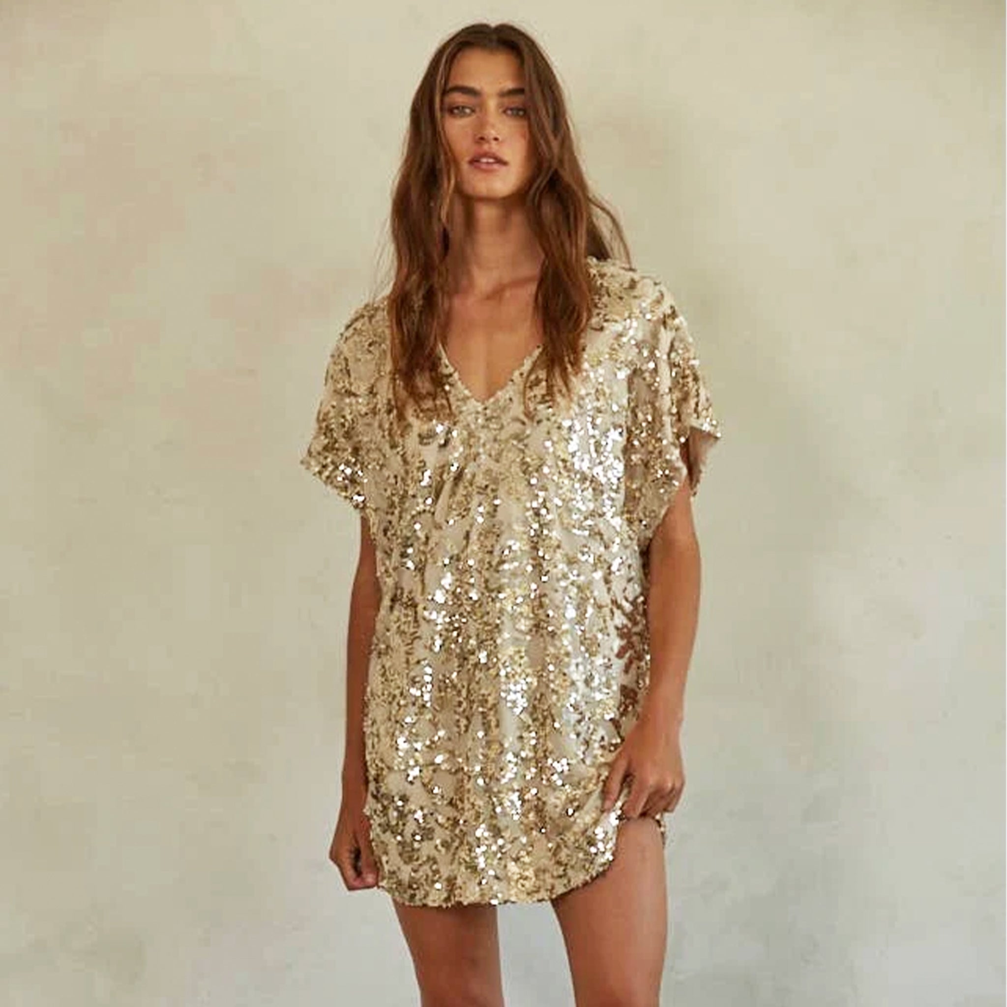 Shine bright in our In the Spotlight Dress! This gold sequin mini dress is perfect for special occasions, with short sleeves and a v-neckline, it's a must-have for every fashionista.