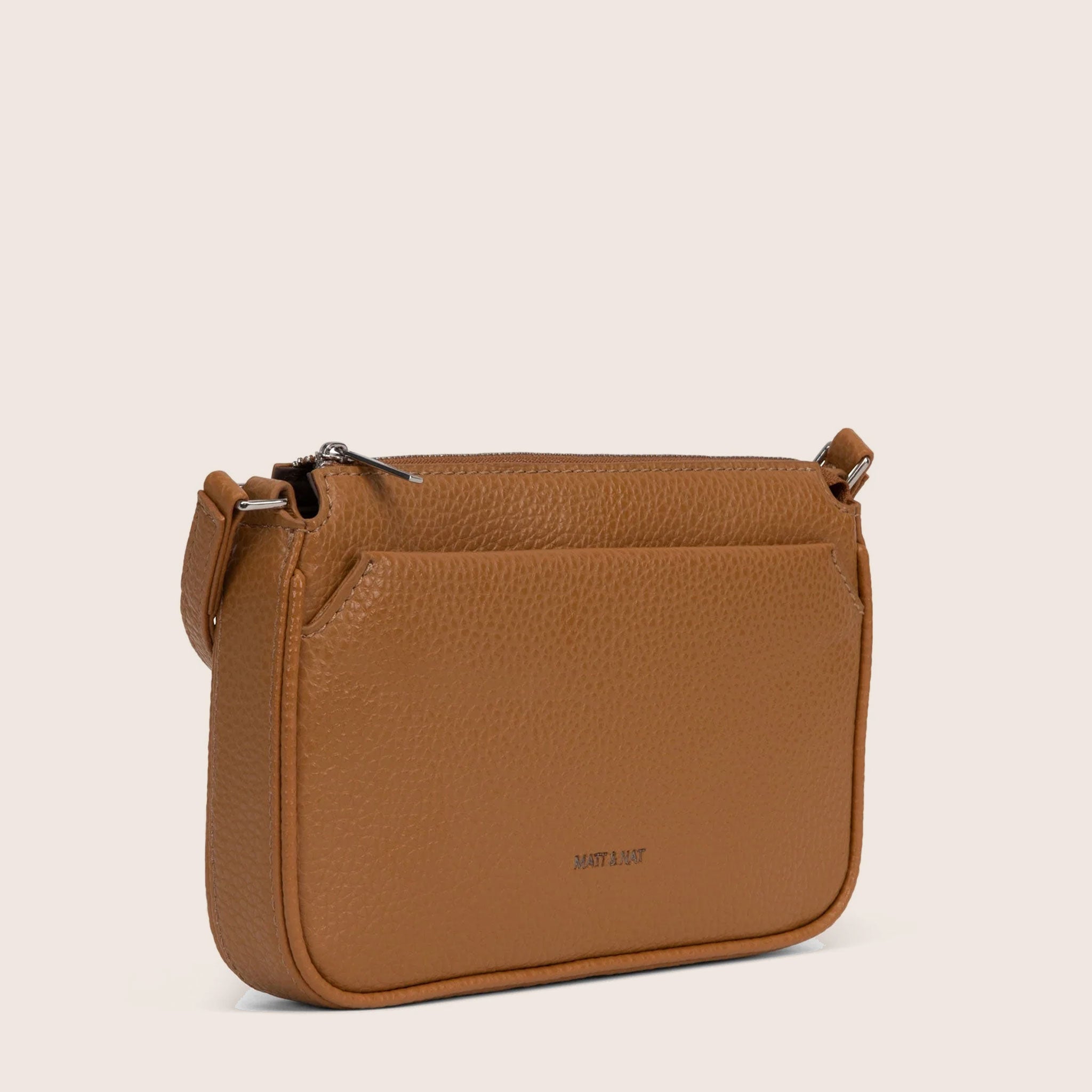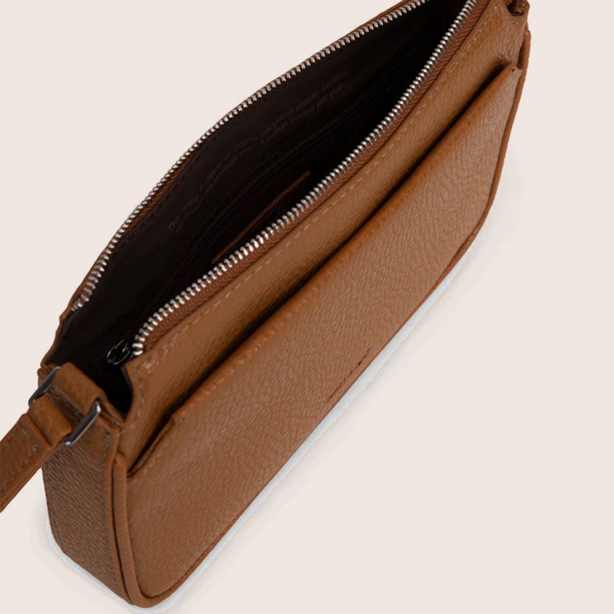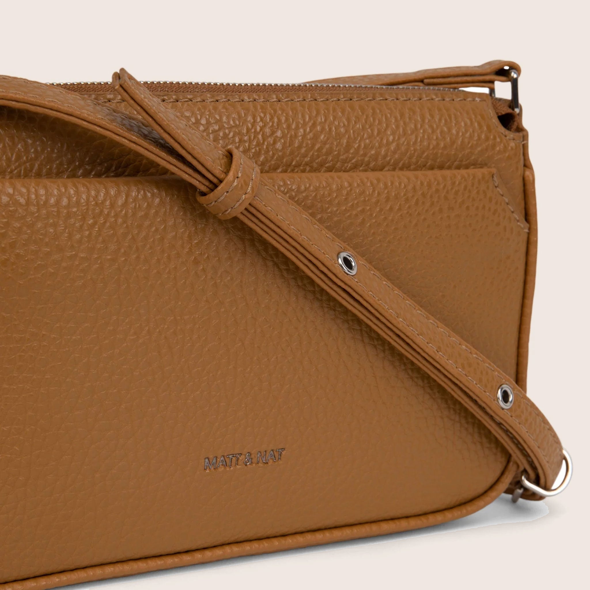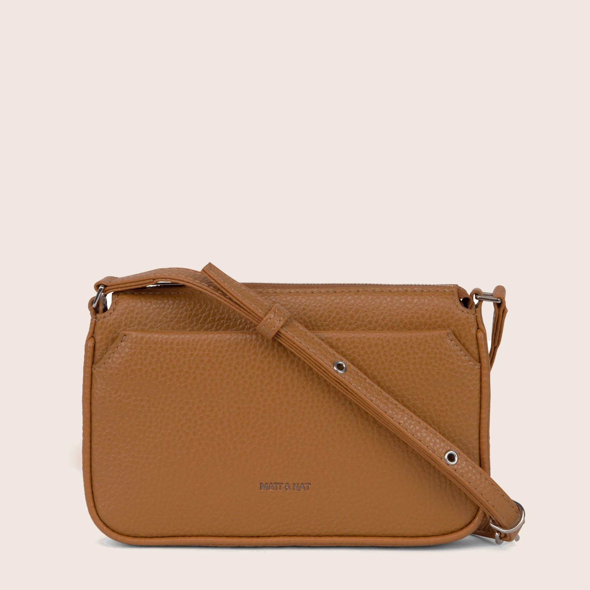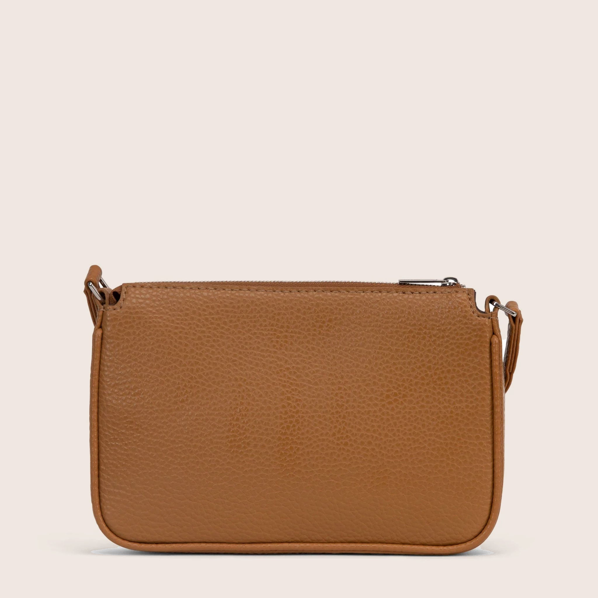 Say Hello to the Ivy Crossbody in the shade Amber - featuring a camel brown color and an adjustable strap and a front pocket with snap closure.