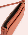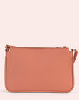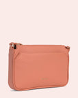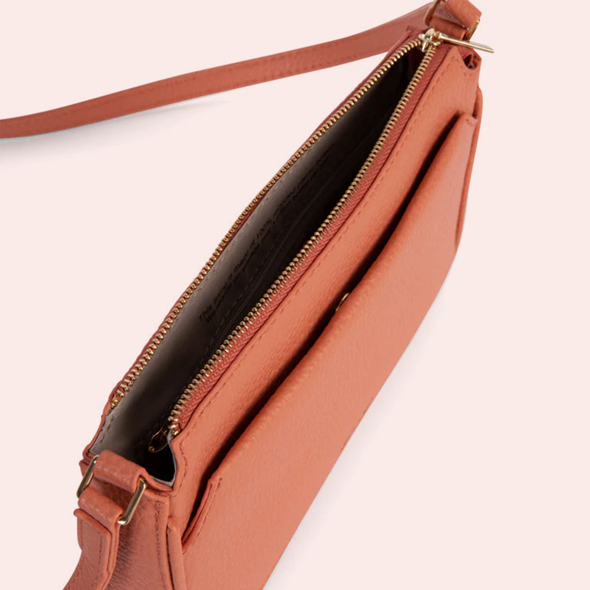 Say Hello to the Ivy Crossbody in the shade Plush - featuring a salmon pink color and an adjustable strap and a front pocket with snap closure.