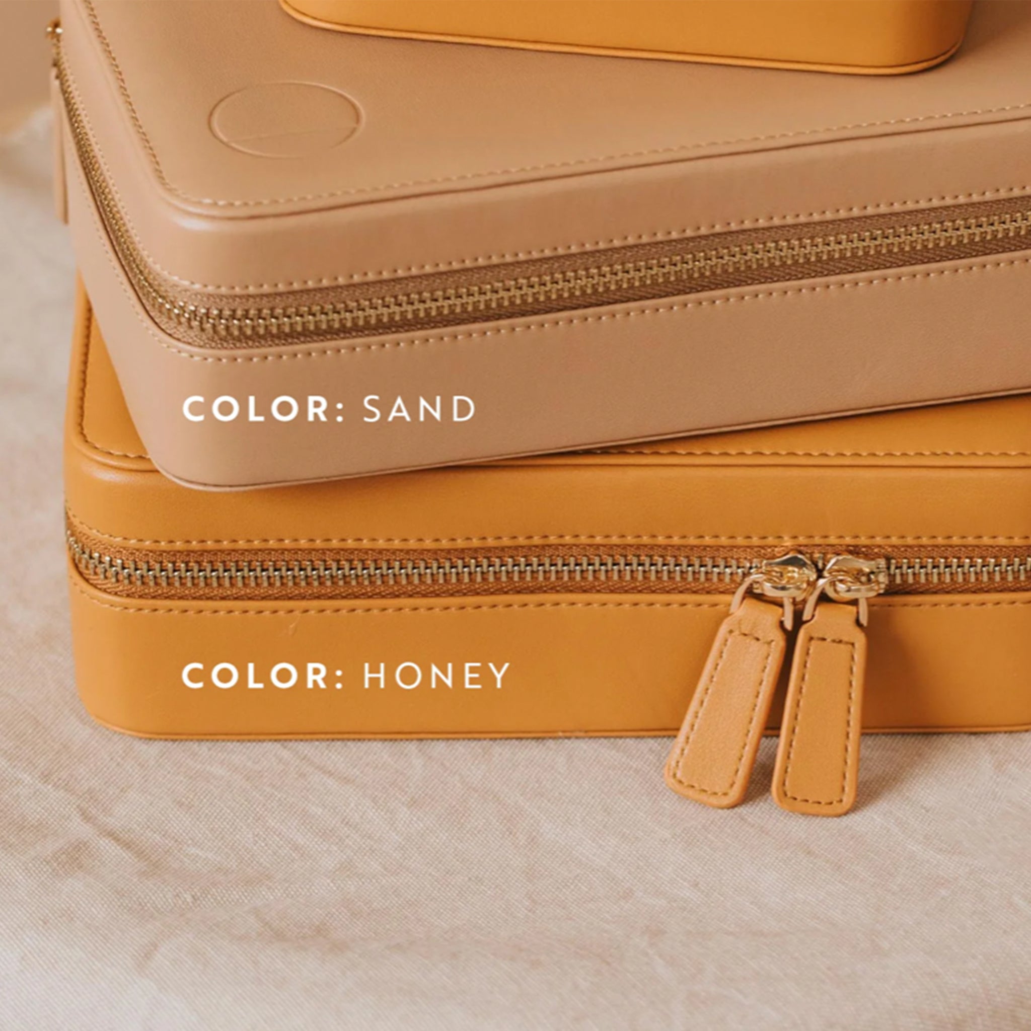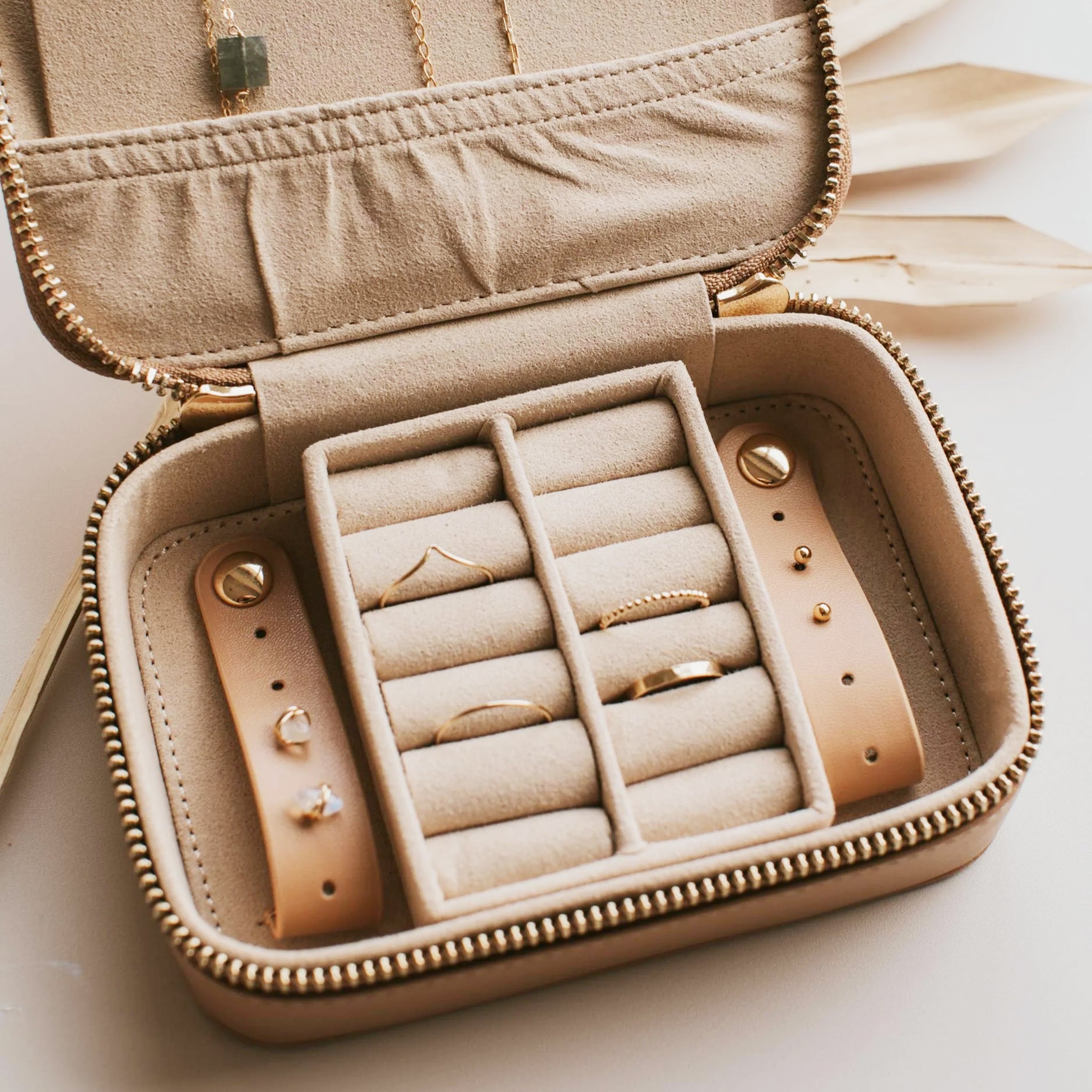 Travel essentials: sunglasses and jewelry. This travel case in the neutral shade tan is perfect to take your favorite jewelry pieces with you anywhere. Designed with plenty of storage but compact enough to store in your purse.