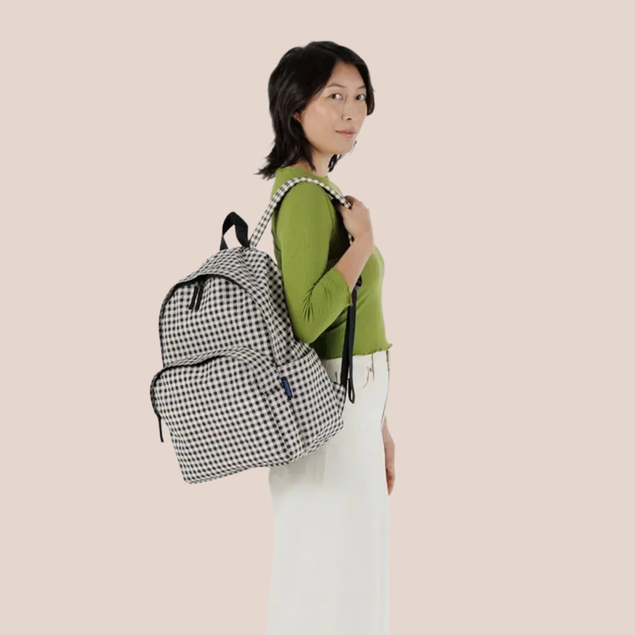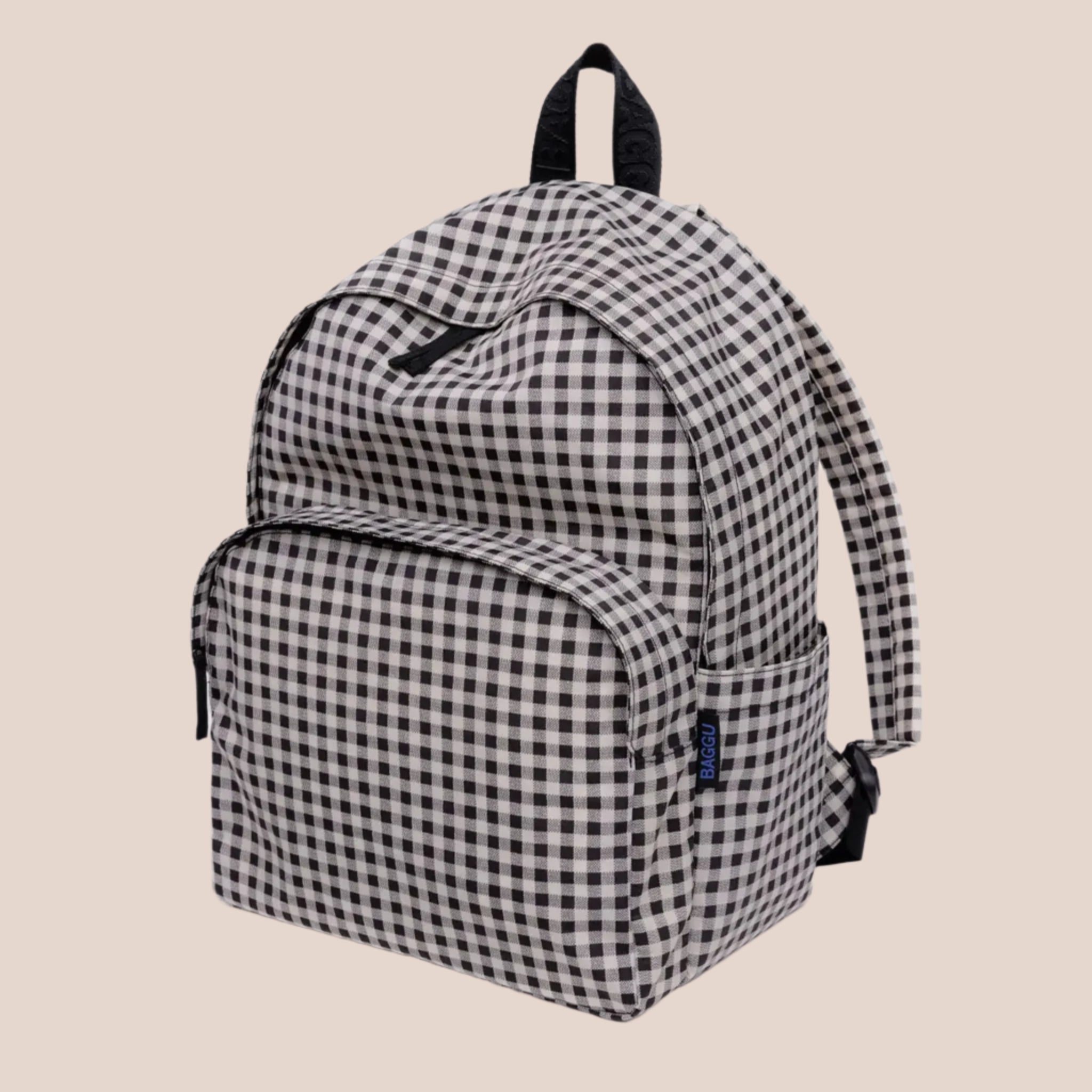 The Large Nylon Backpack by Baggu in the B&W Gingham print fits anything you need for work, school, or an overnight trip. Interior laptop sleeve with velcro closure that fits 16” laptop in puffy case. Padded back and two exterior water bottle holders. Lightweight, durable construction with padded, adjustable straps.