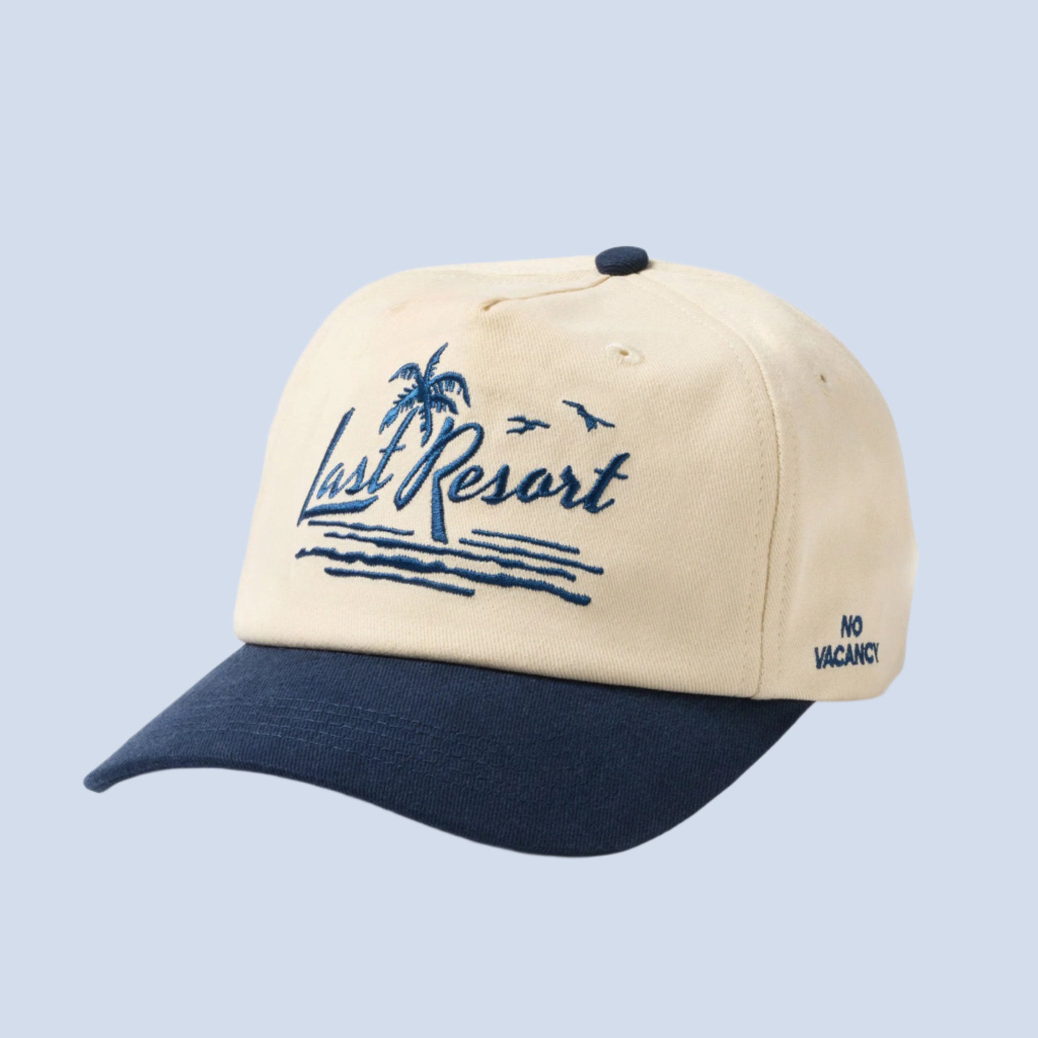 Stand out and stay cool with the Last Resort Baseball Hat in a two toned Navy and Cream color. Featuring a unique design with white stitching that says "Last Resort" and a scenic palm tree, birds, and ocean setting, this hat is perfect for any casual outing. A playful way to elevate your style!