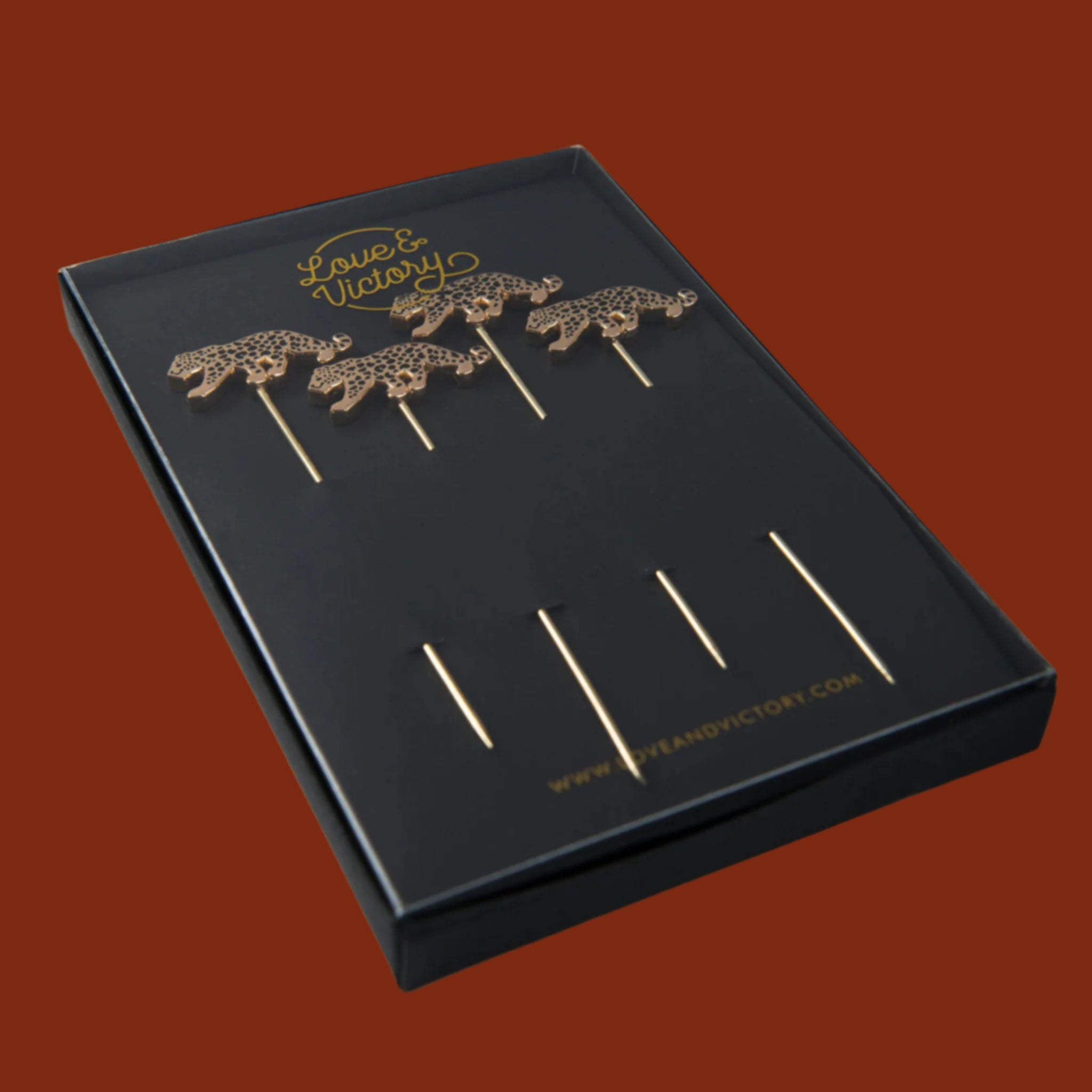 Leopard swizzlers to gussy up your drinks! An alluring set 4 of cocktail picks adorned with elegantly leaping leopards. Gold picks with black enamel finish, packaged in a swanky black box.