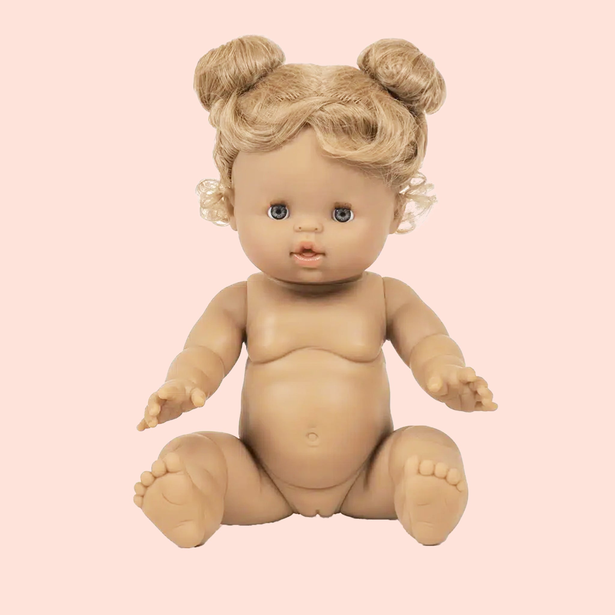 Introducing Minikane's Louise Doll - featuring blue eyes, blonde hair and two space buns on each side of her head. Louise is perfect for imaginative play and your child will love caring for their very own little babe. Clothing sold separately.