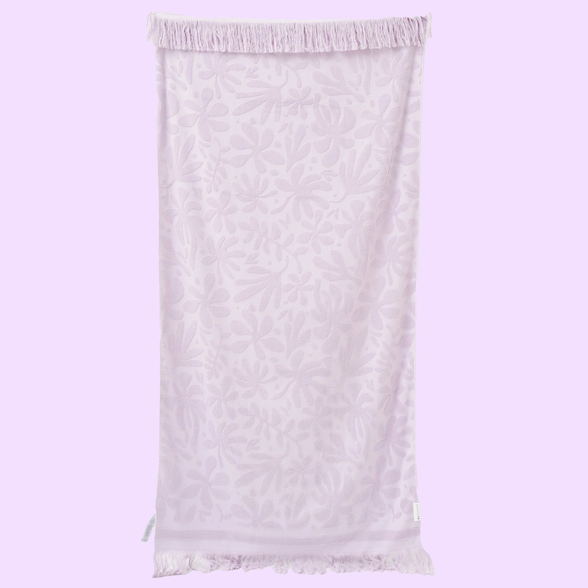 100% cotton. Premium 420gsm jacquard terry towelling. Central hanging loop. Self fabric fringing.