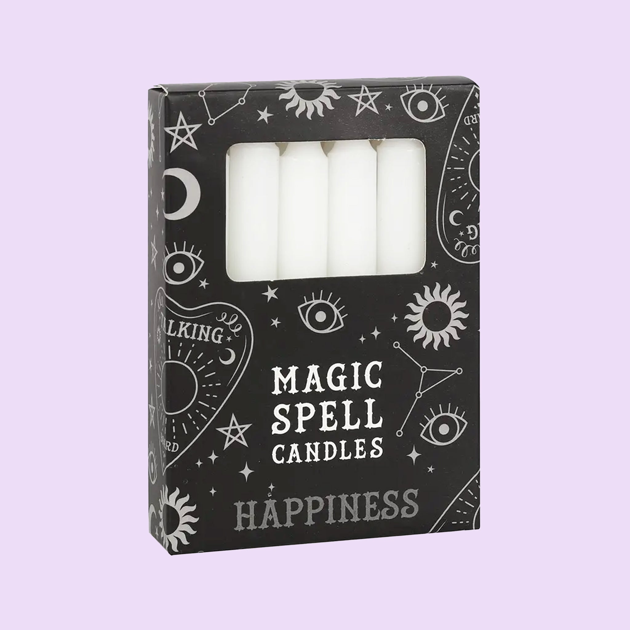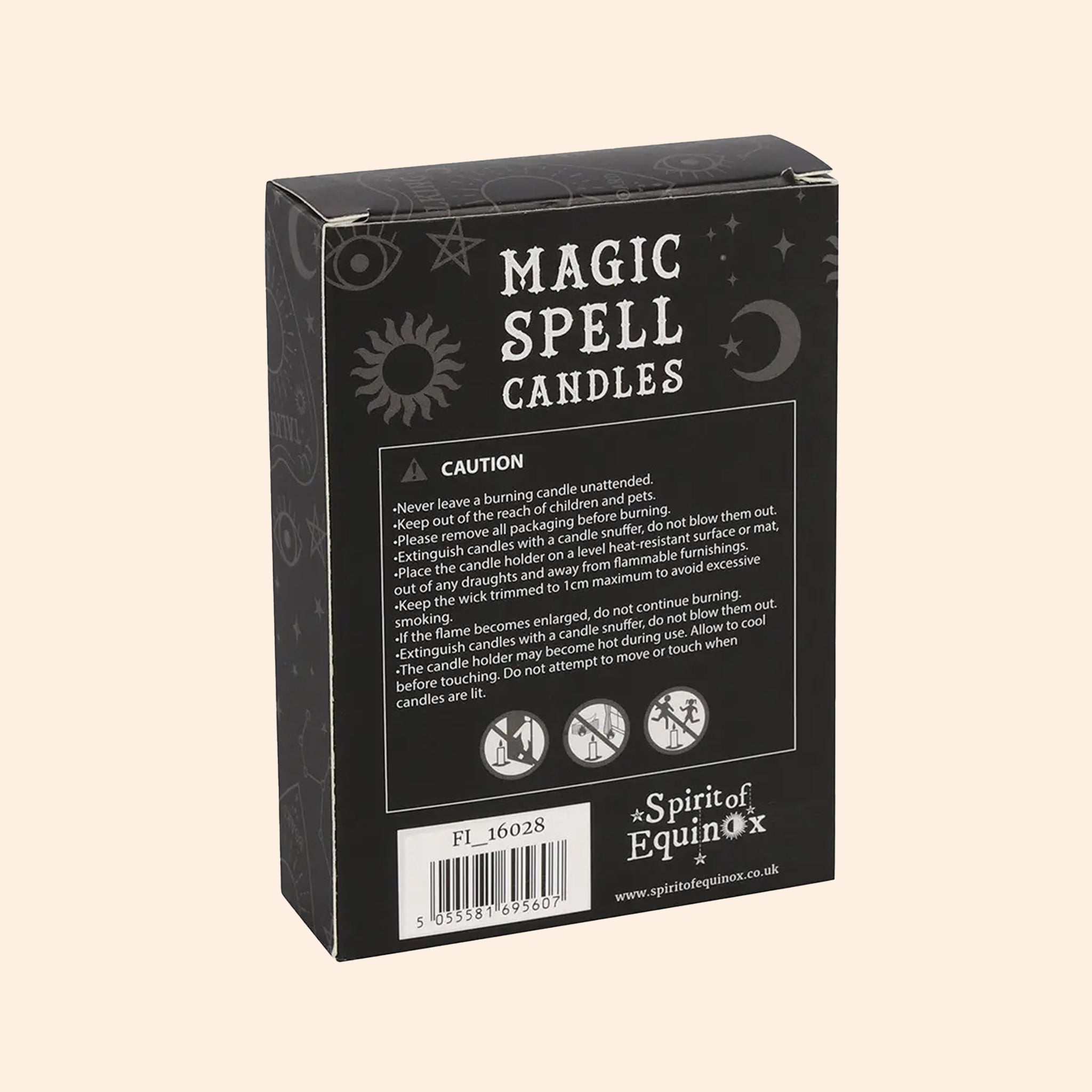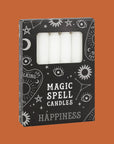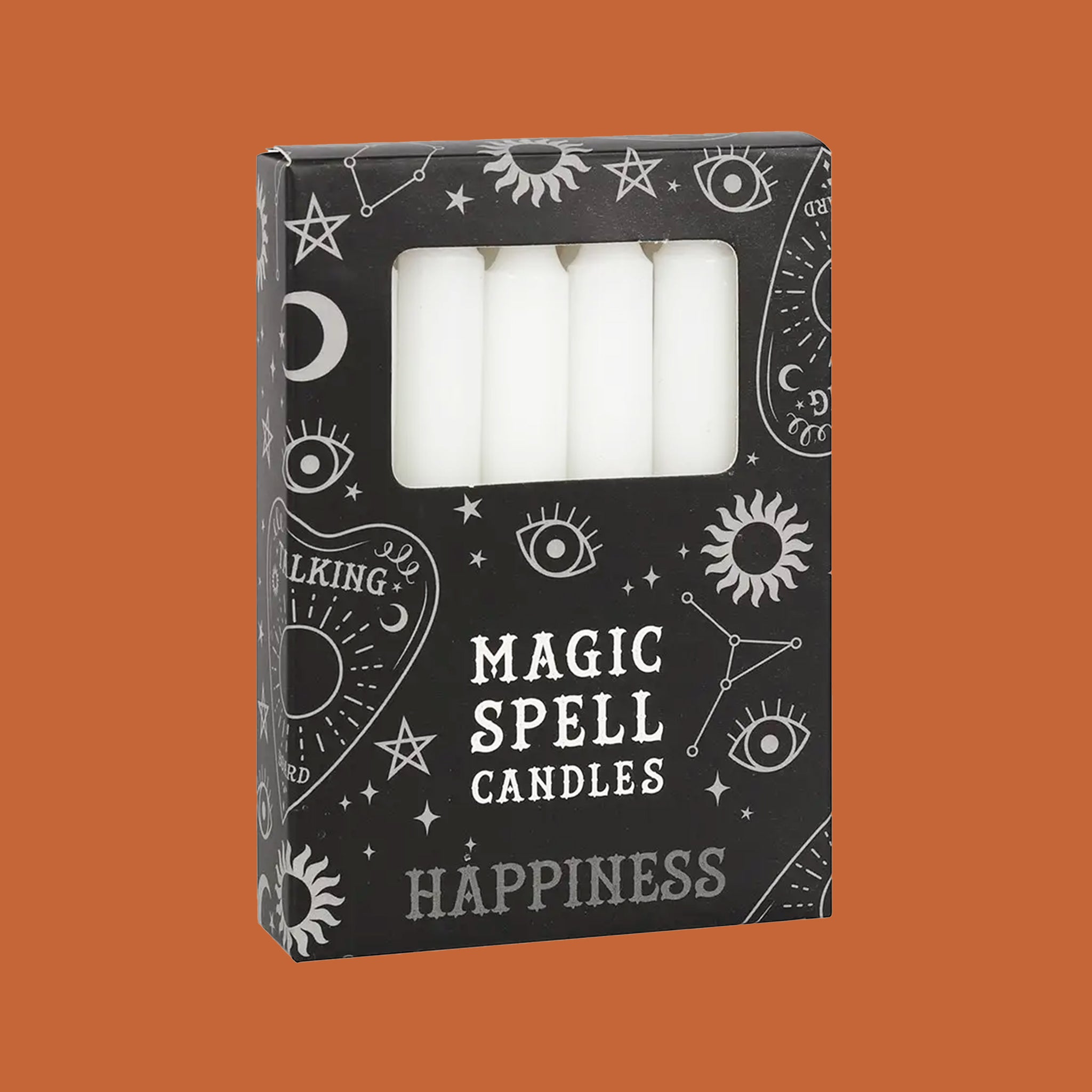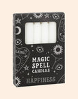 Manifest happiness with the adorable Magic Spell Candle Set including 12 white taper candles in a spooky black and silver box.