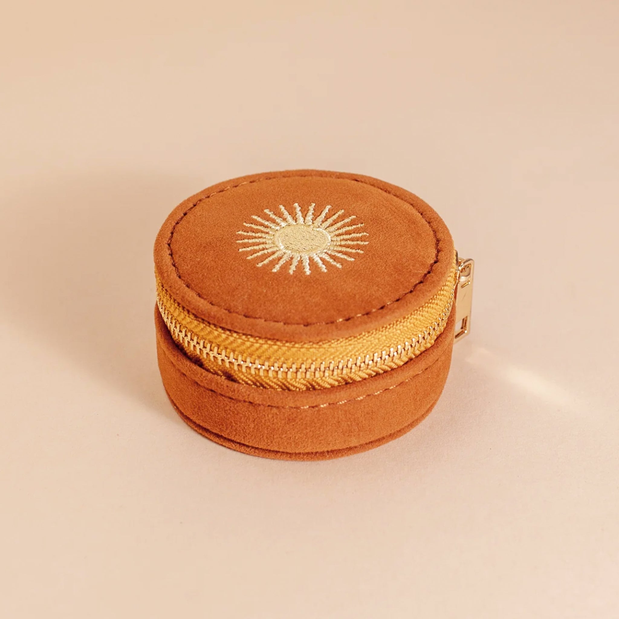 Keep your jewelry safe with Cai + Jo's mini travel jewelry cases! Embroidered with a radiant sun, this burnt orange case make for the perfect way to take your jewelry on a weekend trip without it getting tangled or lost in your bag!