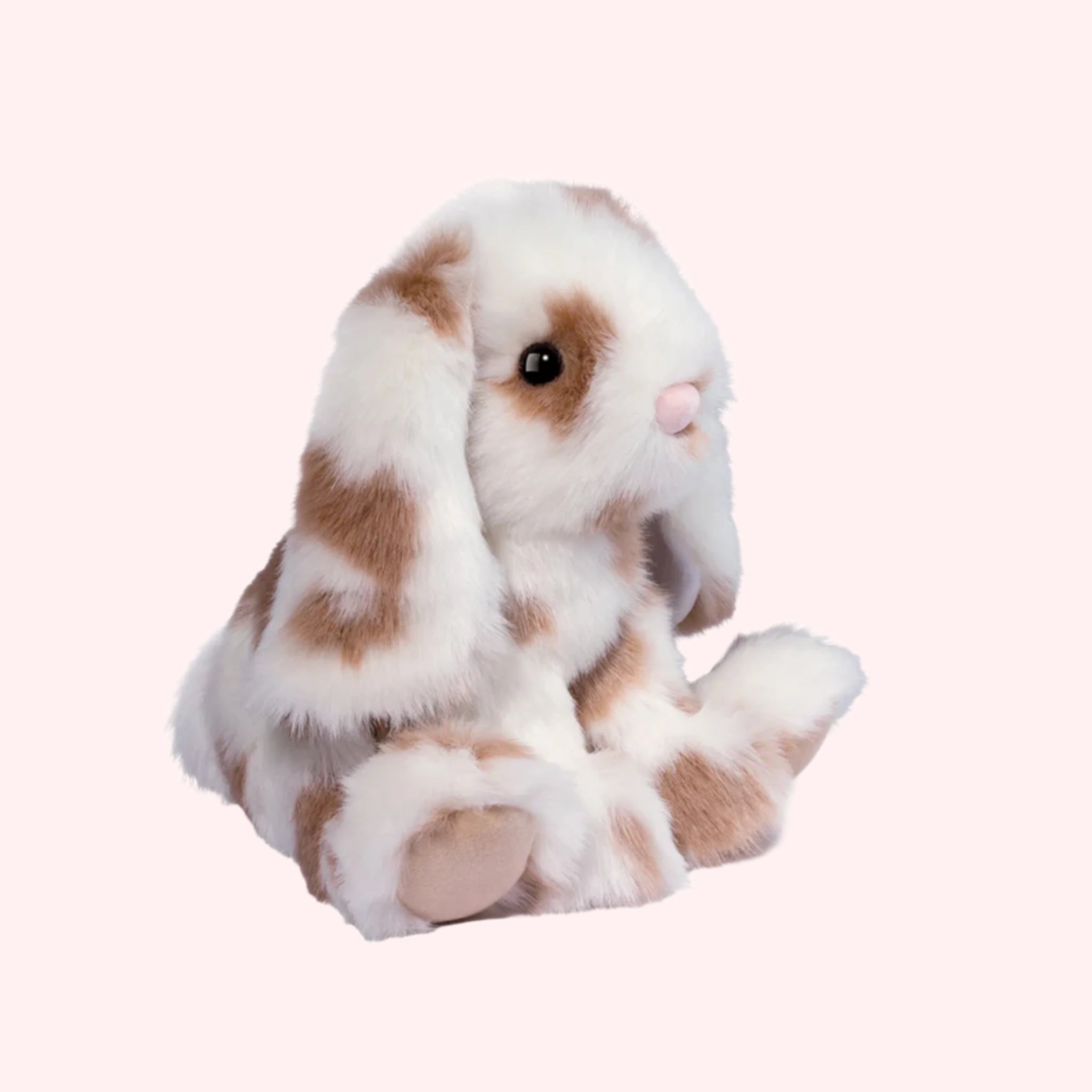 Introducing the Spotted Muddy Bunny. This cuddly stuffed animal features a charming mix of white and brown spots. With its soft fur, this bunny is sure to be your new favorite cuddle buddy.