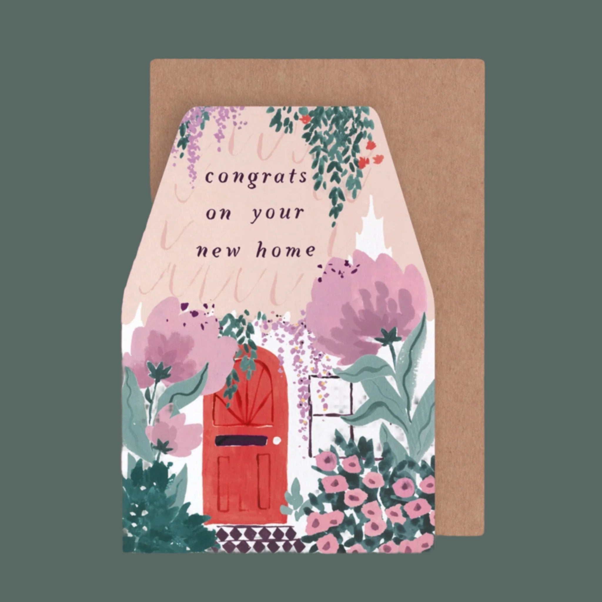 Celebrate a fresh start with this playful New House Card! Featuring lush green ivy draping over a cozy cottage rooftop and giant blooming peonies framing a bold red arched door, it’s a charming way to say “congrats on your new home.” The hand-lettered message adds a personal touch, making it the perfect card to brighten any housewarming gift and welcome new homeowners with style.
