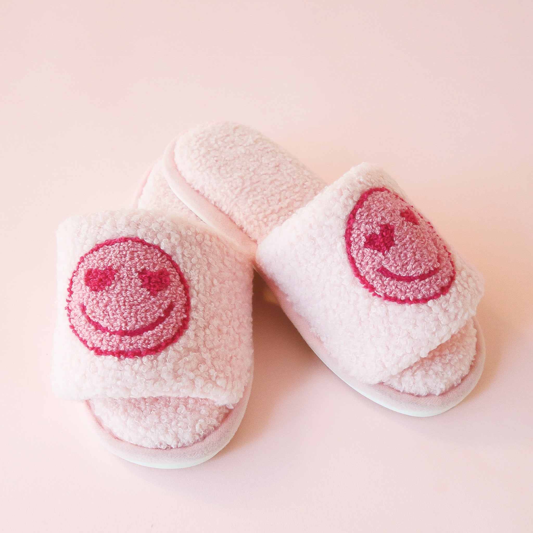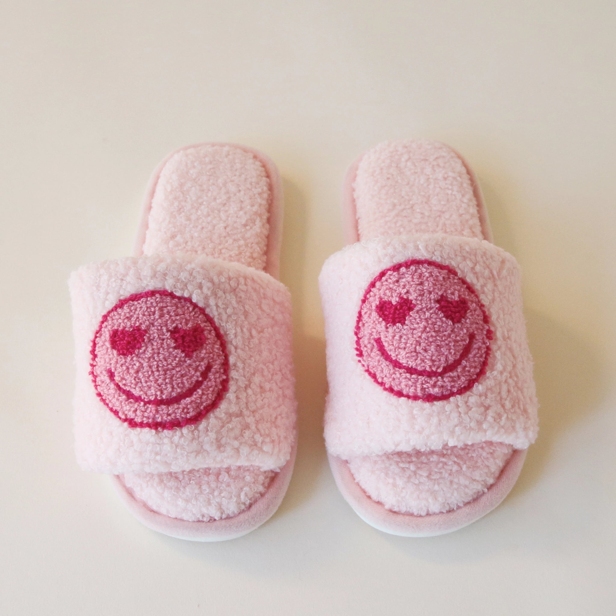 The Pink Happy Slide Slippers are perfect for getting cozy, lounging or running errands with their non-slip rubber bottoms featuring a fun heart eyes smiley face graphic and plush sole.
