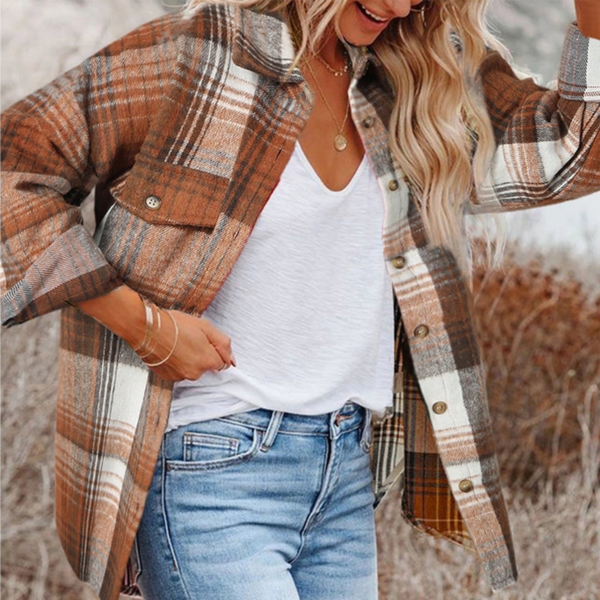 Meet the Plaid Flannel Flap Pocket Shacked in the shade golden flame! This stylish shacket features an allover brown and ivory plaid print, a collared neckline, dropped shoulders, long sleeves, chest pockets, and tortoise button front closure. Crafted from woven flannel fabric, it provides a comfortable and long-lasting wear. Wear this effortless layer over crop tops or basic dresses for an effortlessly cool look.