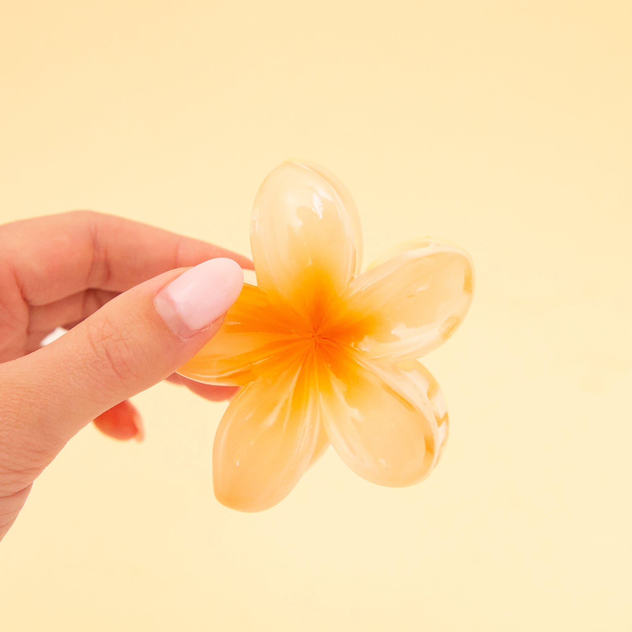 Elevate your hairstyle with the Plumeria Hair Clip in Orange! This vibrant and tropical accessory adds a colorful touch of summer to any look. Stand out with confidence and a pop of color.