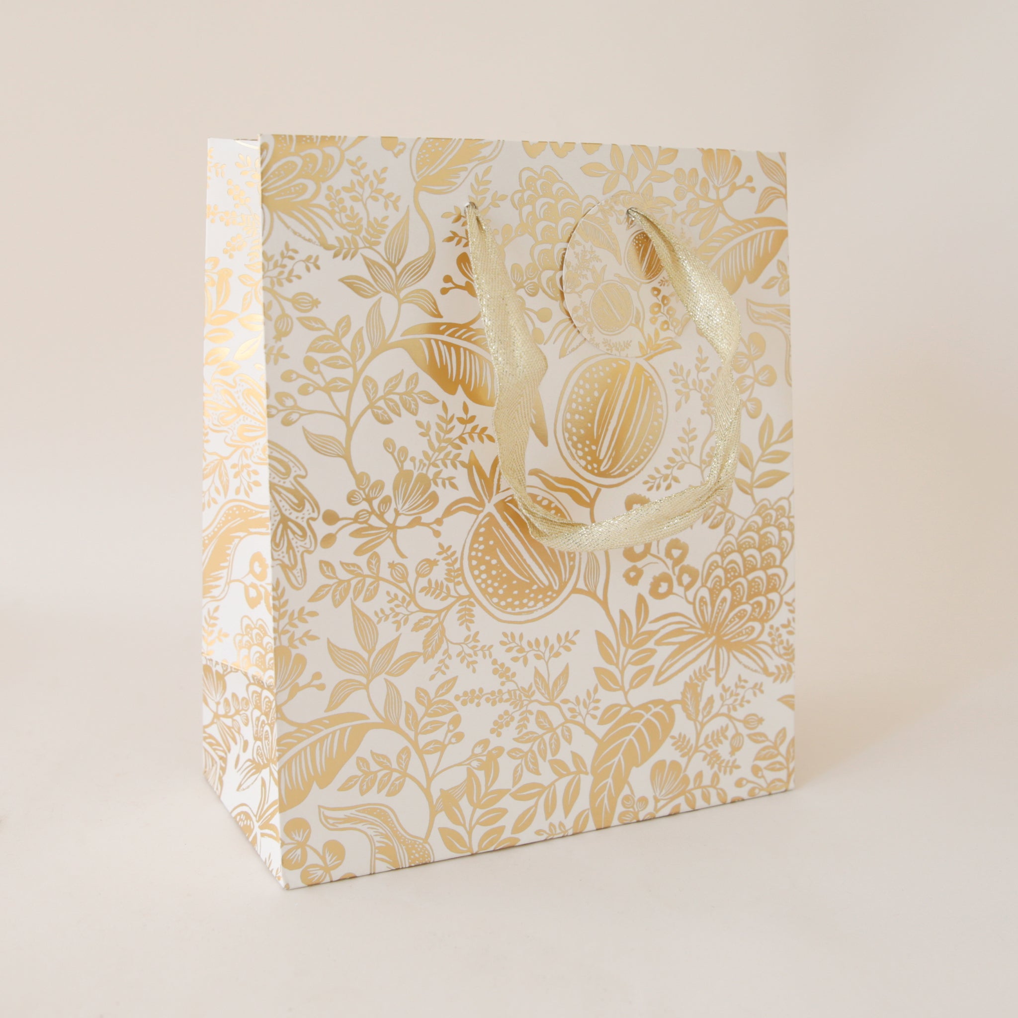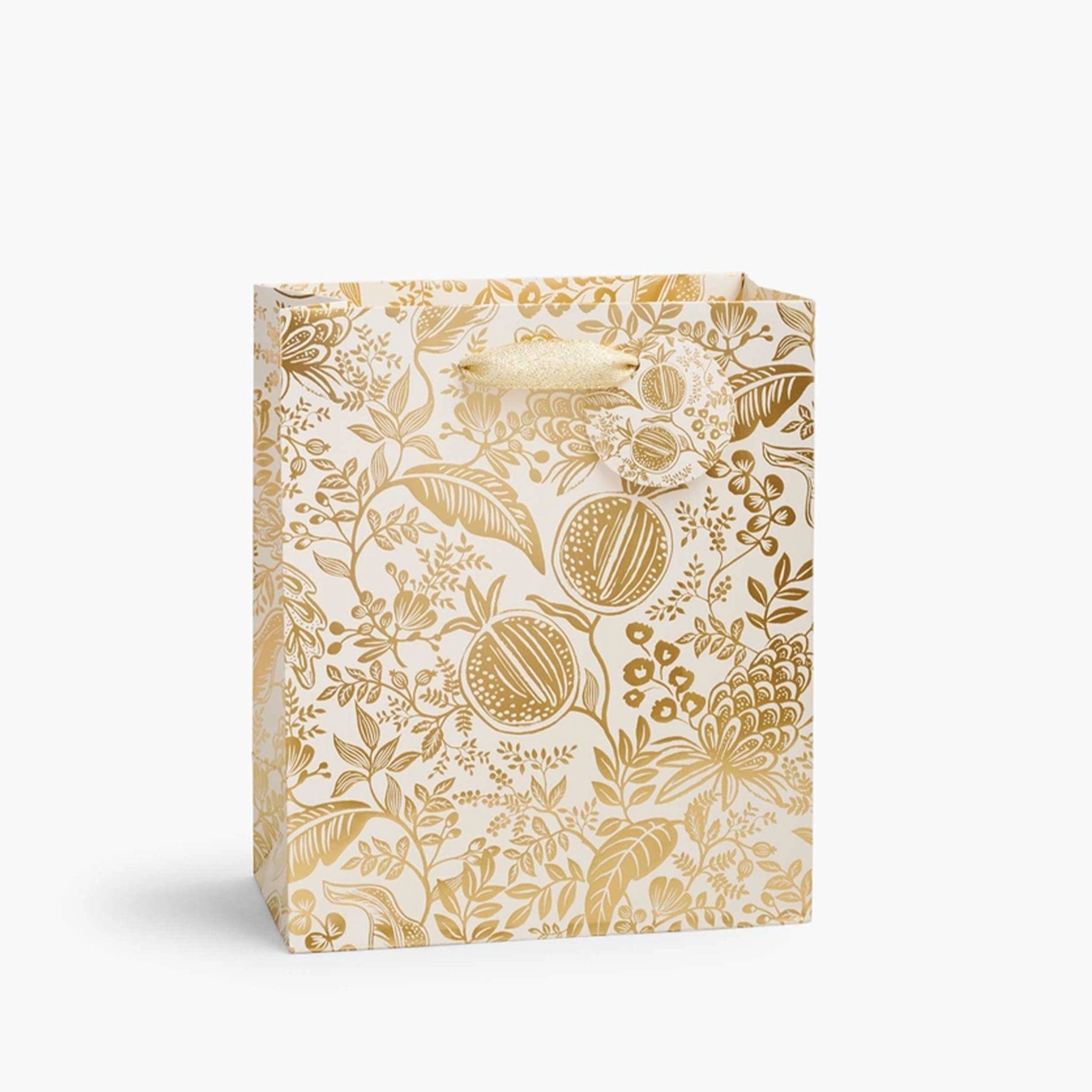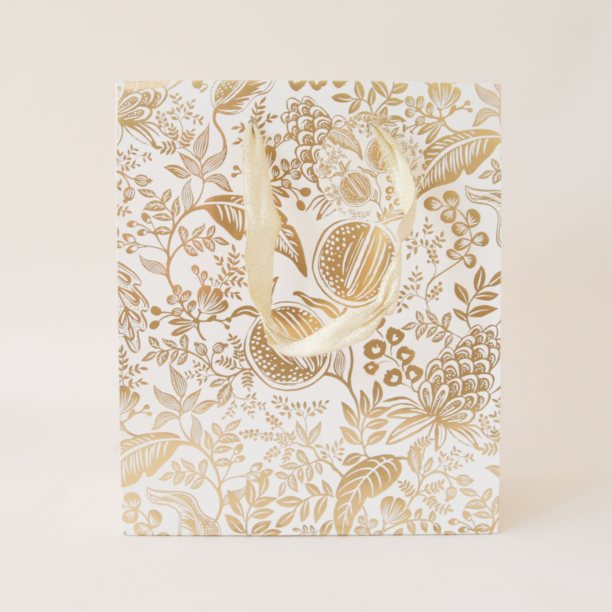 Giving gets even more special with this stunning gift bag, which feature charming extras like an all-over gold foil design, metallic ribbon handles, and a coordinating “To” and “From” tag.