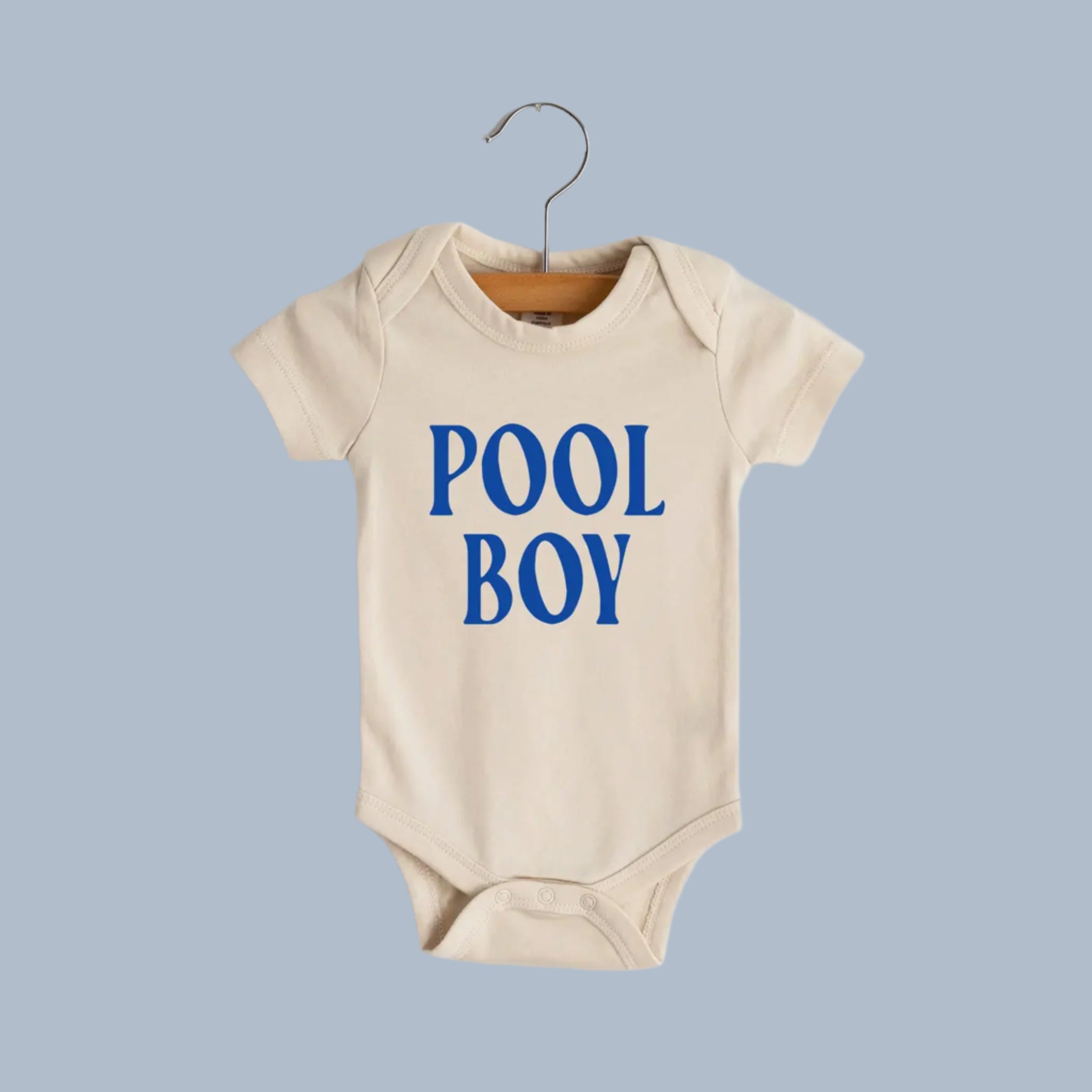 Dress your little water lover in this super-soft, 100% organic cotton onesie, perfect for poolside fun. Featuring playful blue typography on a creamy background, it’s designed with love. This pun-filled outfit is a charming way to celebrate your little pool boy’s splashy adventures.
