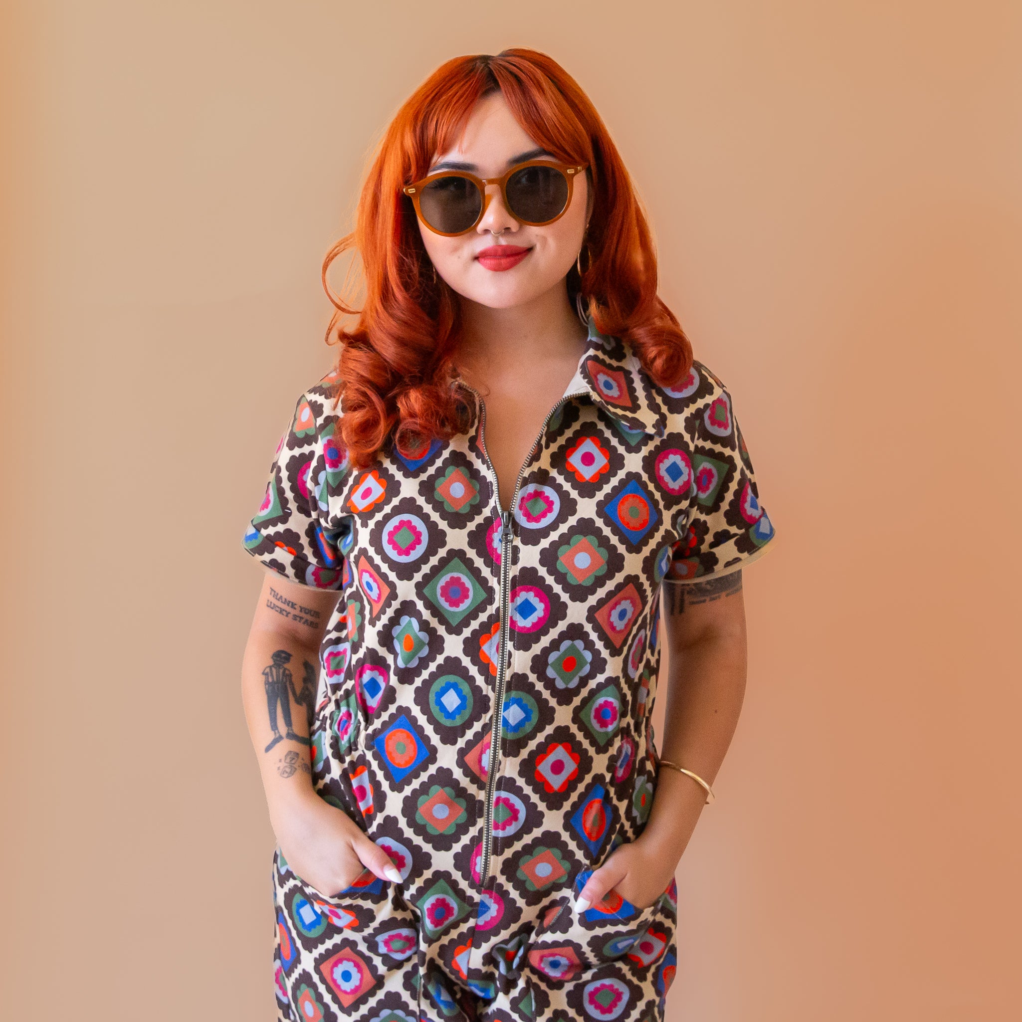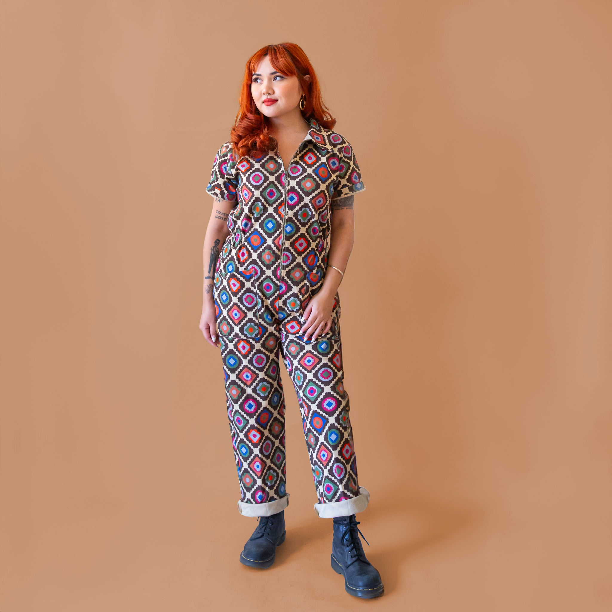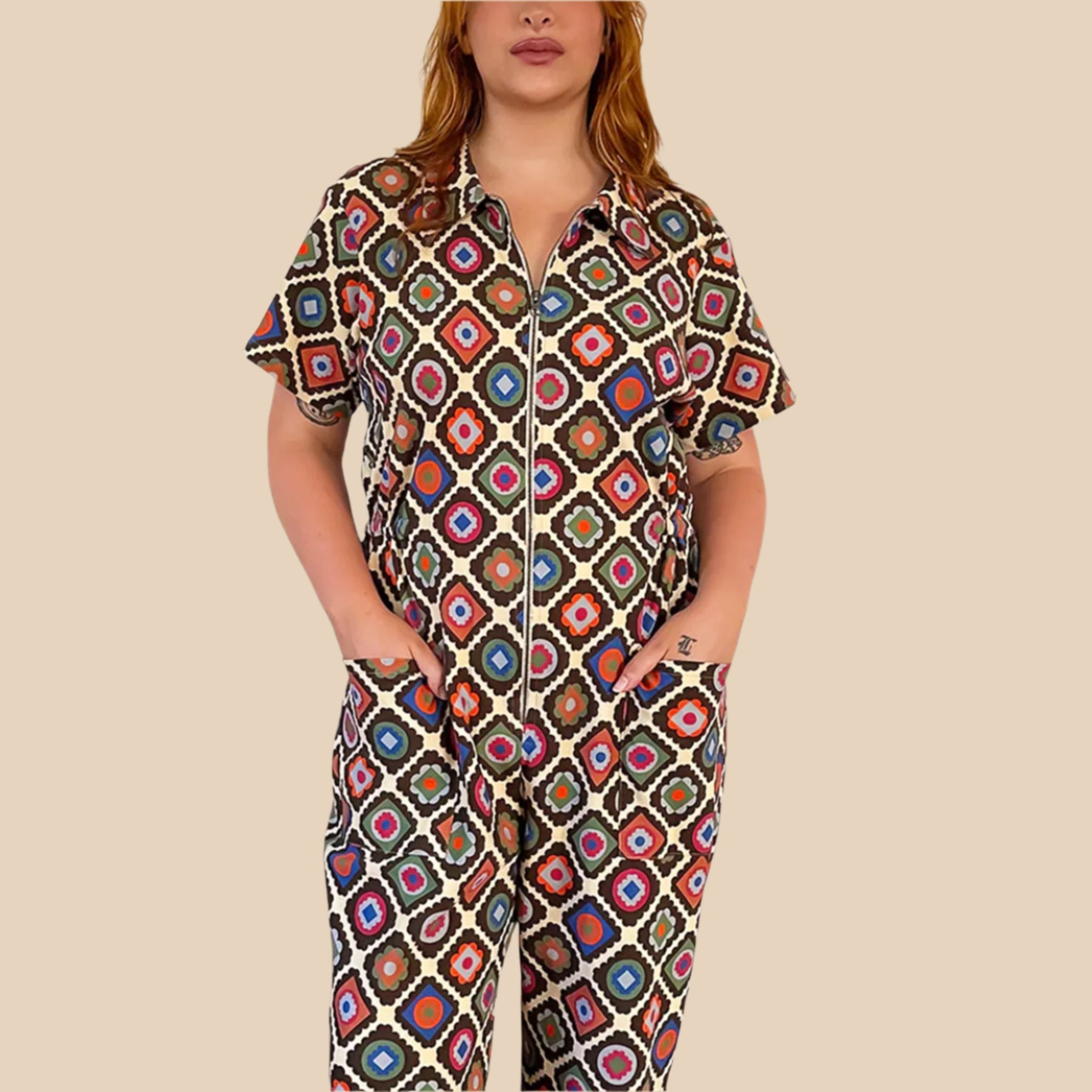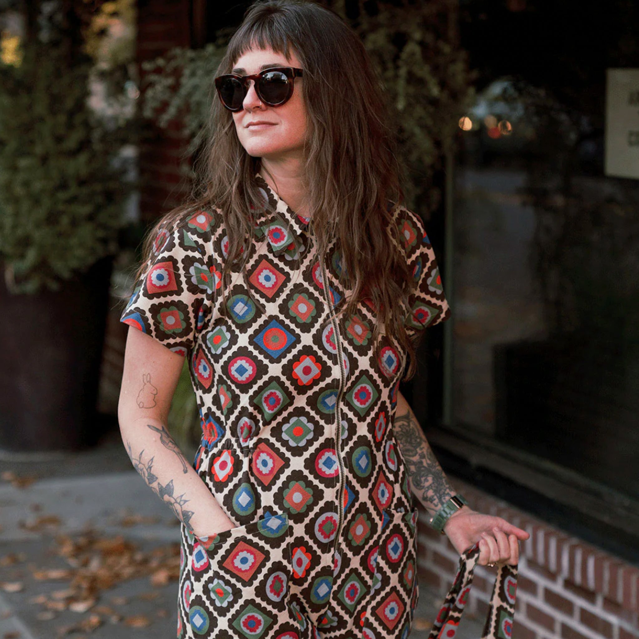 Noble's signature Utility Suit is the one-and-done outfit you will want to make your new uniform and now in the shade Granny Print, a multicolored 70's inspired pattern. Made in Peru with their durable yet buttery soft GOTS-certified organic Pima cotton canvas and features a chunky metal zipper, cropped leg, and cinched waist.