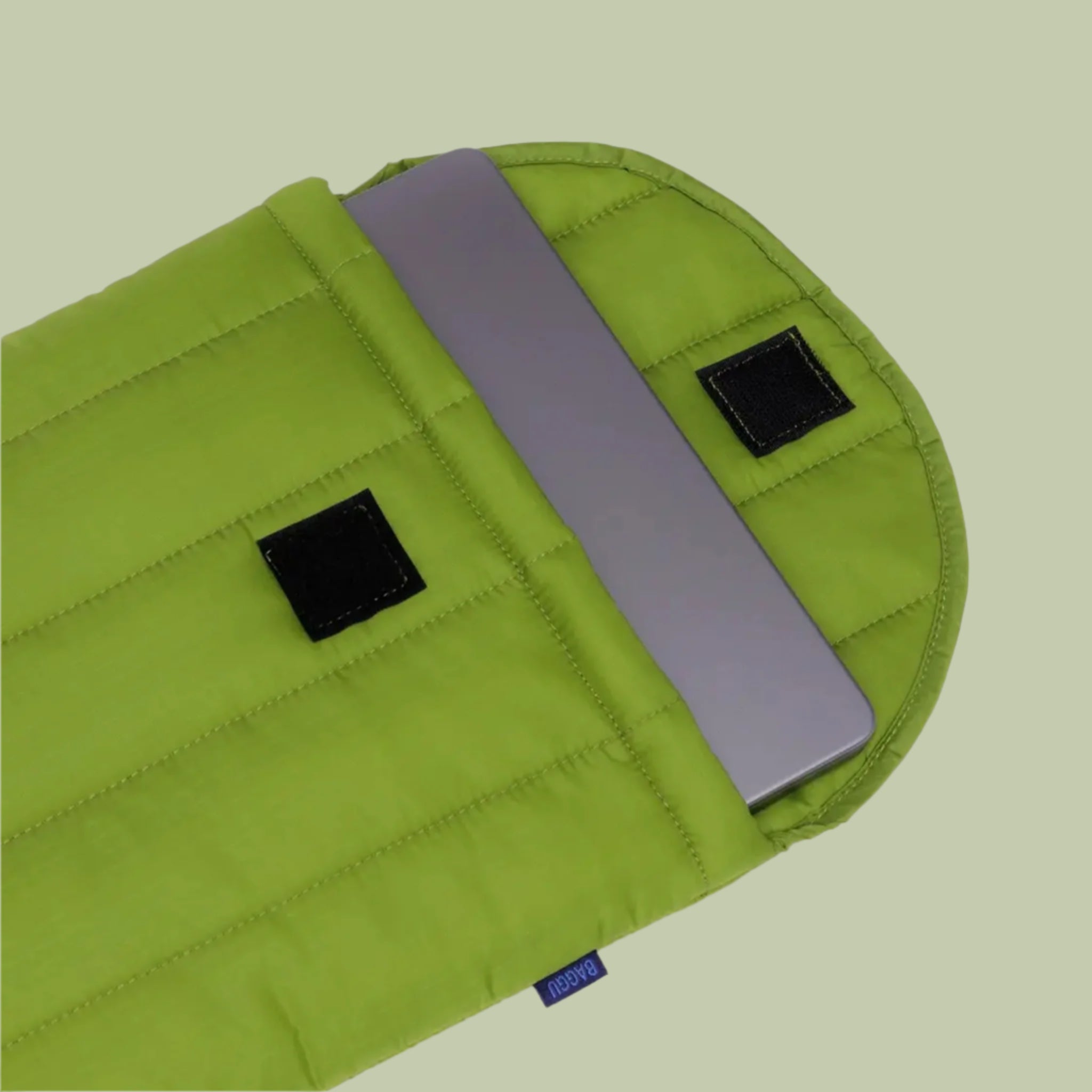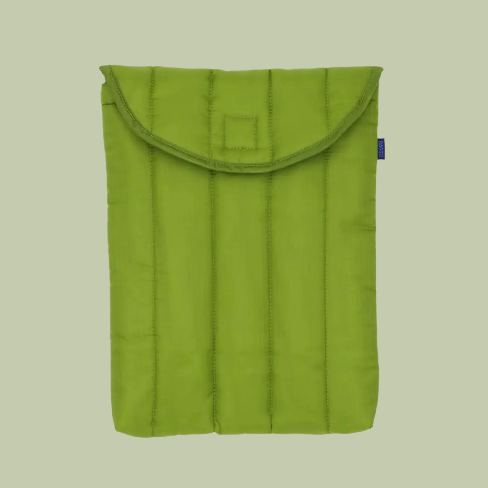 Give your laptop a cozy home with Baggu's Puffy Laptop Sleeve in Green Juice. Quilted and cushioned, it snugly fits most 14" laptops and tablets, keeping them safe and comfy on every adventure. Stylish protection has never been this fun!