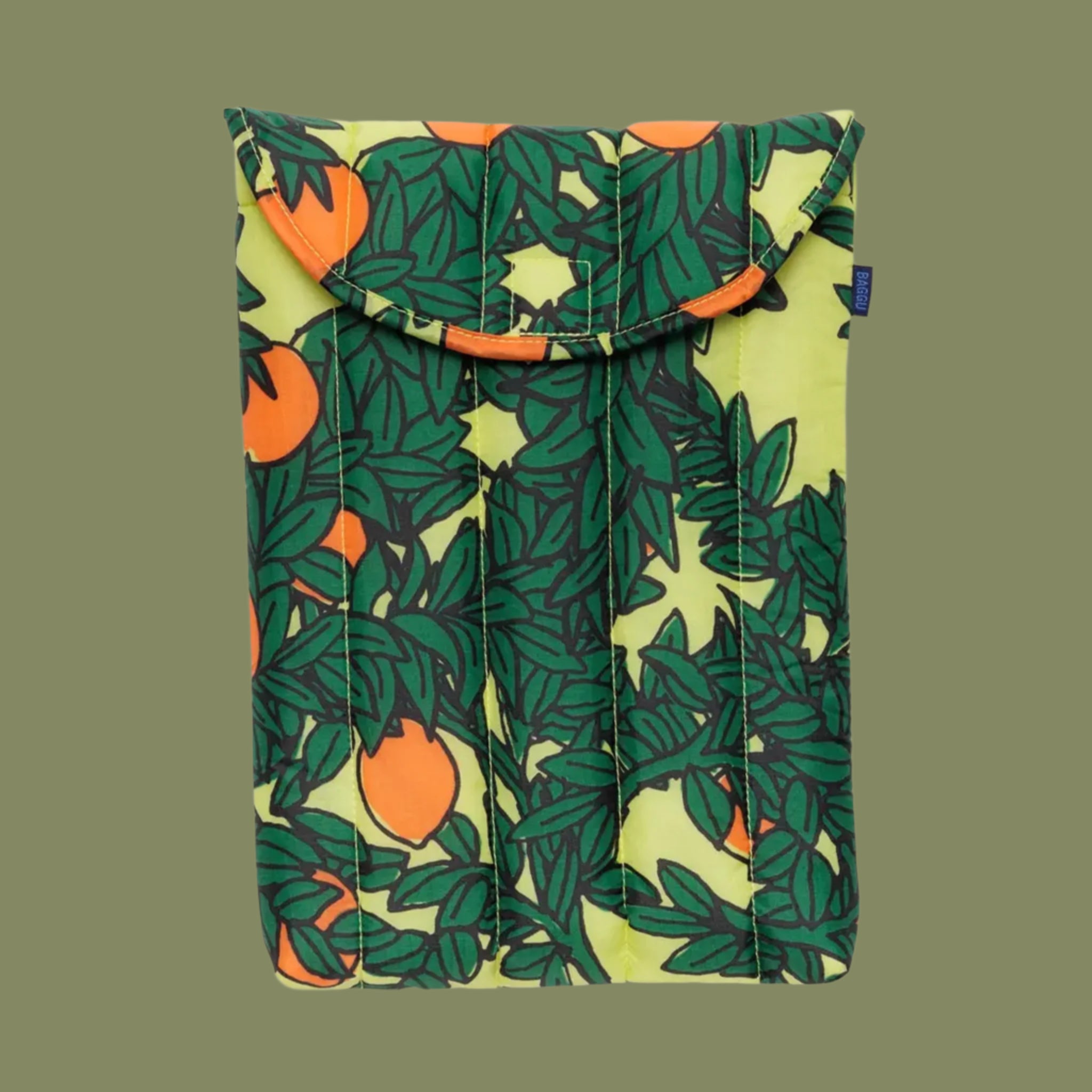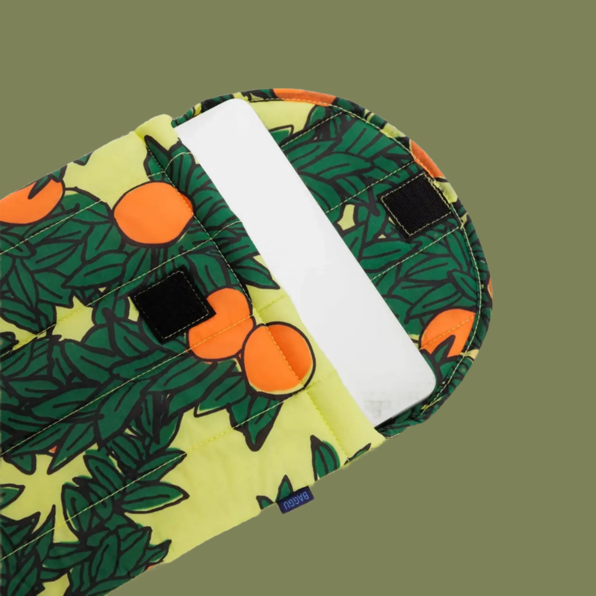 Give your laptop a snug little home! Baggu's puffy laptop sleeve, quilted and cushioned, offers just the right amount of padding to keep most 14" laptops and tablets comfy on the go.