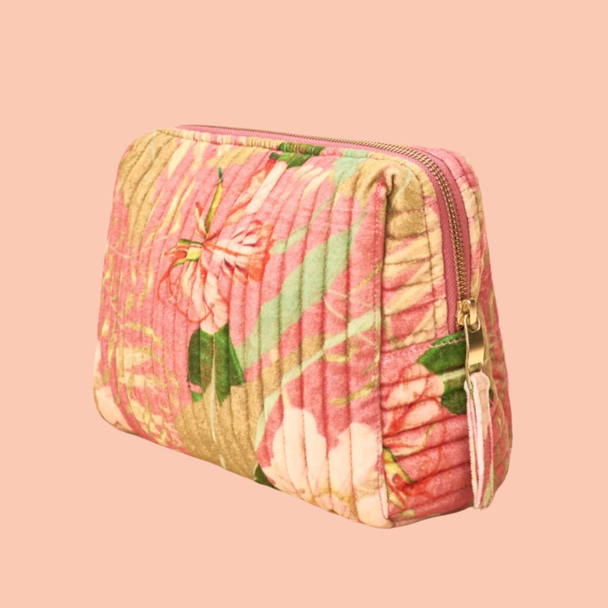 Step into a world of luxury with the Quilted Tropical Pouch in Candy, designed to channel your inner Hollywood starlet! Featuring vibrant jungle greenery and stunning florals, this wash bag will add a touch of high-end design to your everyday routine. Keep your luggage or gym bag organized and stylish with this must-have accessory.