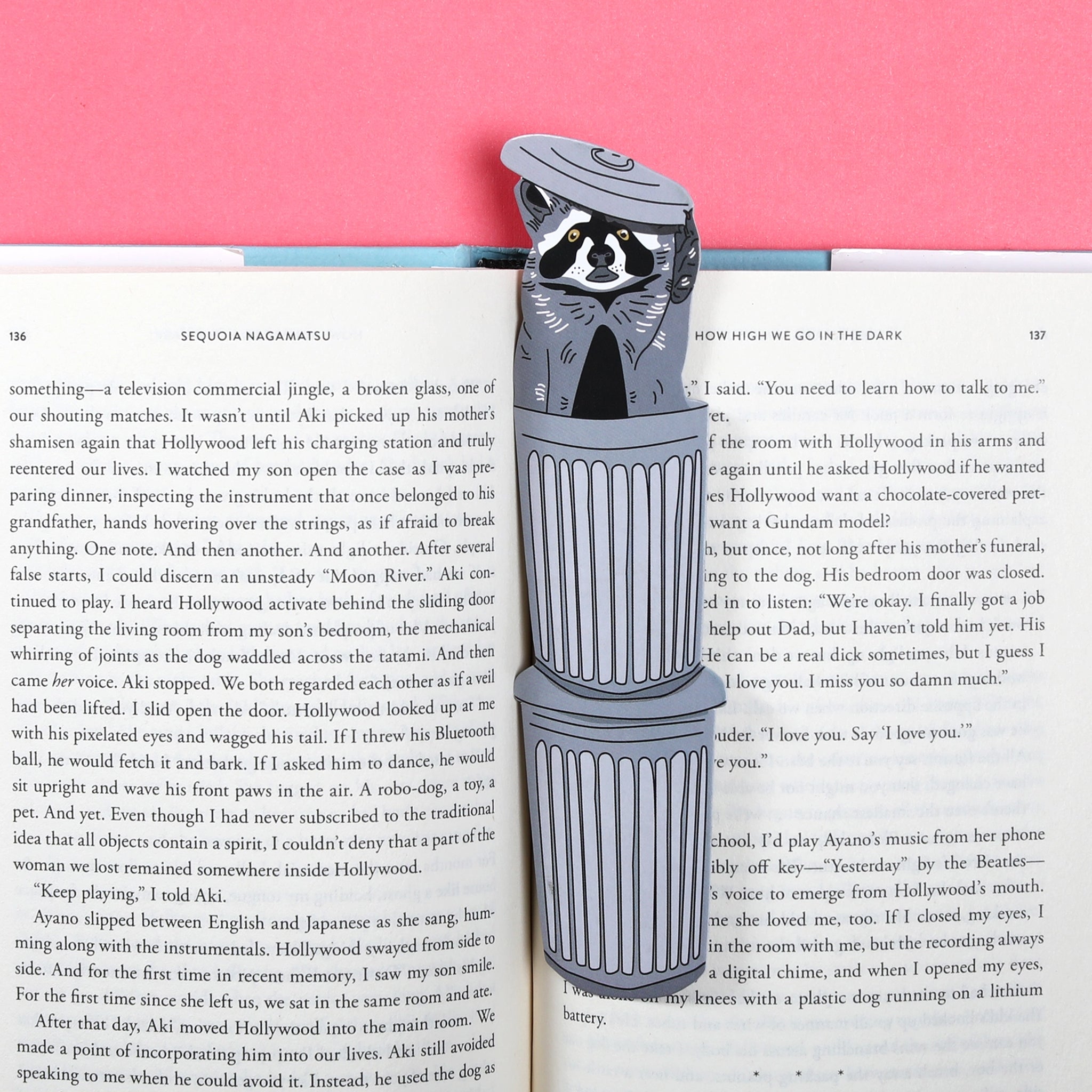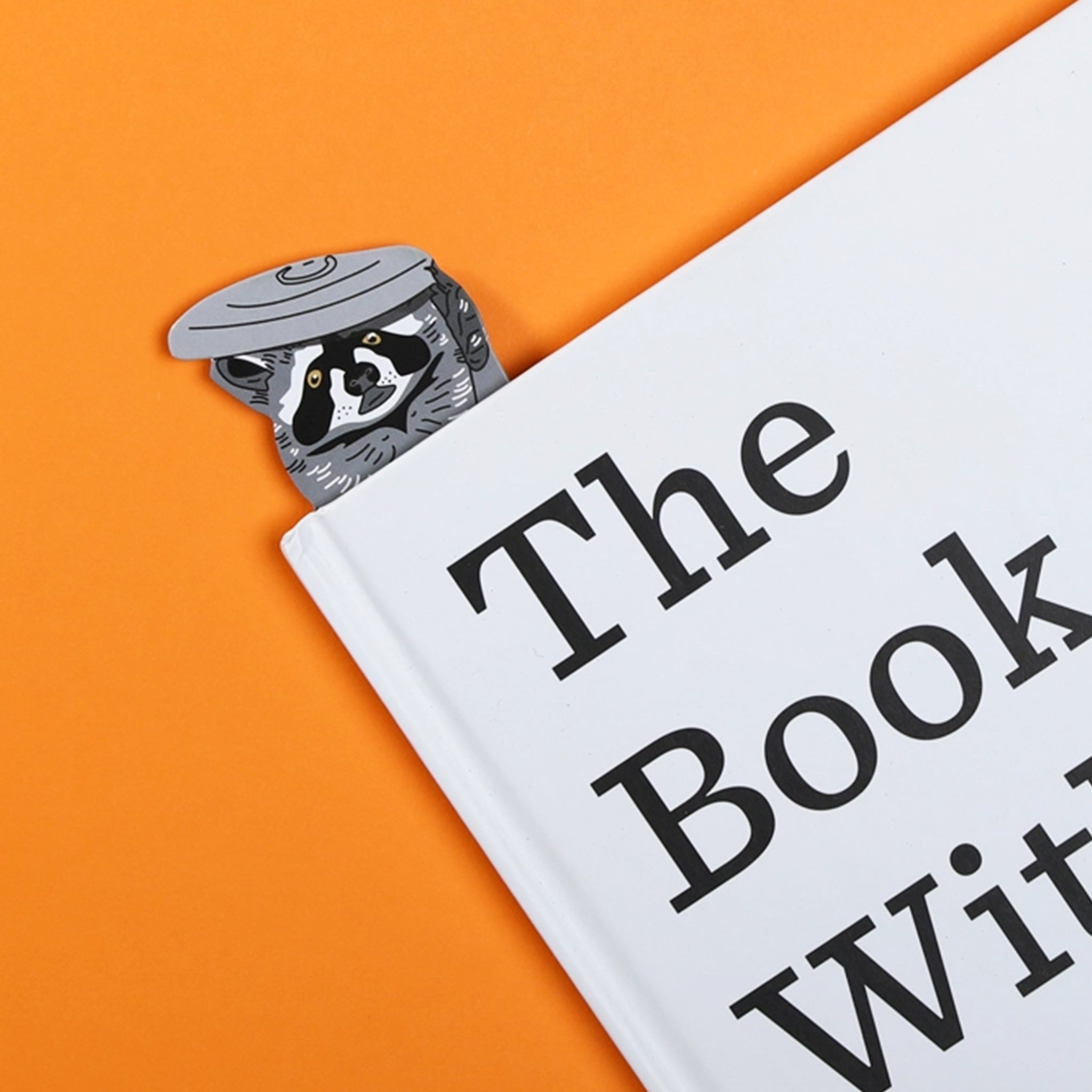 It's a raccoon, in a trash can, in a book! Bookmarks are underrated... until you have a trash panda sticking out of your very serious non fiction book.