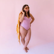 Introducing the Rails Surf Suit in the shade Mini Rosa, featuring a lilac purple color. You've never experienced a surf suit like the Rails. Cutout sides, a zippered front that can be worn in the front or in the back (only zipping to expose the perfect amount of cleavage without risking a slip), cheeky coverage, and full-length sleeves.