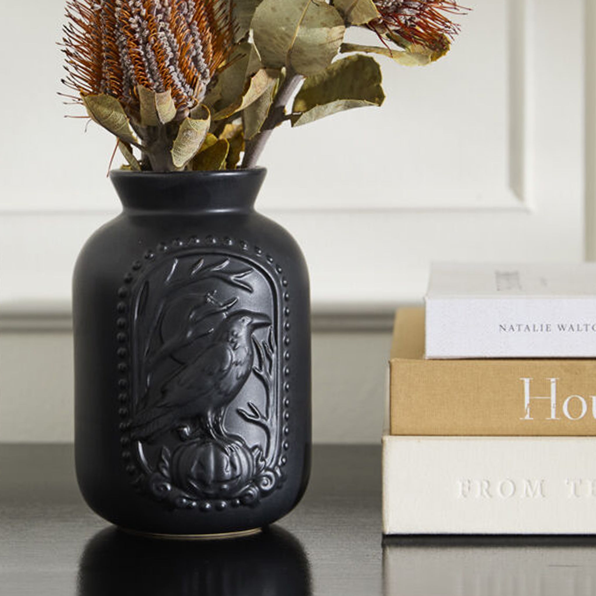 Add a touch of spooky charm to your Halloween decor with this black raven ceramic vase. Its sleek, mysterious design makes it the perfect centerpiece for the season, whether filled with autumn blooms or standing alone as a striking accent.