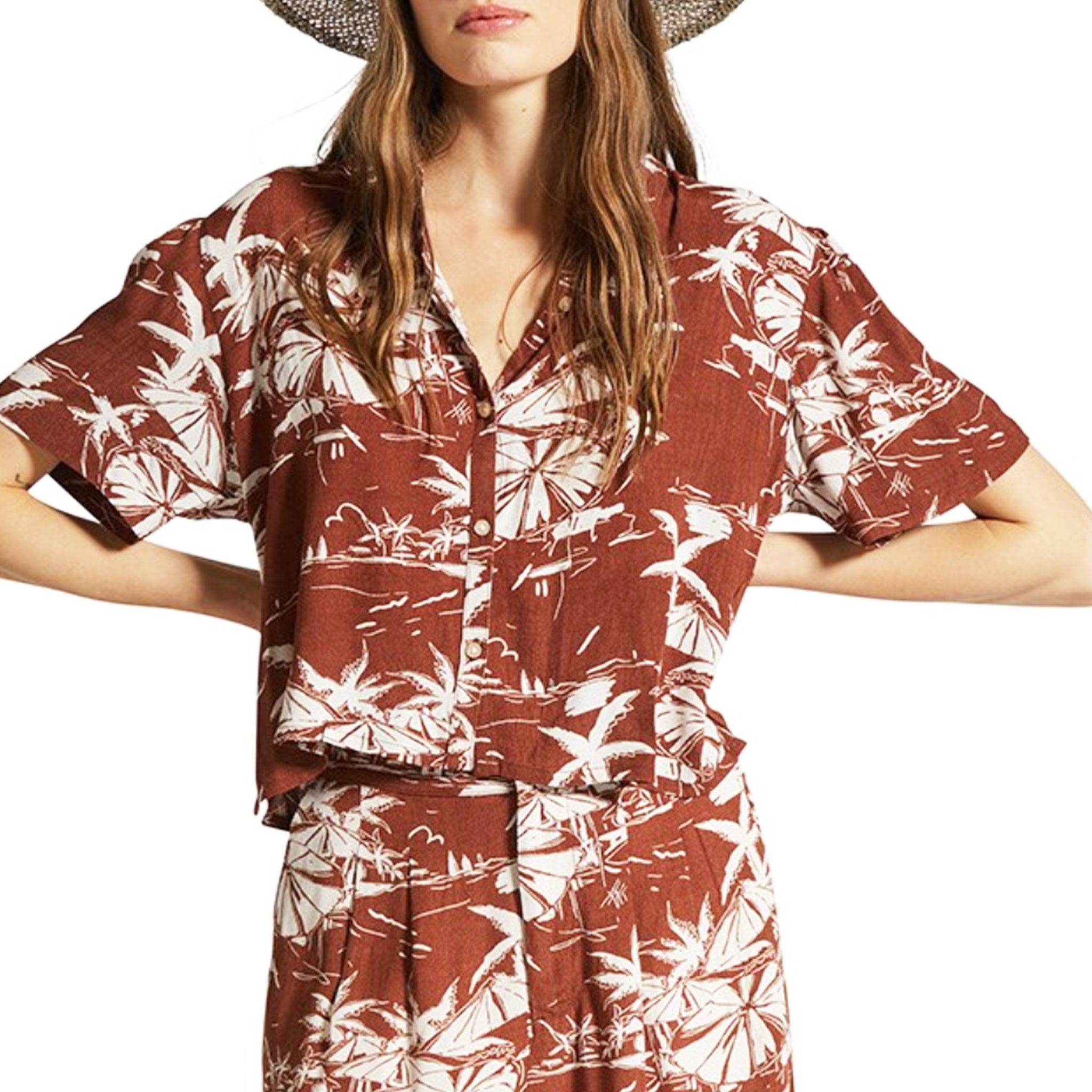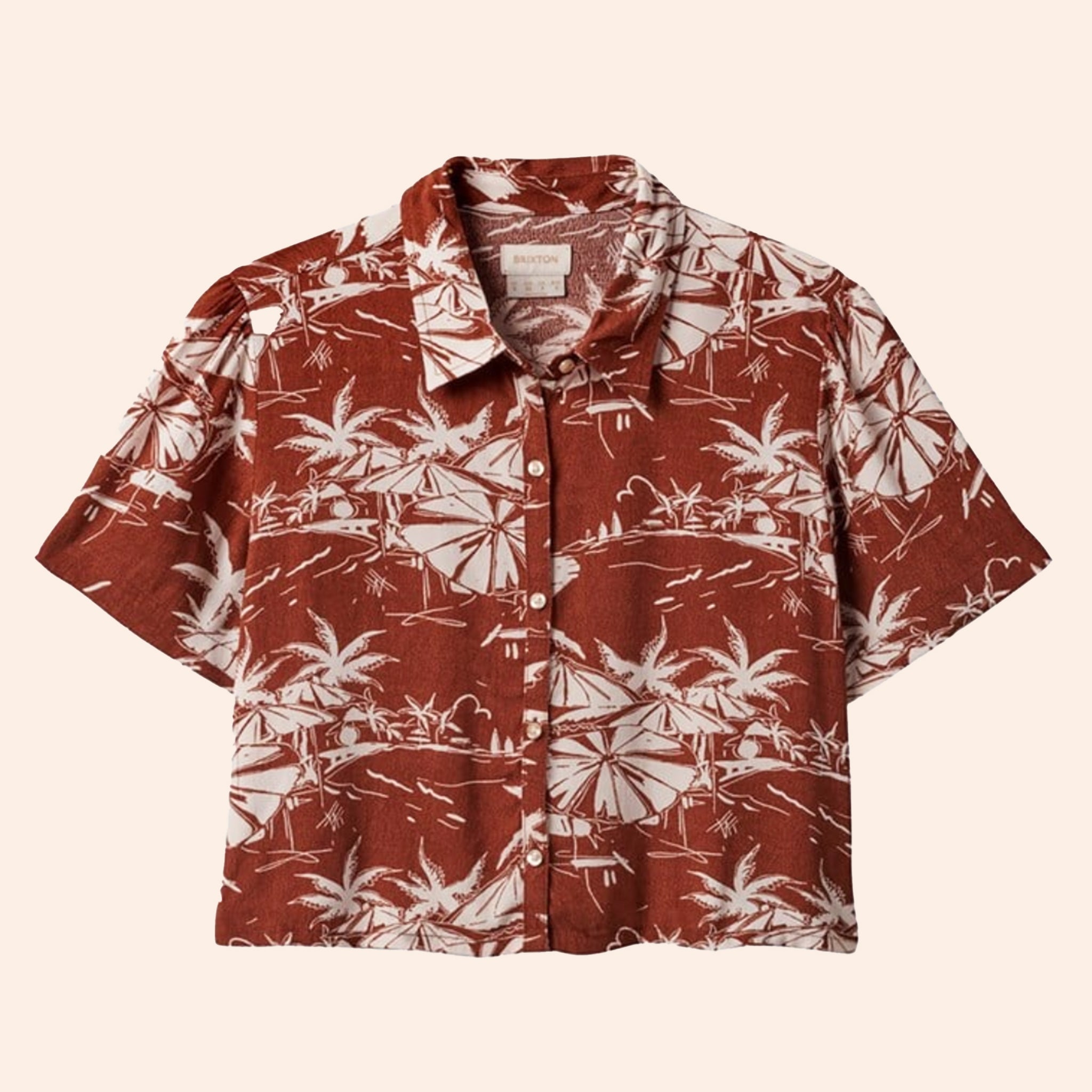 Take leisure to the max with the vacay certified Brixton Riviera Short-Sleeve Woven Shirt featuring a rust colored short sleeve button up with a fun ivory tropical print.