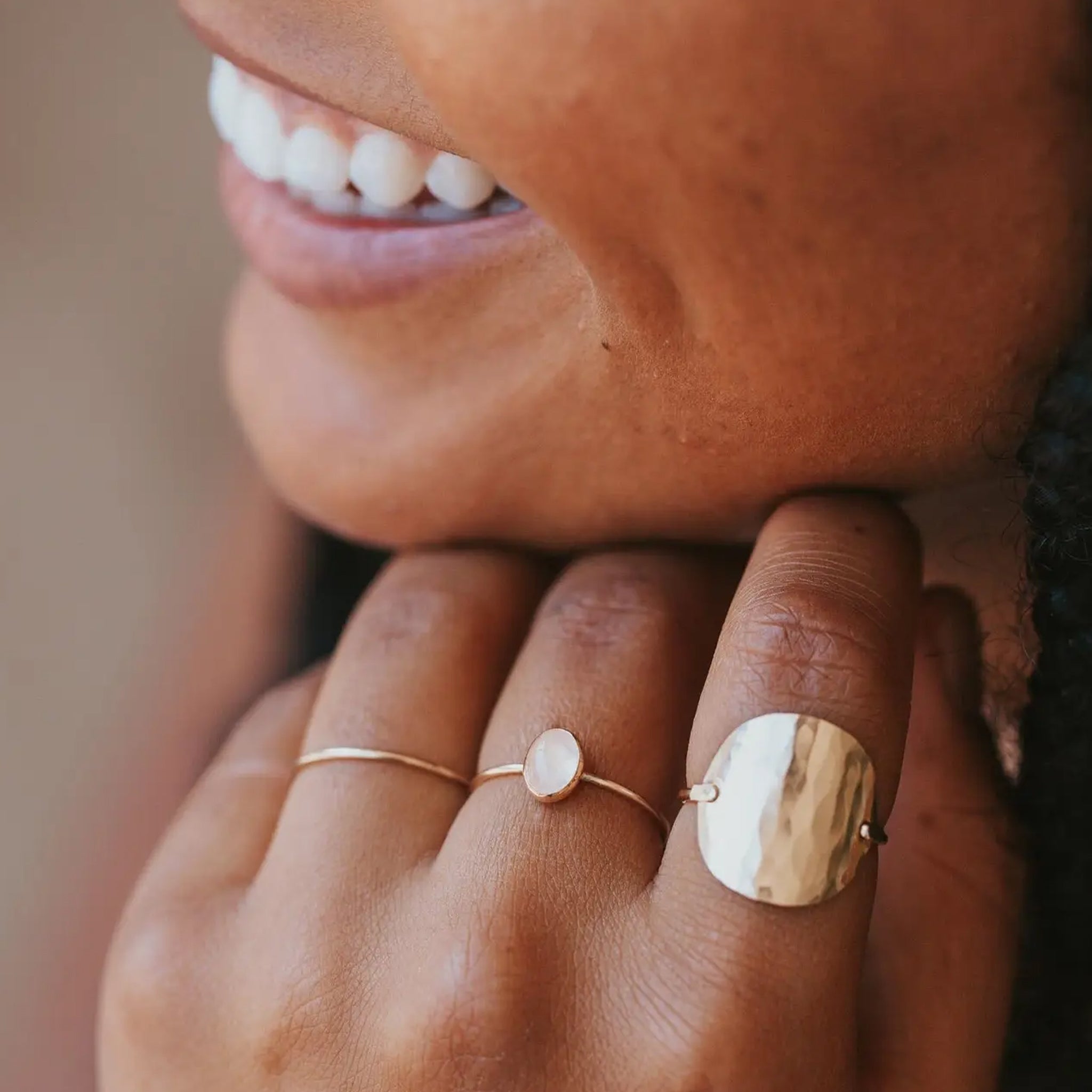The Rosie Ring is made with a stunning Rose Quartz stone. Known as the crystal of unconditional love, it is also said to boost feelings of self-love and foster loving relationships with others. It’s a crystal connected to the heart chakra which colors our life with compassion, love and beauty.