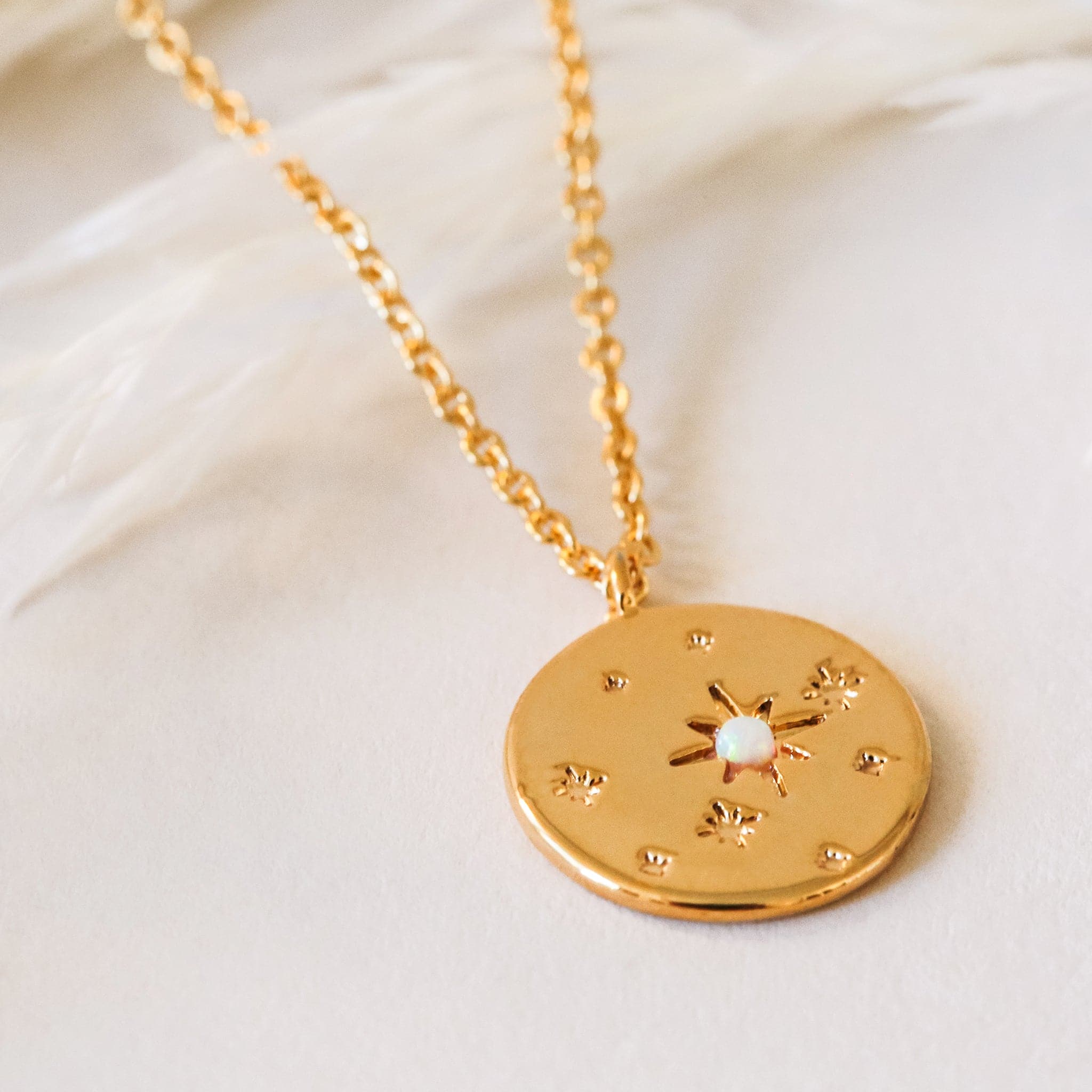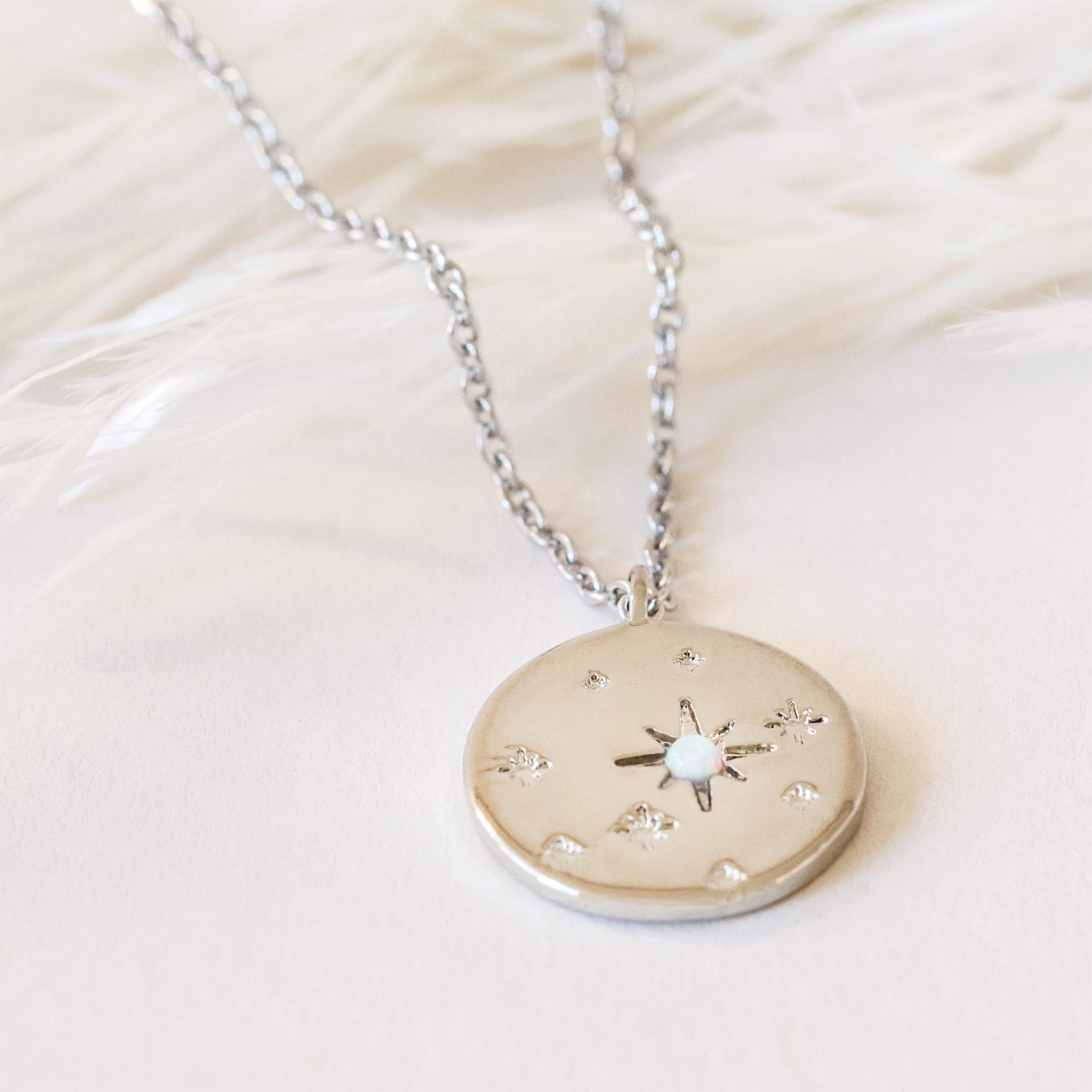 Add a touch of starry charm to your look with this Round Star Opal Necklace. The small synthetic opal adds a unique shine to the whimsical star design on this circle pendant. Perfect for your jewelry collection or as a thoughtful gift!