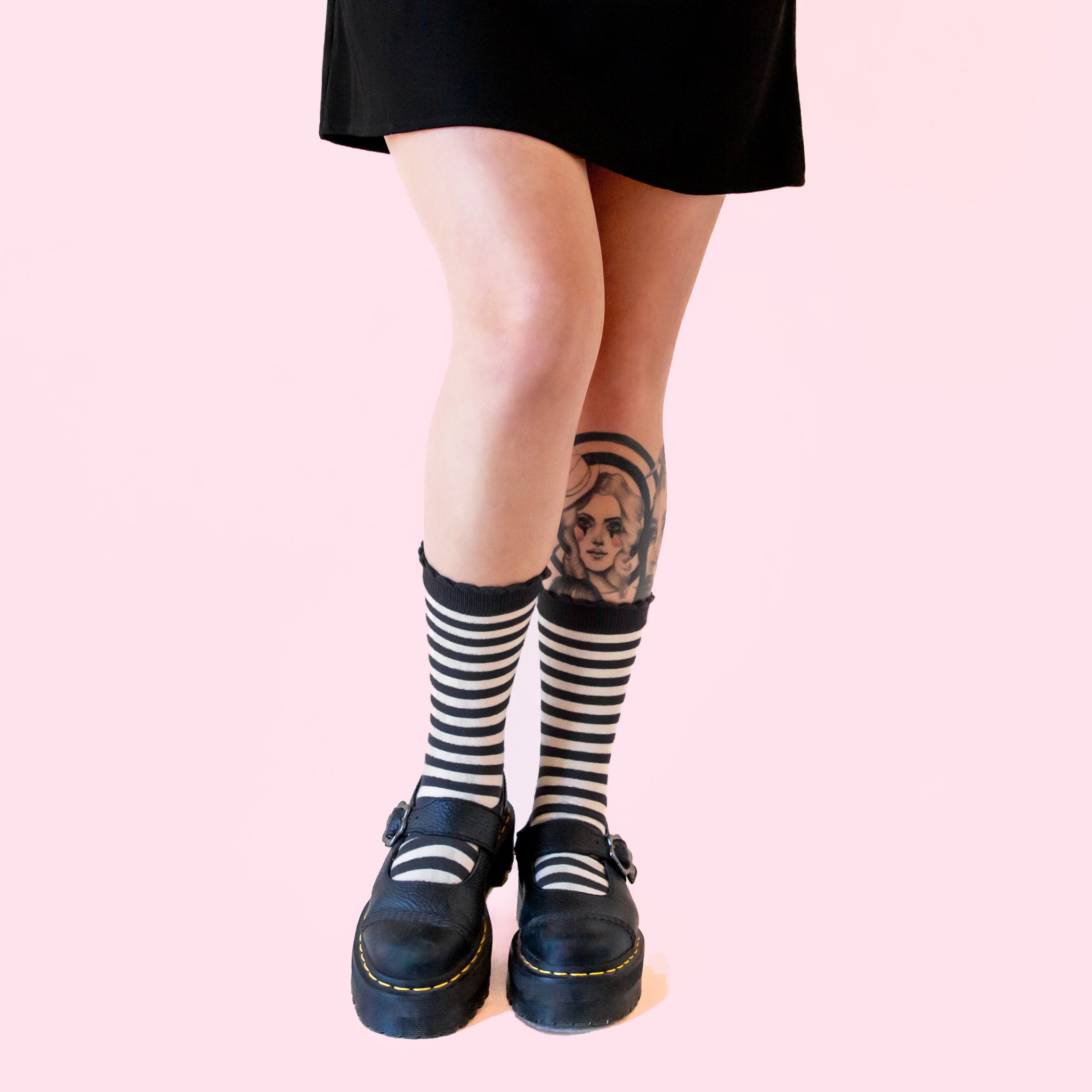 Step into spooky fun with these Black Striped Crew Socks, perfect for Halloween vibes. Featuring playful ruffle edges, they add a quirky twist to your outfit while keeping your feet cozy all day. Whether you're trick-or-treating or just embracing the season, these socks bring a festive touch with a comfortable fit.