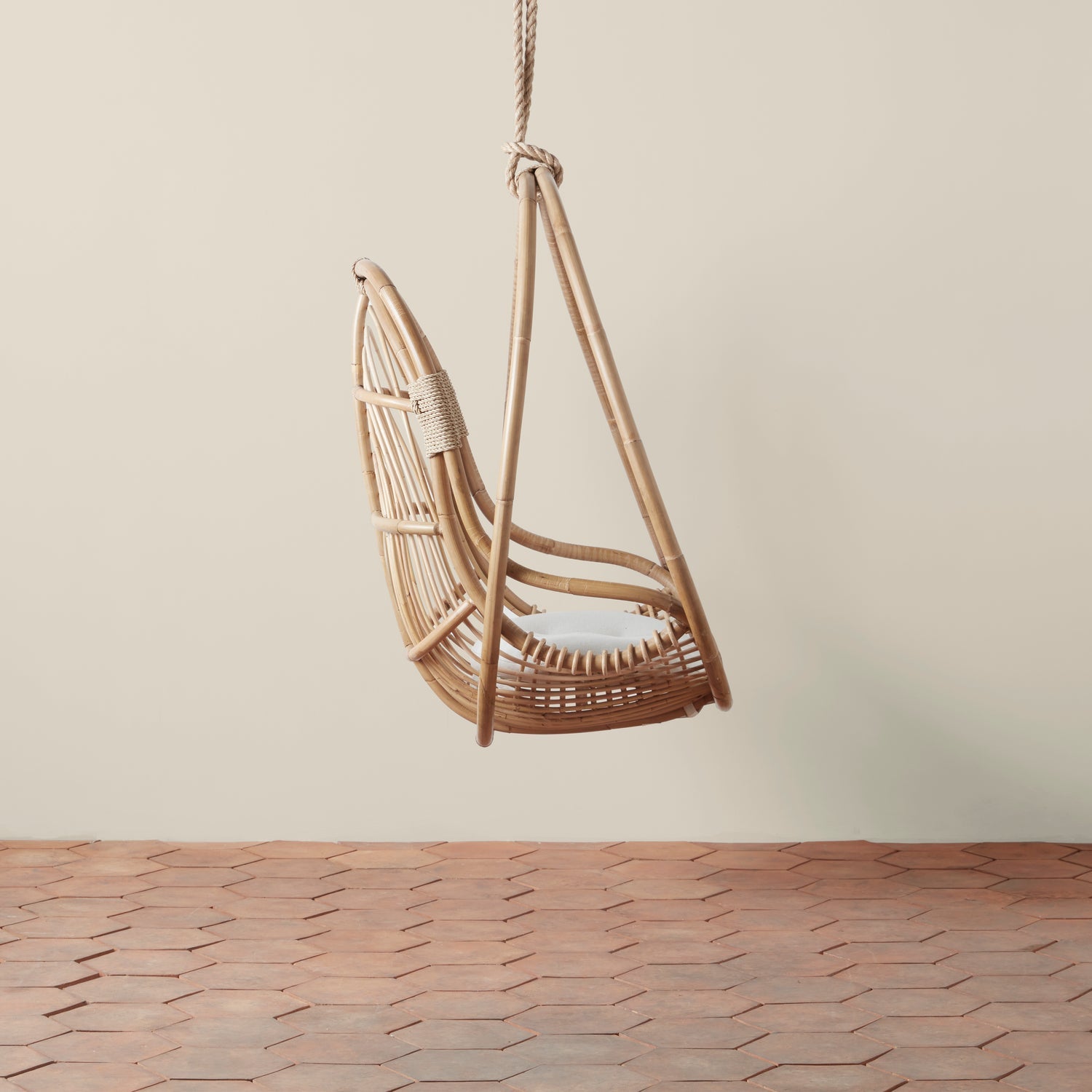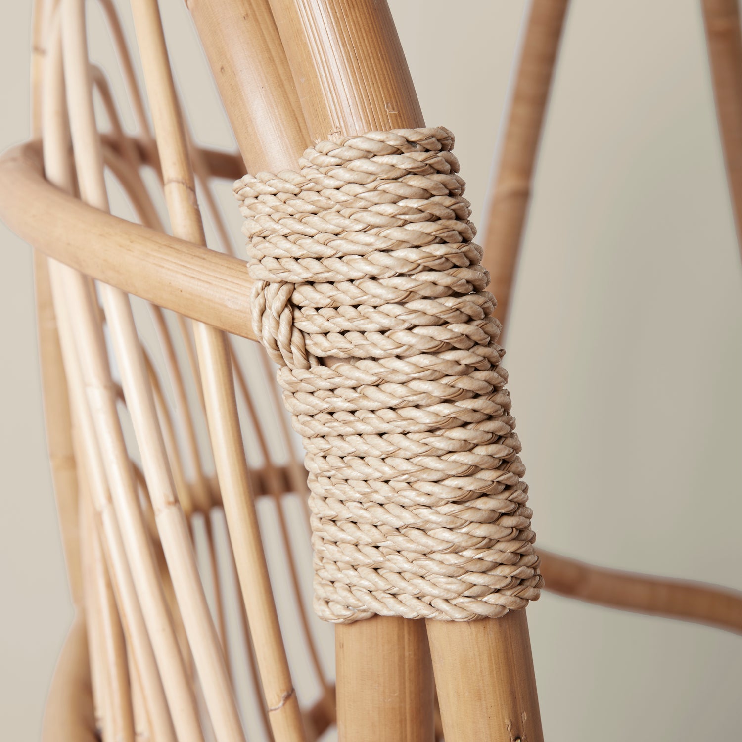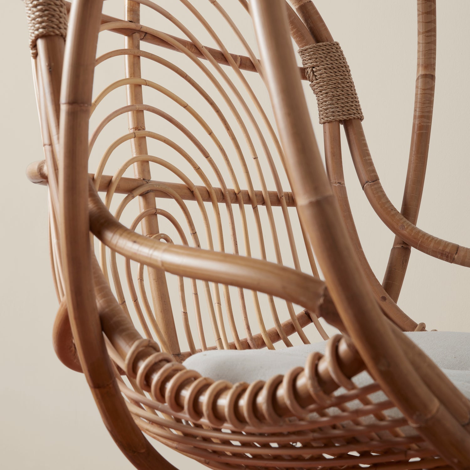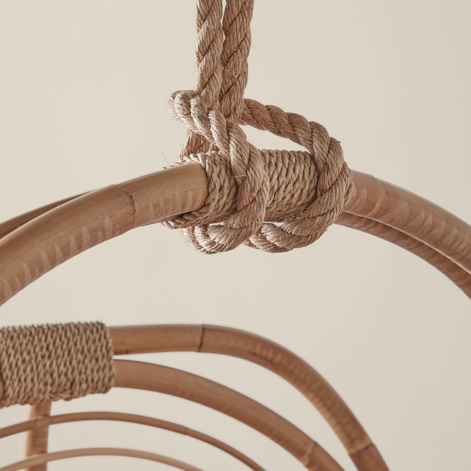 Expertly steamed and shaped by hand from Indonesian rattan, this chair is accented with rope details. Hanging hardware/instructions not included. NOTE: The cushion is not tufted as pictured.
