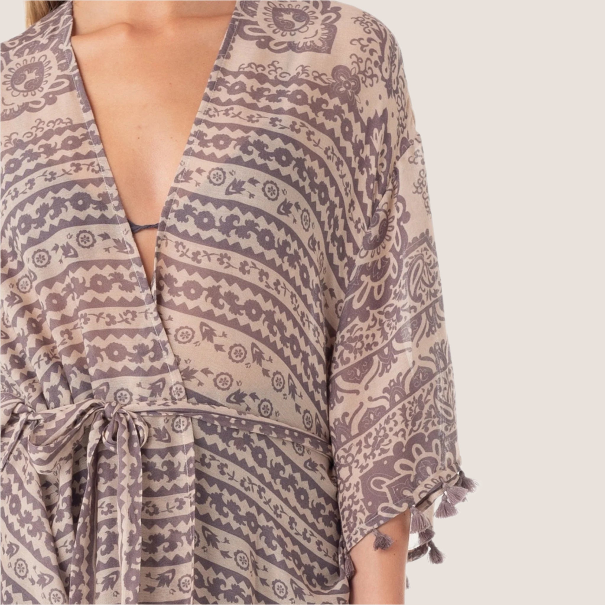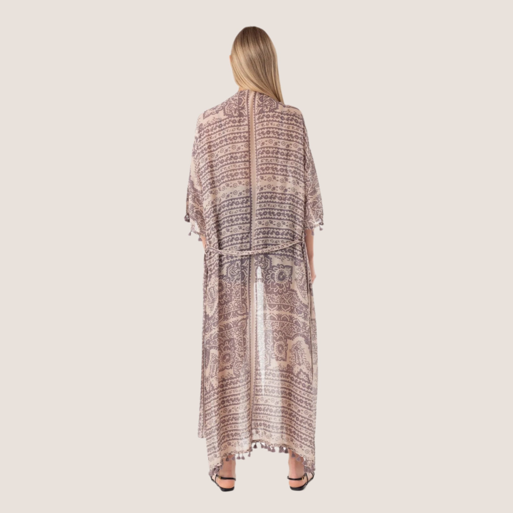 Embrace that vacation feeling every day with this sheer printed kimono in natural/gray hues. The flattering self-tie waist belt accentuates your silhouette while decorative tassels along the hem and 3/4 length cuffs add a touch of luxury. Versatile and captivating, this piece transitions effortlessly from an elegant robe to a chic beach cover-up you won't want to live without.
