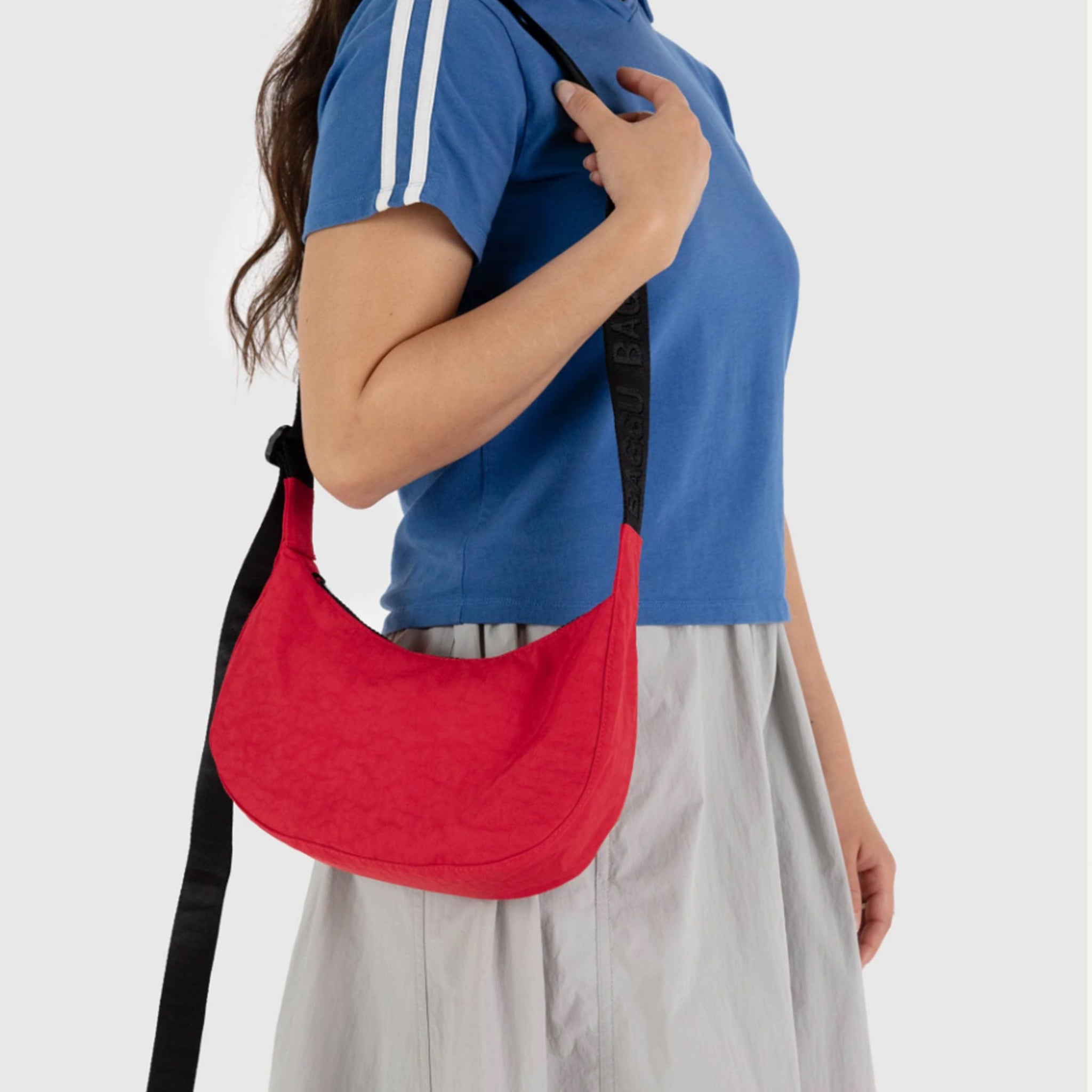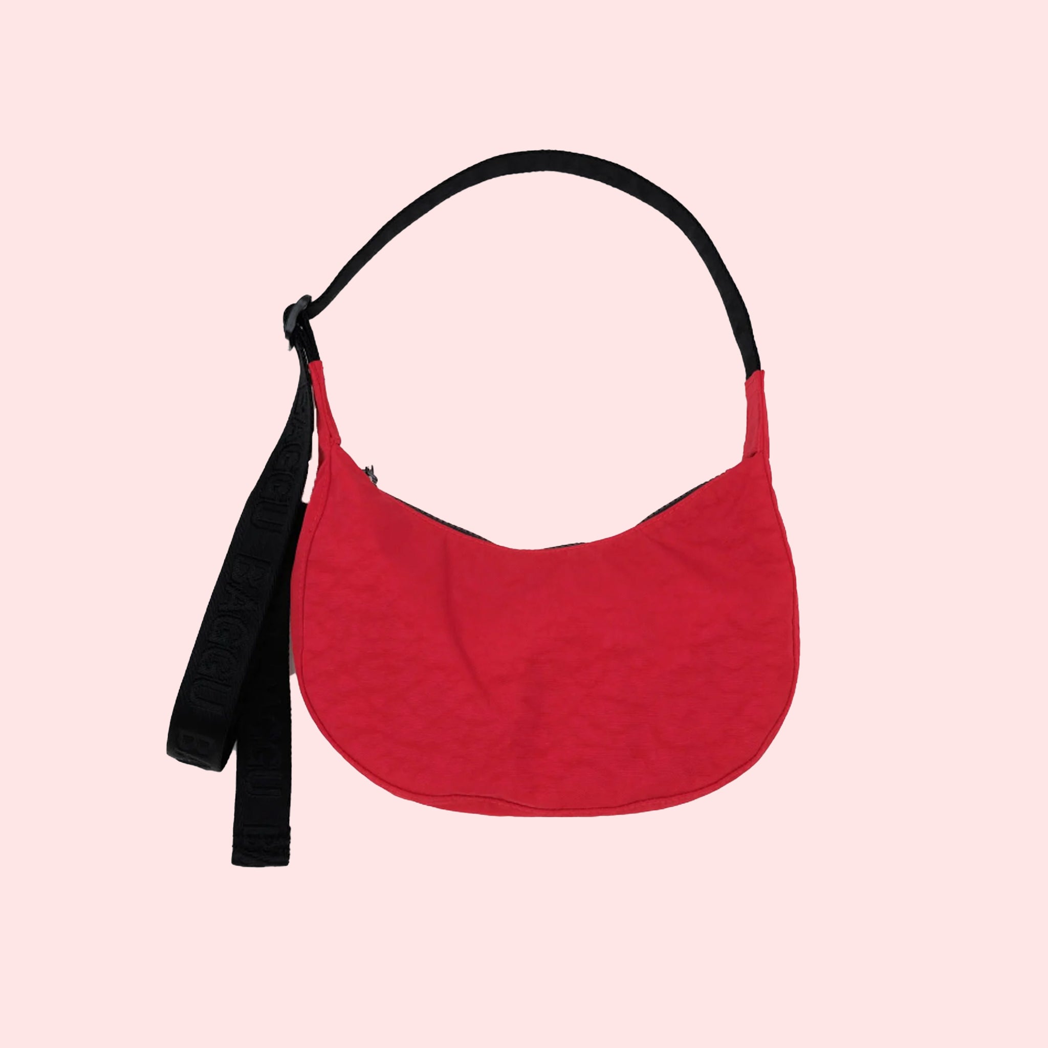 Meet the Small Crescent Bag! Baggu's popular crescent shape shoulder / crossbody bag now in a smaller size that still fits what you need with room to spare in a bright red shade so it pairs with any fit!