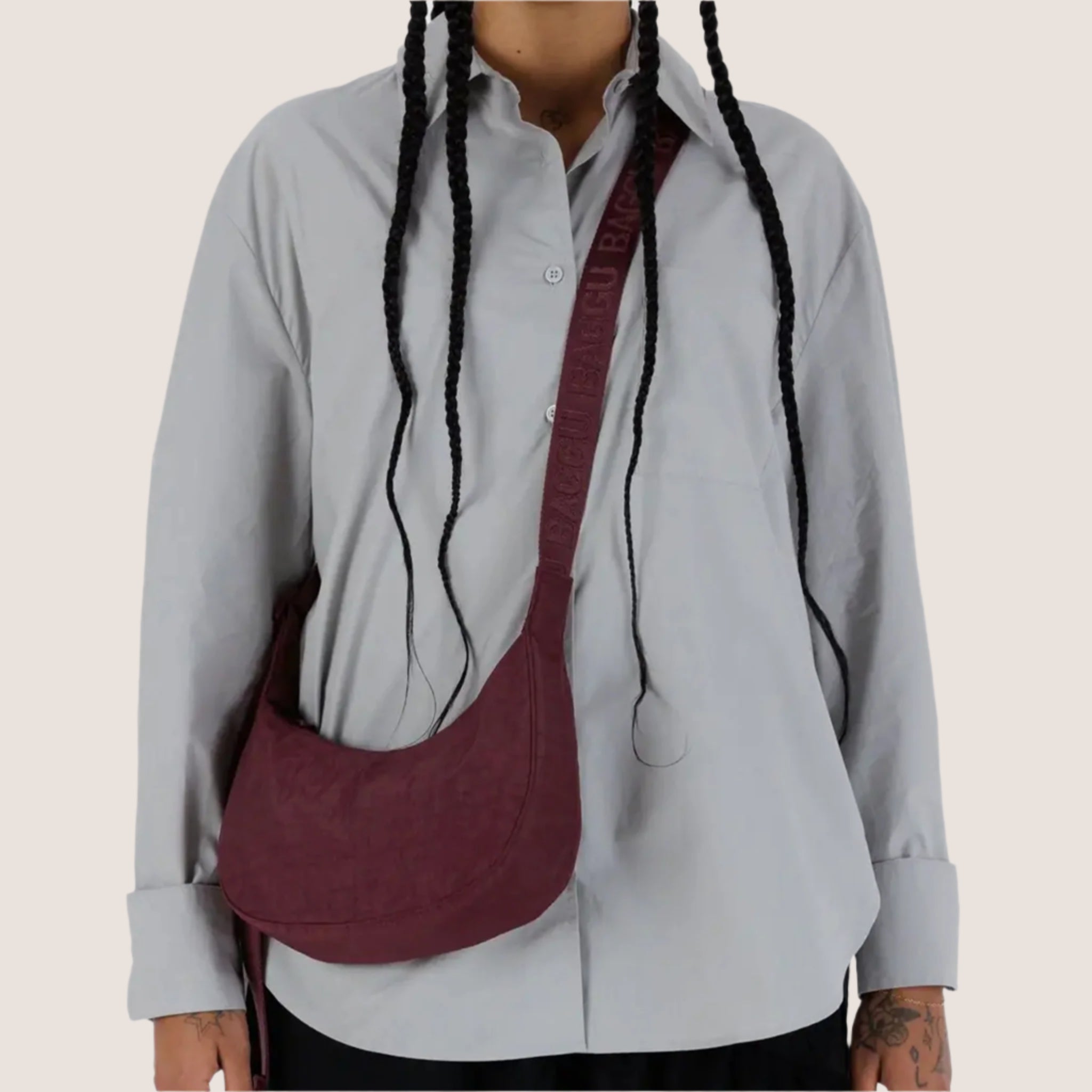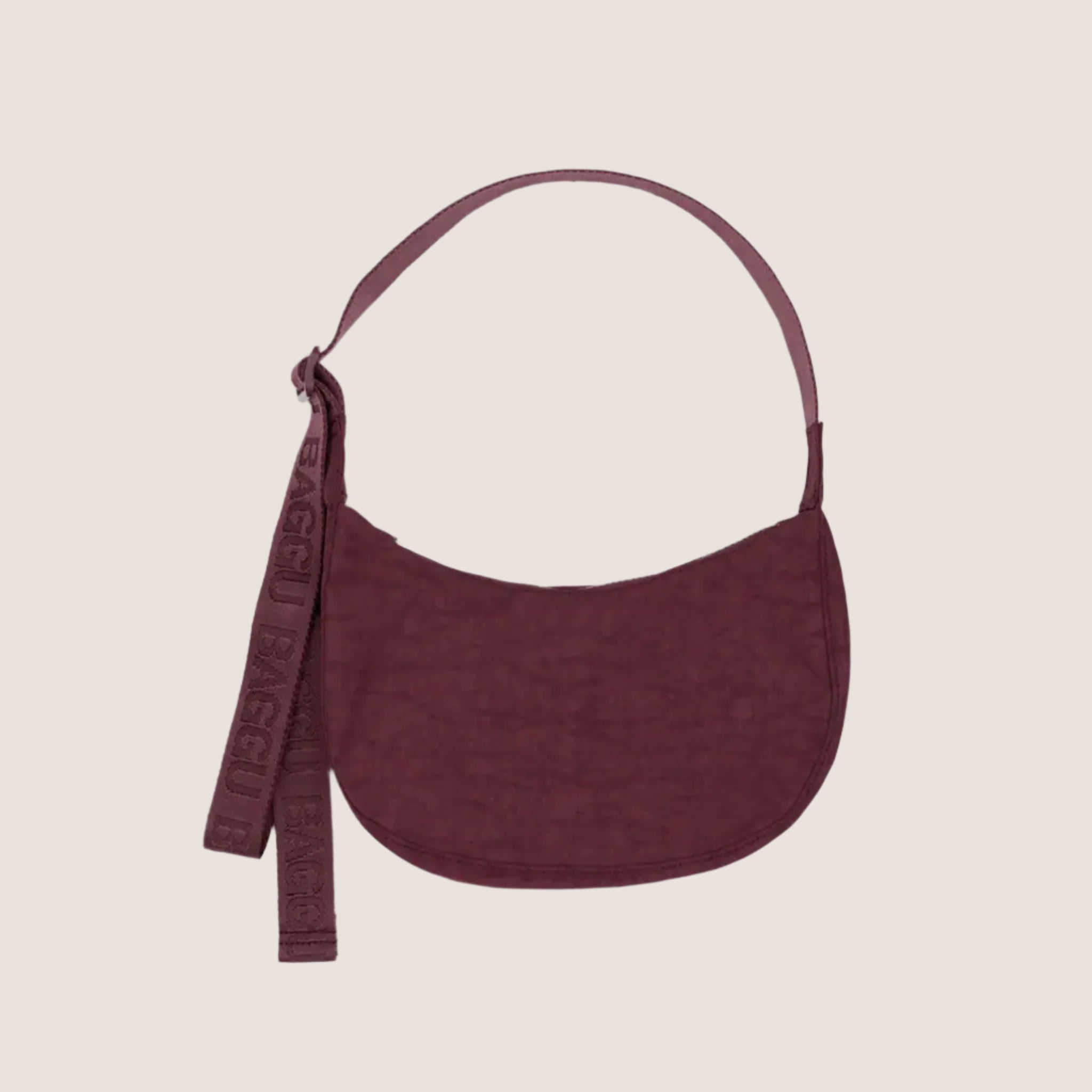 Experience the iconic crescent shape of Baggu's Crescent Bag now in a compact size that effortlessly fits all your essentials and more now in the stunning Mahogany red shade.