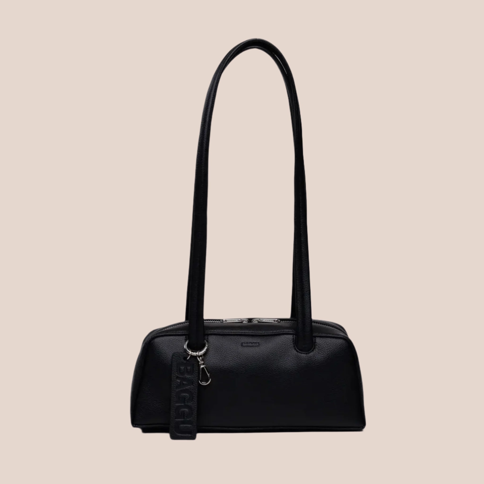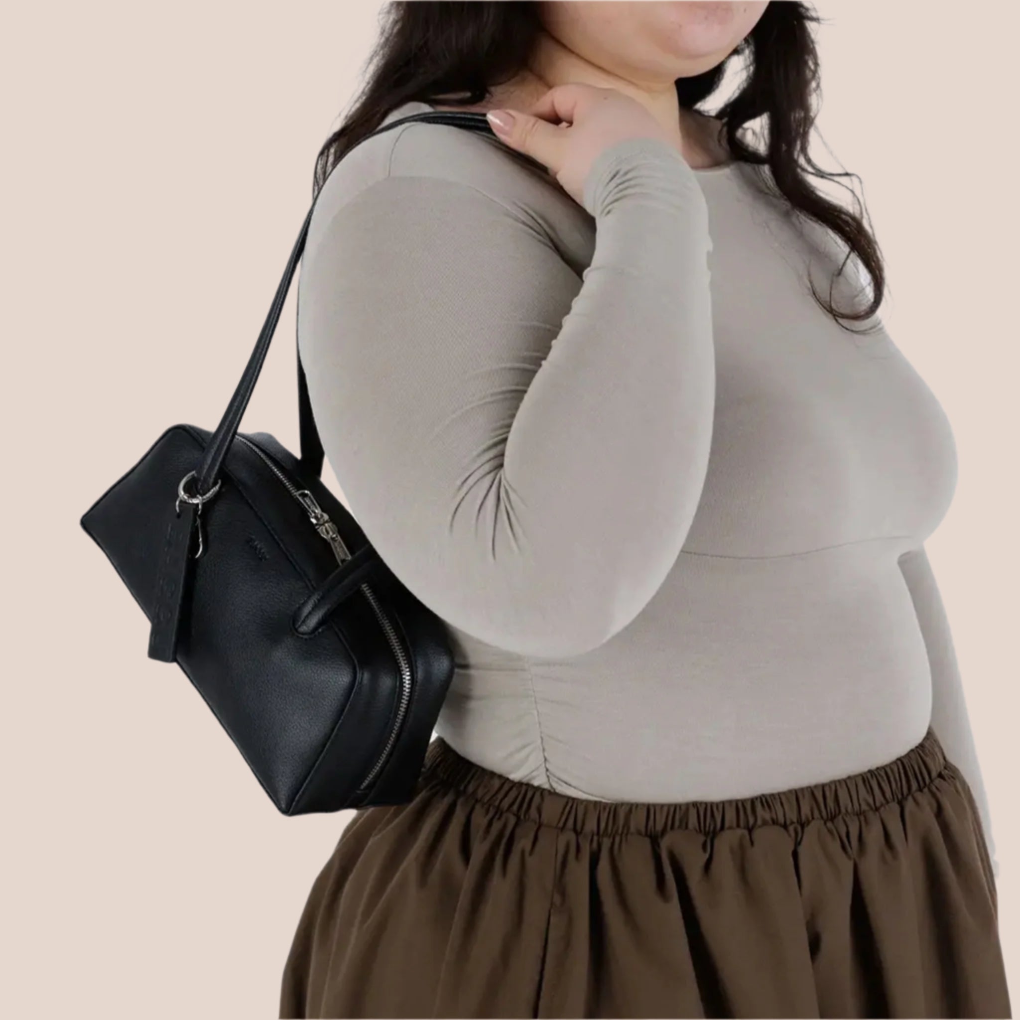 A small recycled leather bowler bag in Black by Baggu designed to be accessorized, with four charm loops and a clip ring. An interior zip pocket keeps things secure and in reach. Fits your phone, wallet, keys, and more.