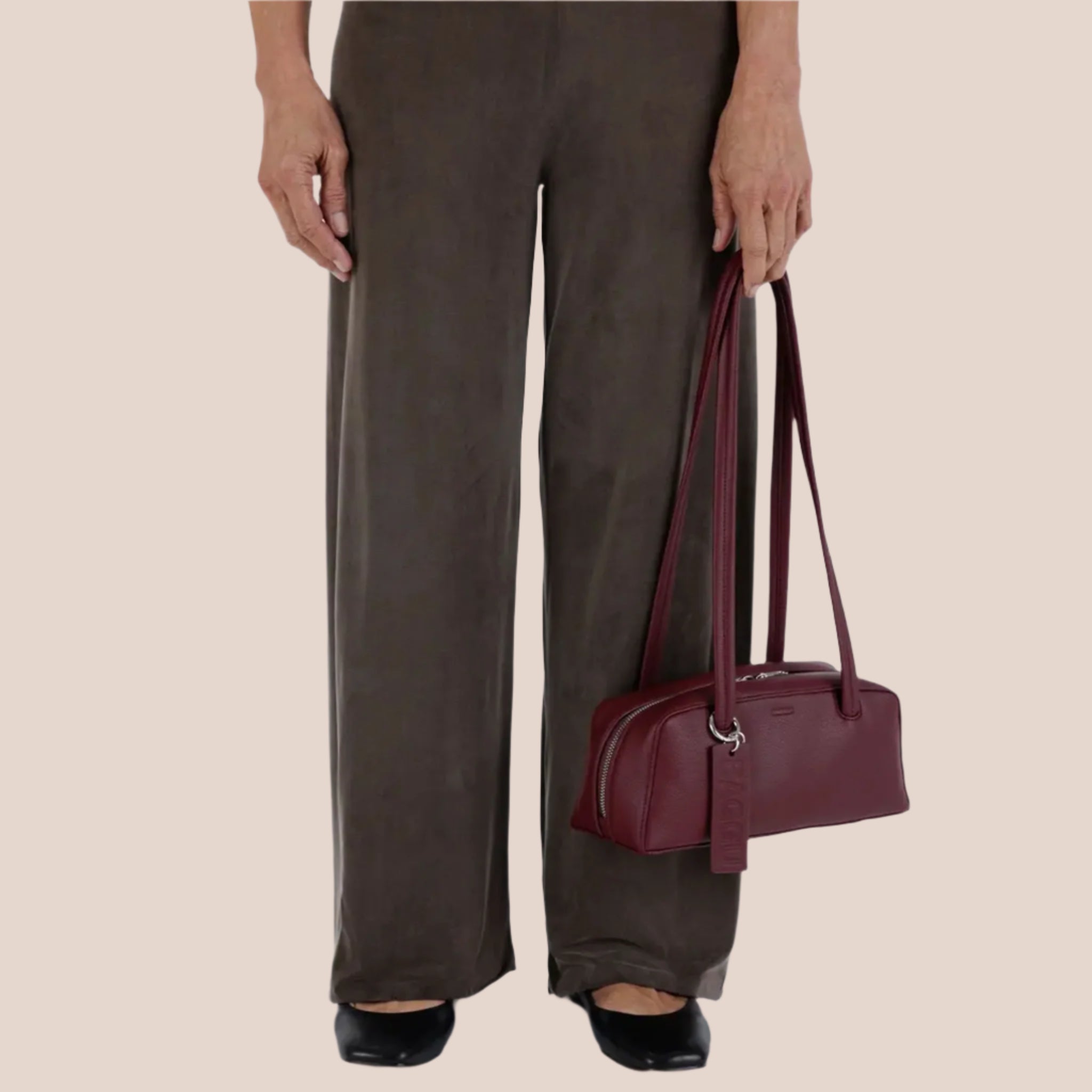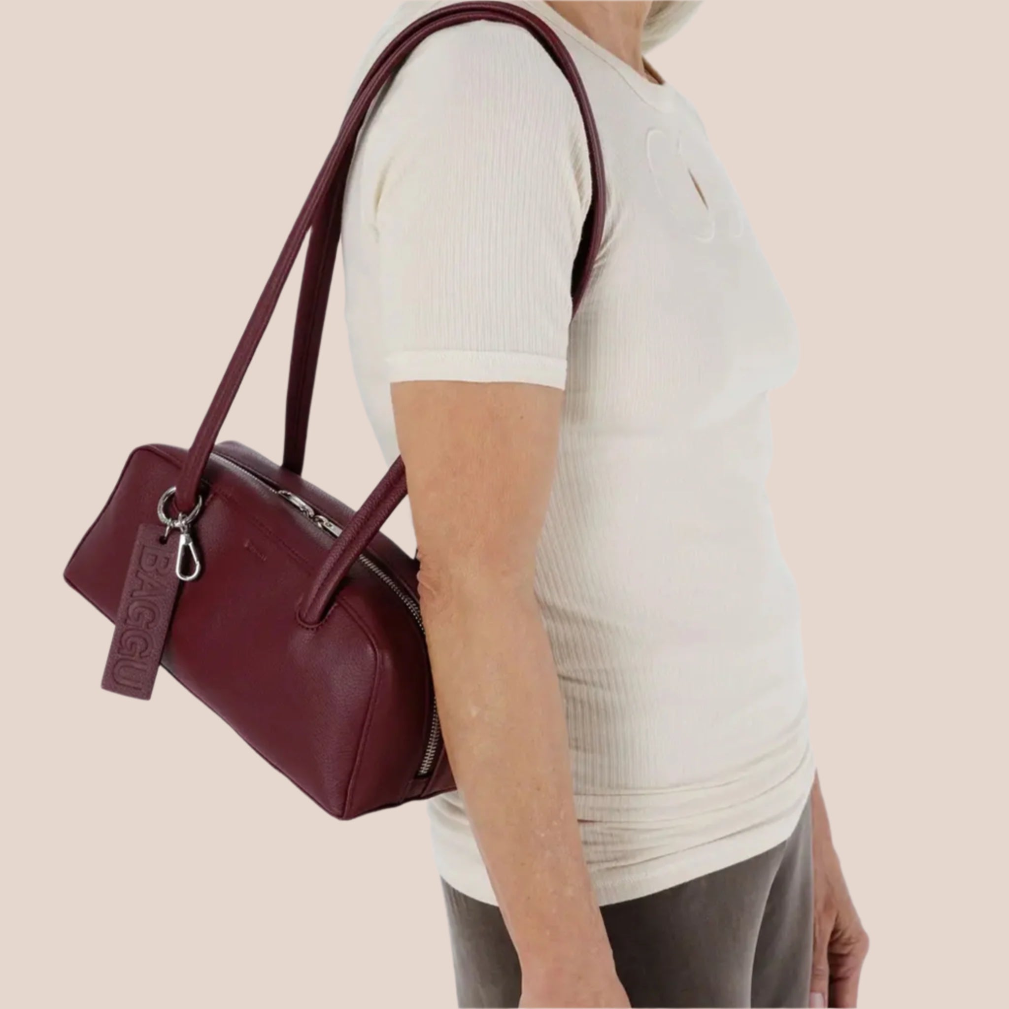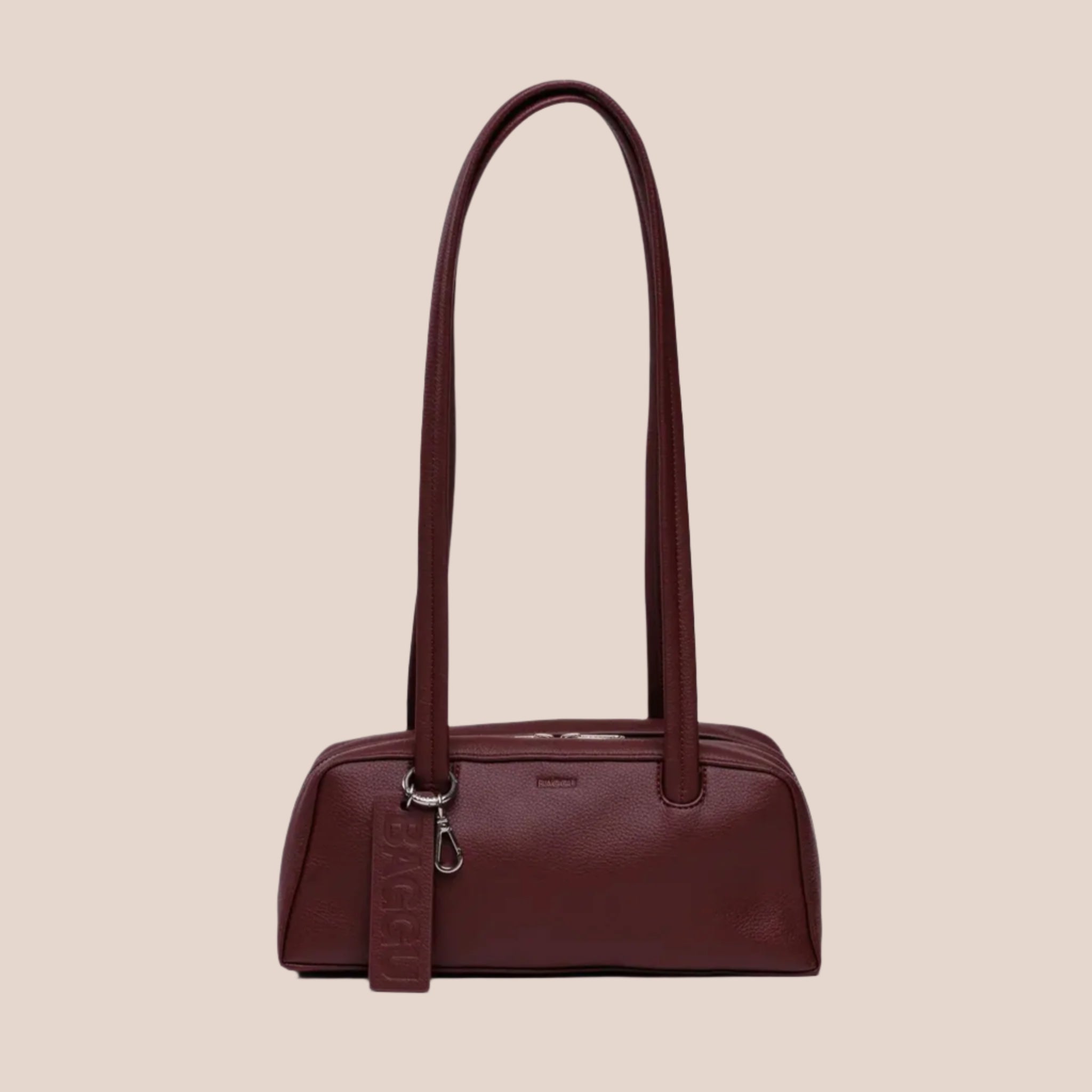 A small recycled leather bowler bag in Mahogany by Baggu designed to be accessorized, with four charm loops and a clip ring. An interior zip pocket keeps things secure and in reach. Fits your phone, wallet, keys, and more.