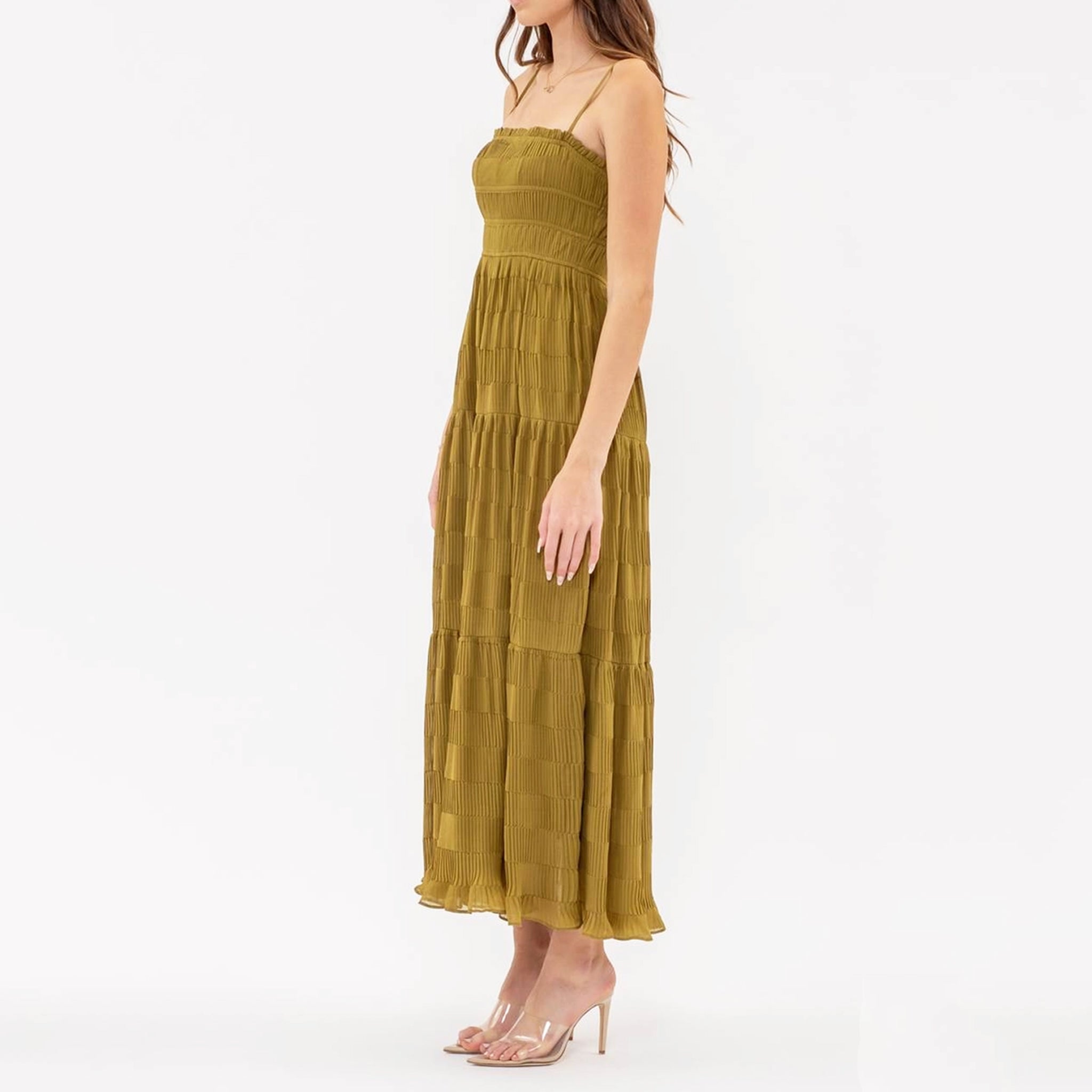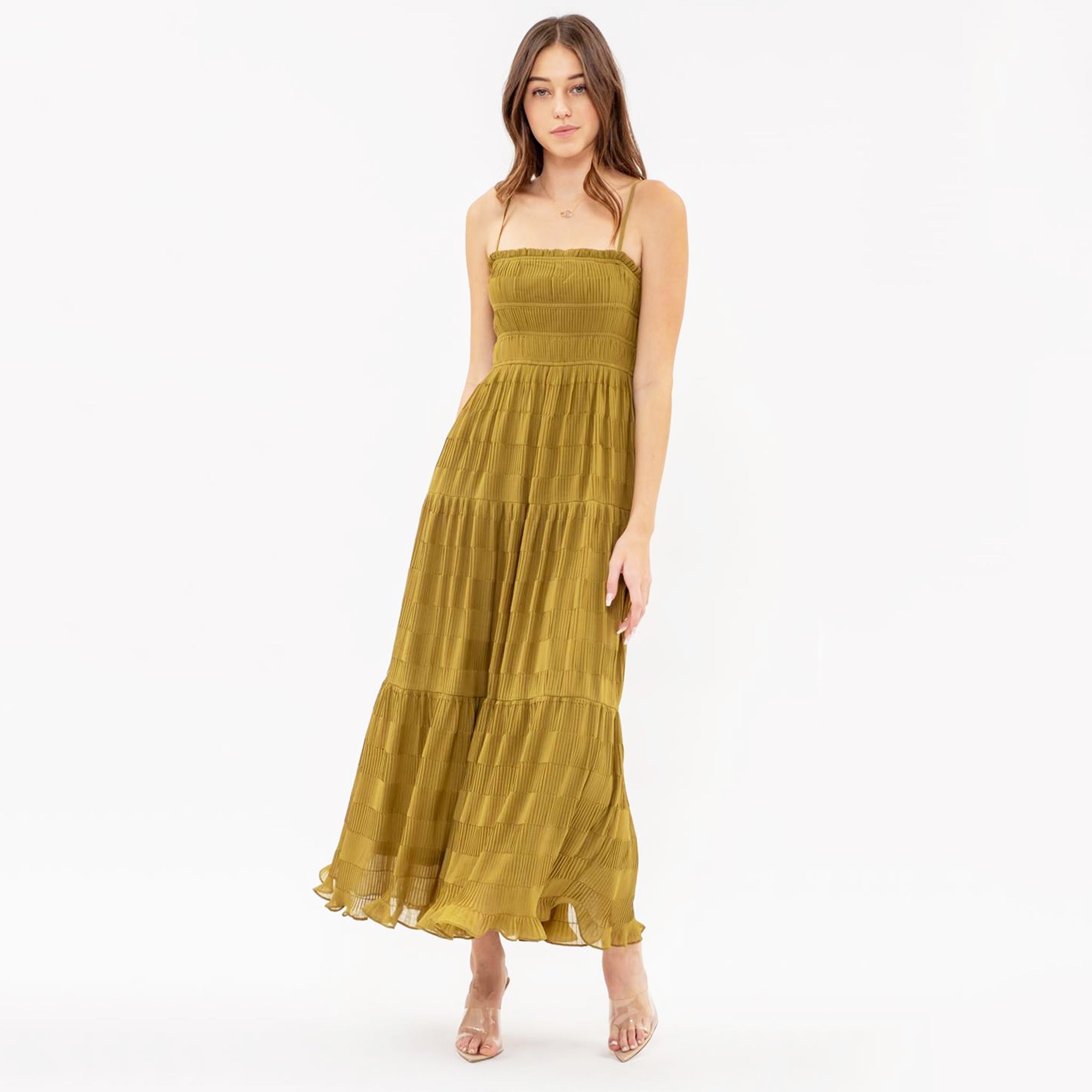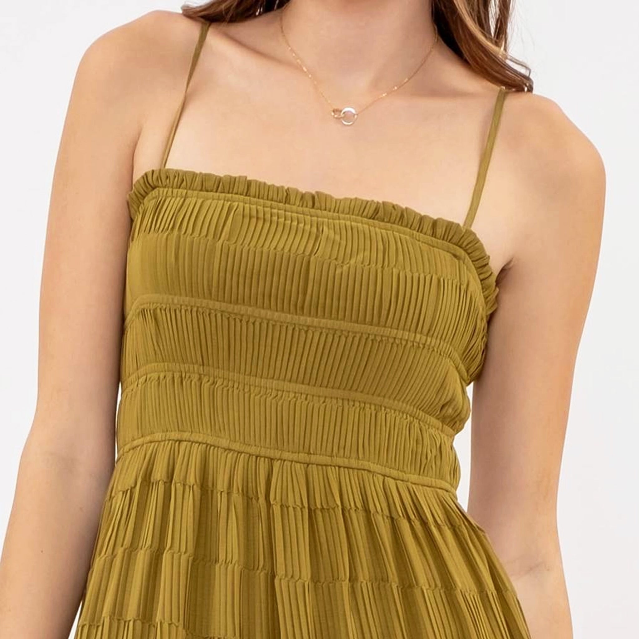Whether you're headed to work or a night out on the town, The Tiered Pleated Midi Dress in an olive green hue has got you covered with its versatile sizing options and comfortable silhouette. With a flattering straight neckline, chic spaghetti straps, and a flowy tiered design, this midi dress is stylish and effortless. Stay comfy all day (and all night) thanks to the adjustable straps and elasticized waist. Plus, the dress is lined to ensure maximum coverage and confidence. Get ready to make a statement with this stunning olive green dress.