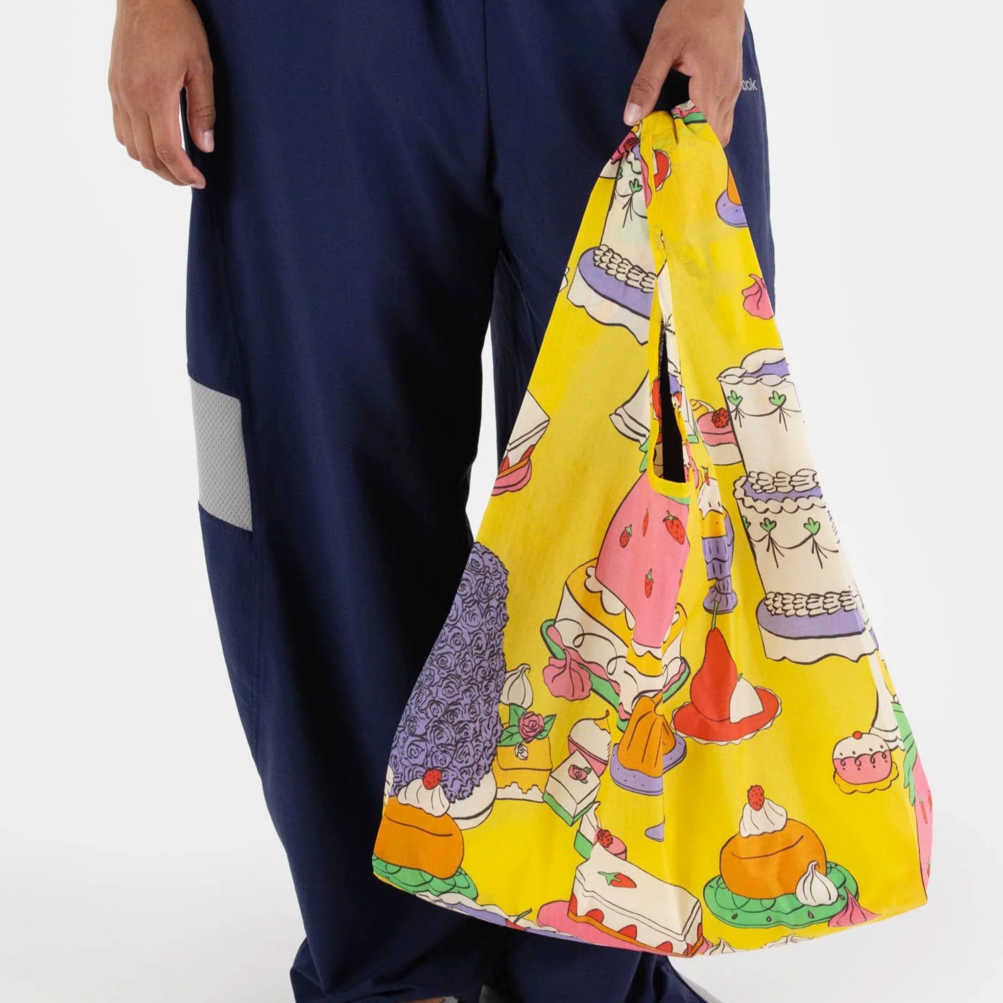 The best selling Baggu reusable bag is not just for the grocery store, it goes everywhere and hauls (practically) anything. Now featuring the adorable Patisserie print, perfect for all our dessert lovers! Carry in your hand or over your shoulder. Holds 2–3 plastic grocery bags worth of stuff.