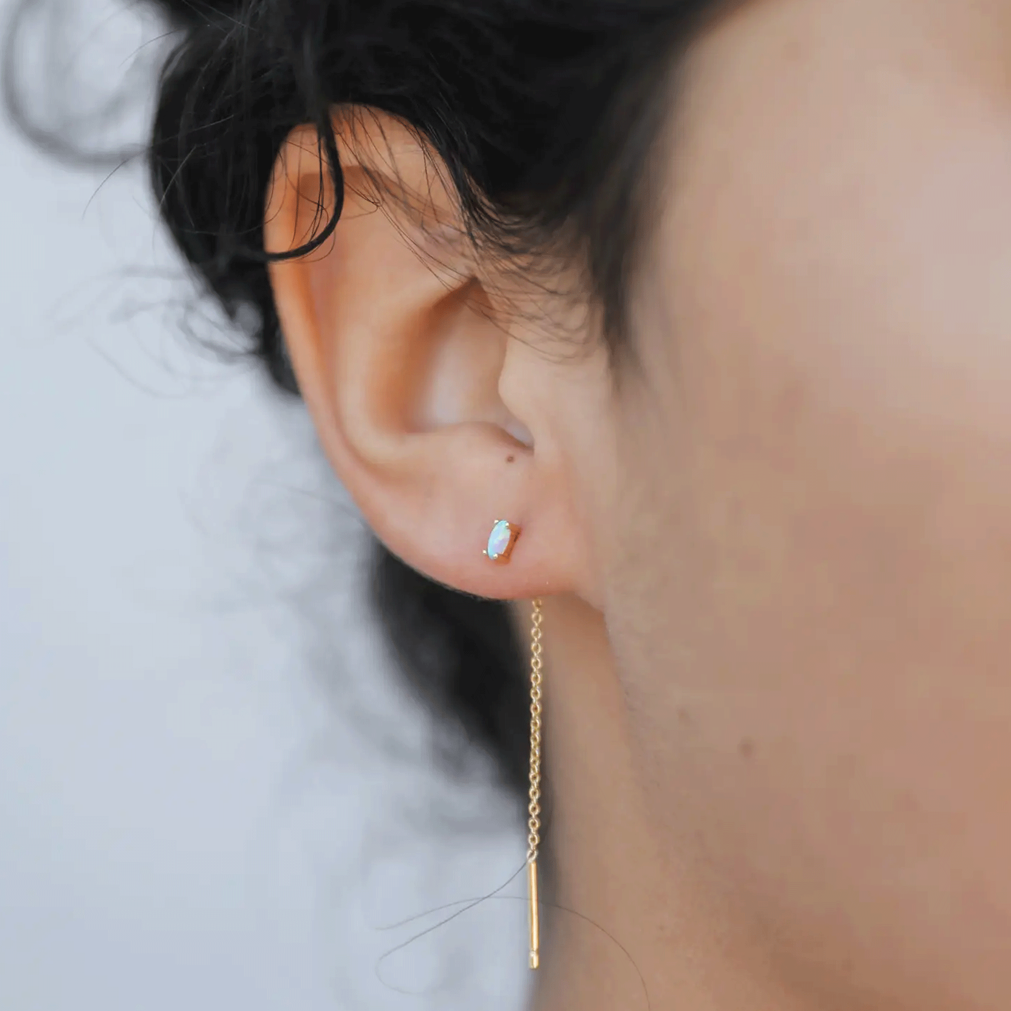 Adding a little charm to your daily aesthetic. These studded threaders have an oblong drop of white opal set to anchor a sweeping thread of chain. Opal is known as the "joy" stone, intensifying happiness and encouraging freedom of emotions. The perfect addition to your earring collection.