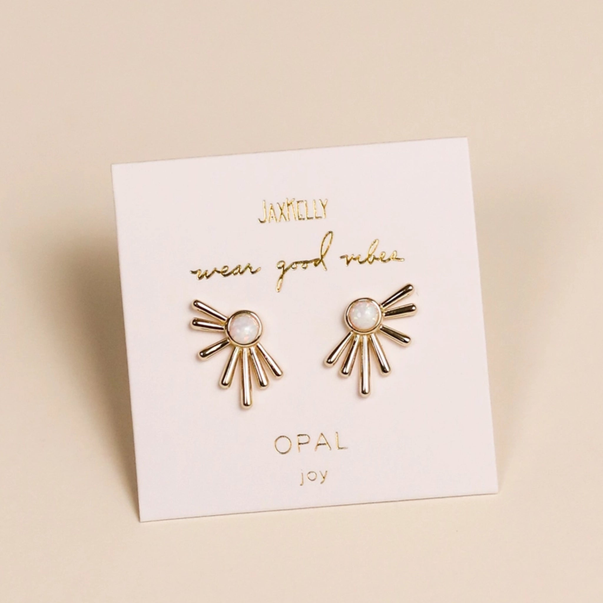 Bring the sun wherever you go with the stunning White Opal Sun Ray Stud Earrings from Jaxkelly. Their dainty design makes them perfect for adding to an existing stack or worn alone.