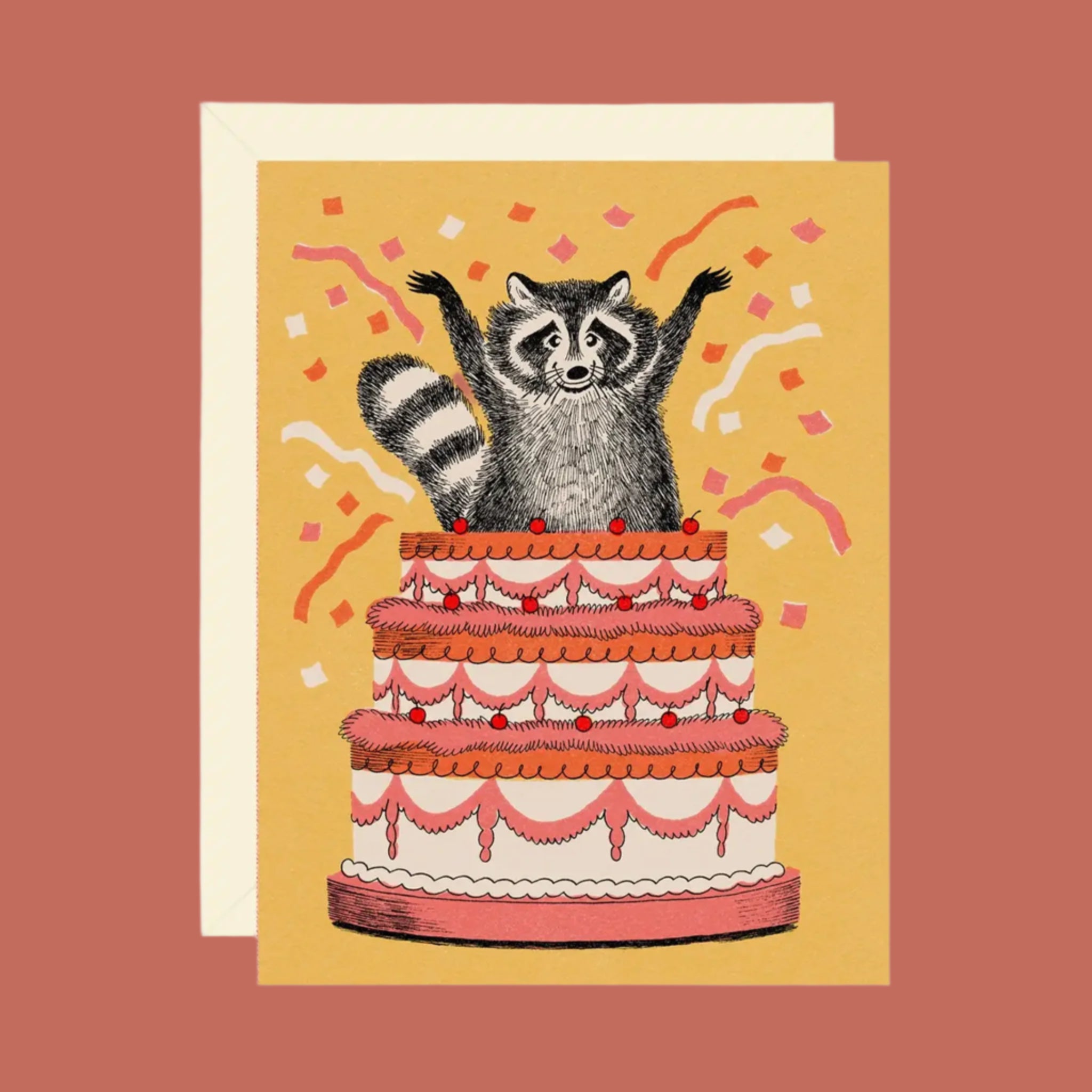 This delightful raccoon bursts out of a beautifully vintage-styled cake, tossing confetti to add extra fun to your special celebration!