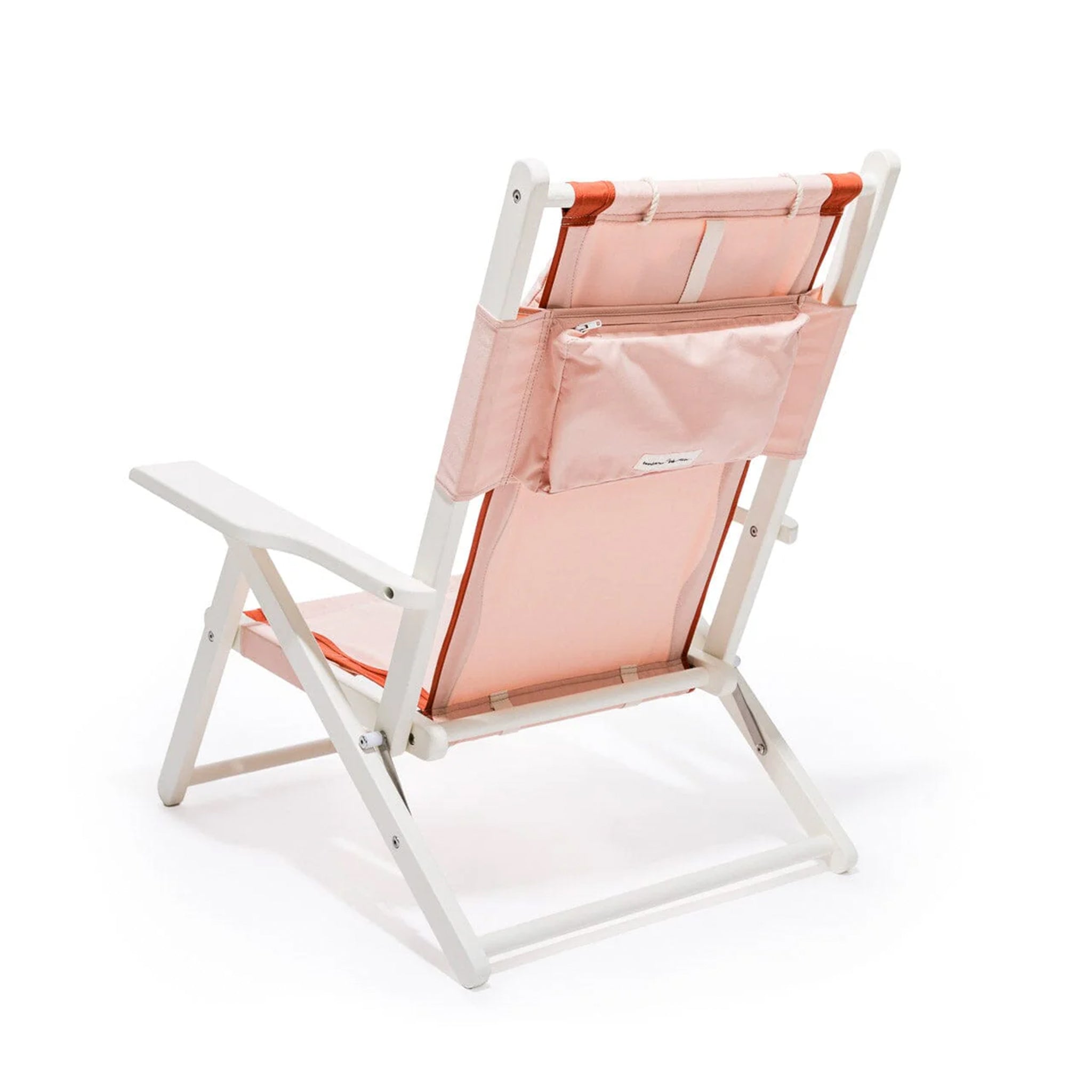 Meet Business & Pleasure's practical yet beautiful Tommy Chair in the shade Pink and White Rivie. The Tommy Chair is designed to bring all the style and comfort you could want to the beach on your back! This 5 position reclining beach chair with large back zip pocket, armrests and soft touch outdoor canvas sling all folds up into a backpack!