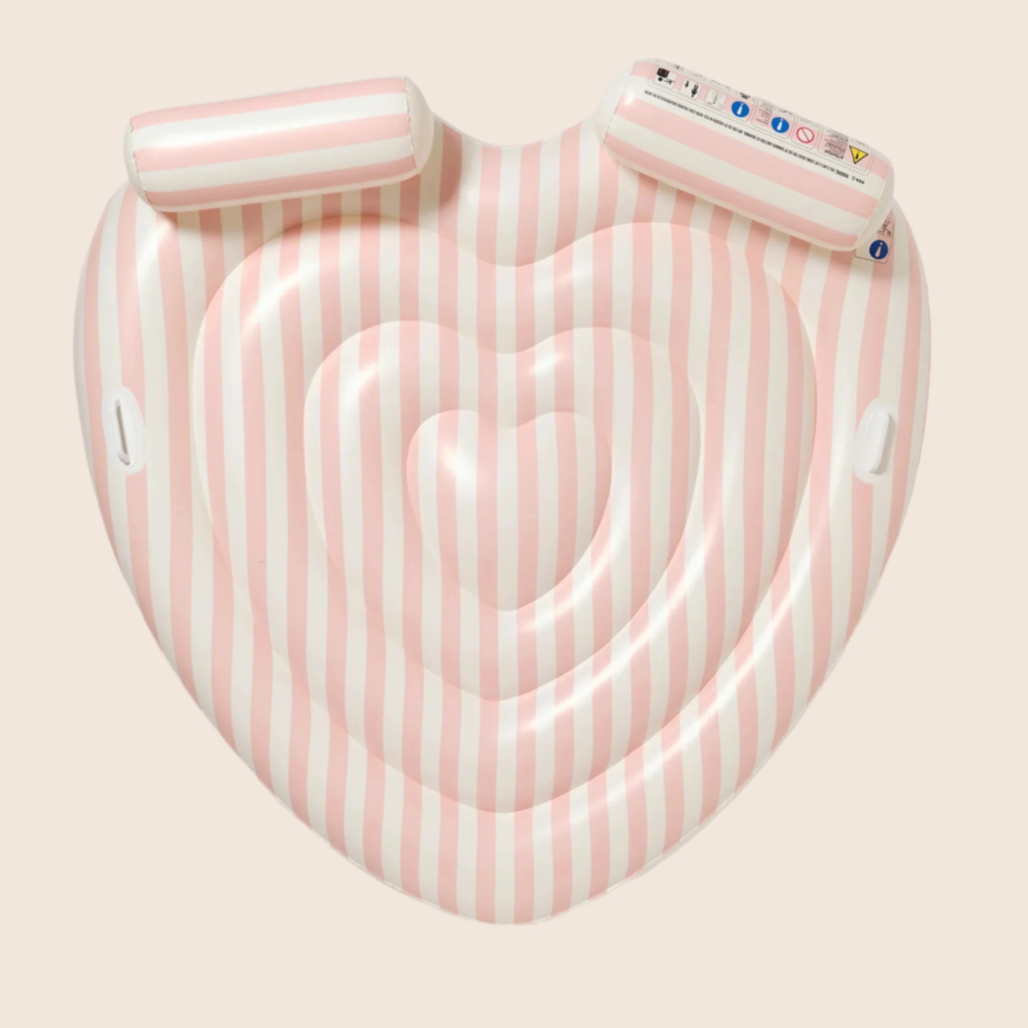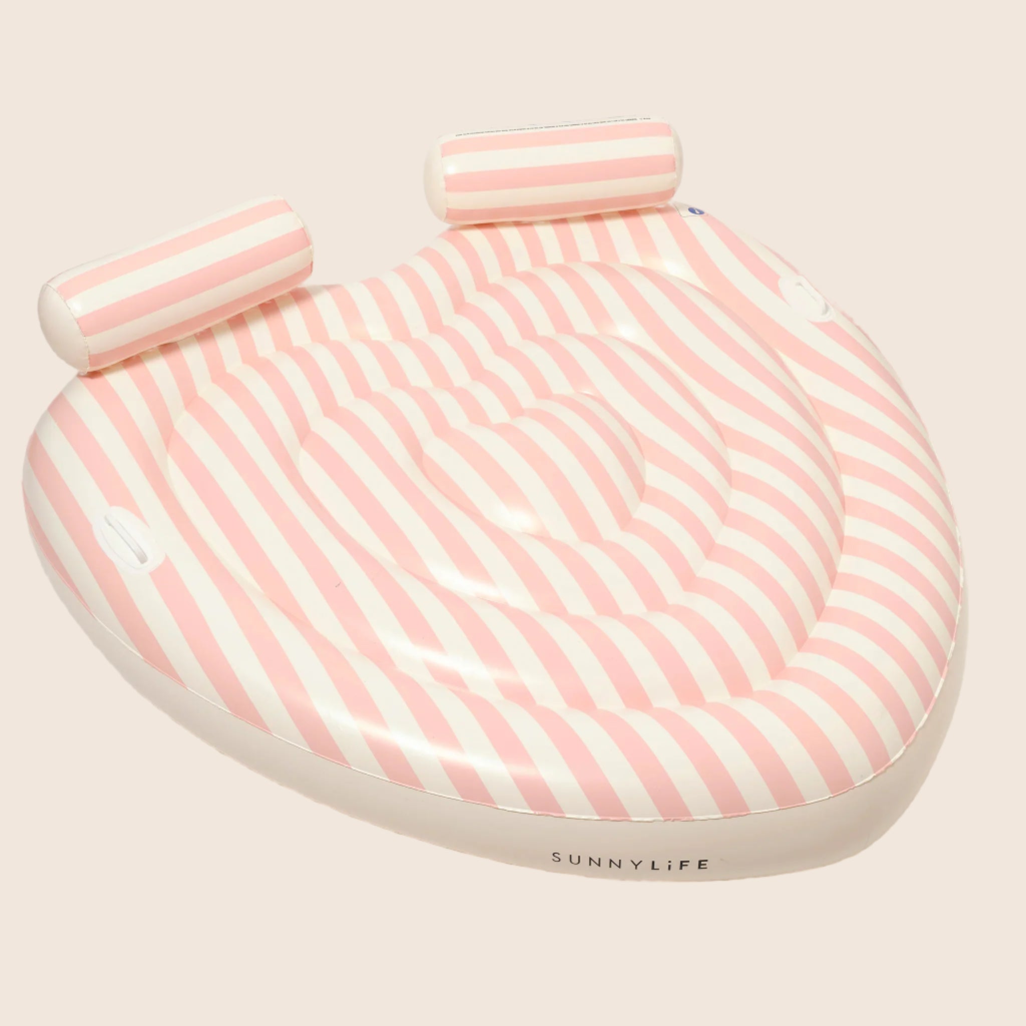 Indulge in ultimate relaxation with our Twin Lie-On Float in a soft pink stripe design! This inflatable pool float features a charming heart shape, perfect for lounging in style with a friend. Soak up the sun and make a statement with this must-have pool accessory!