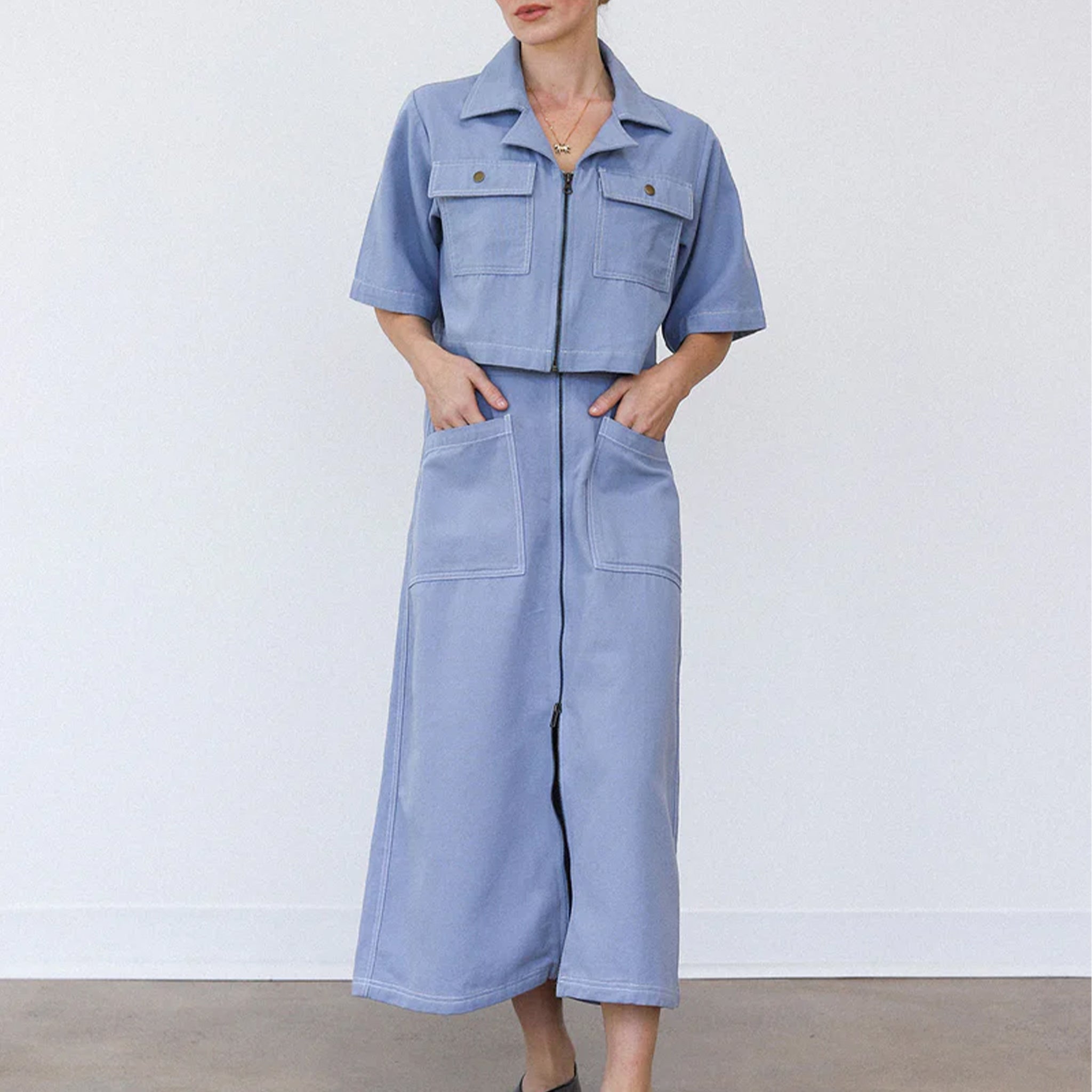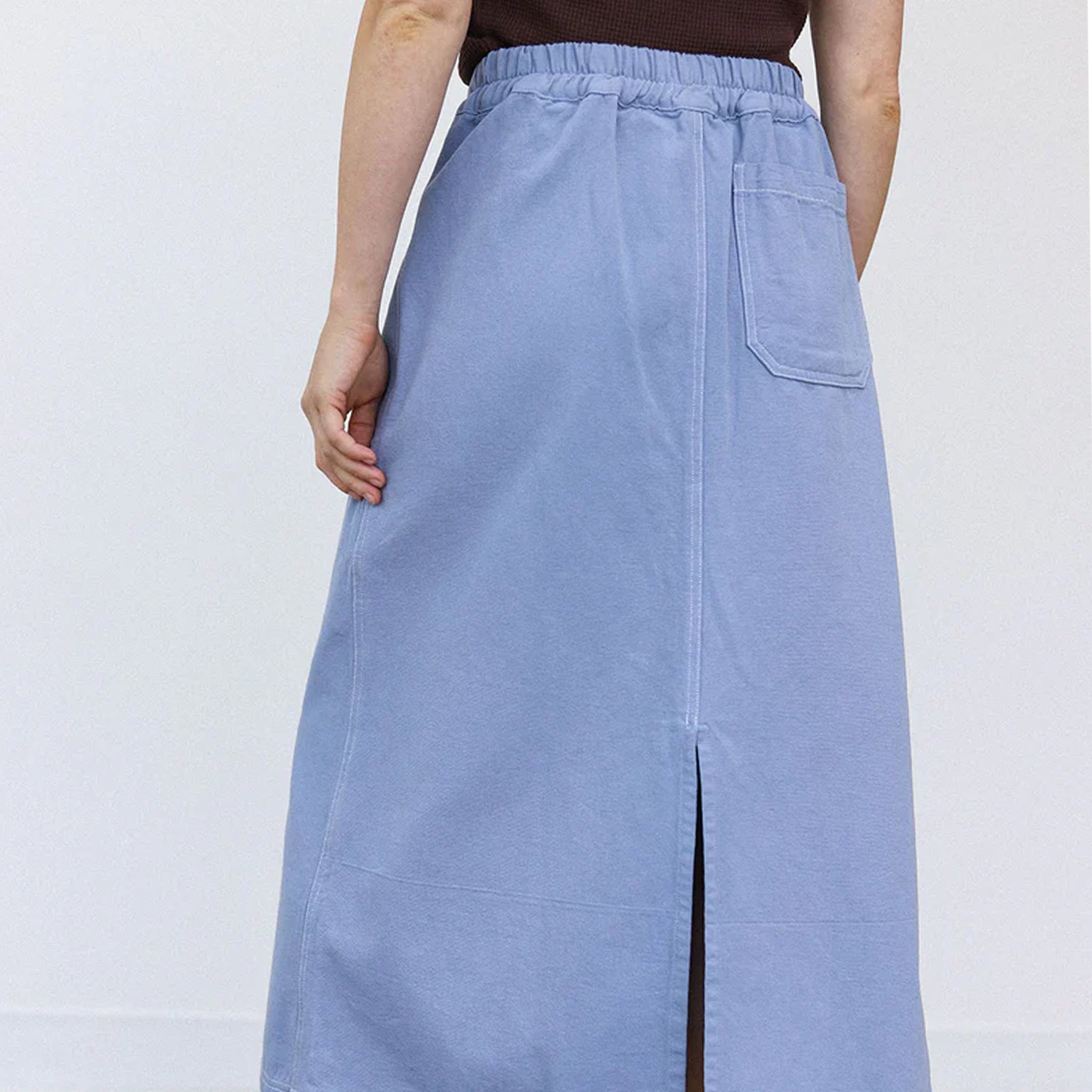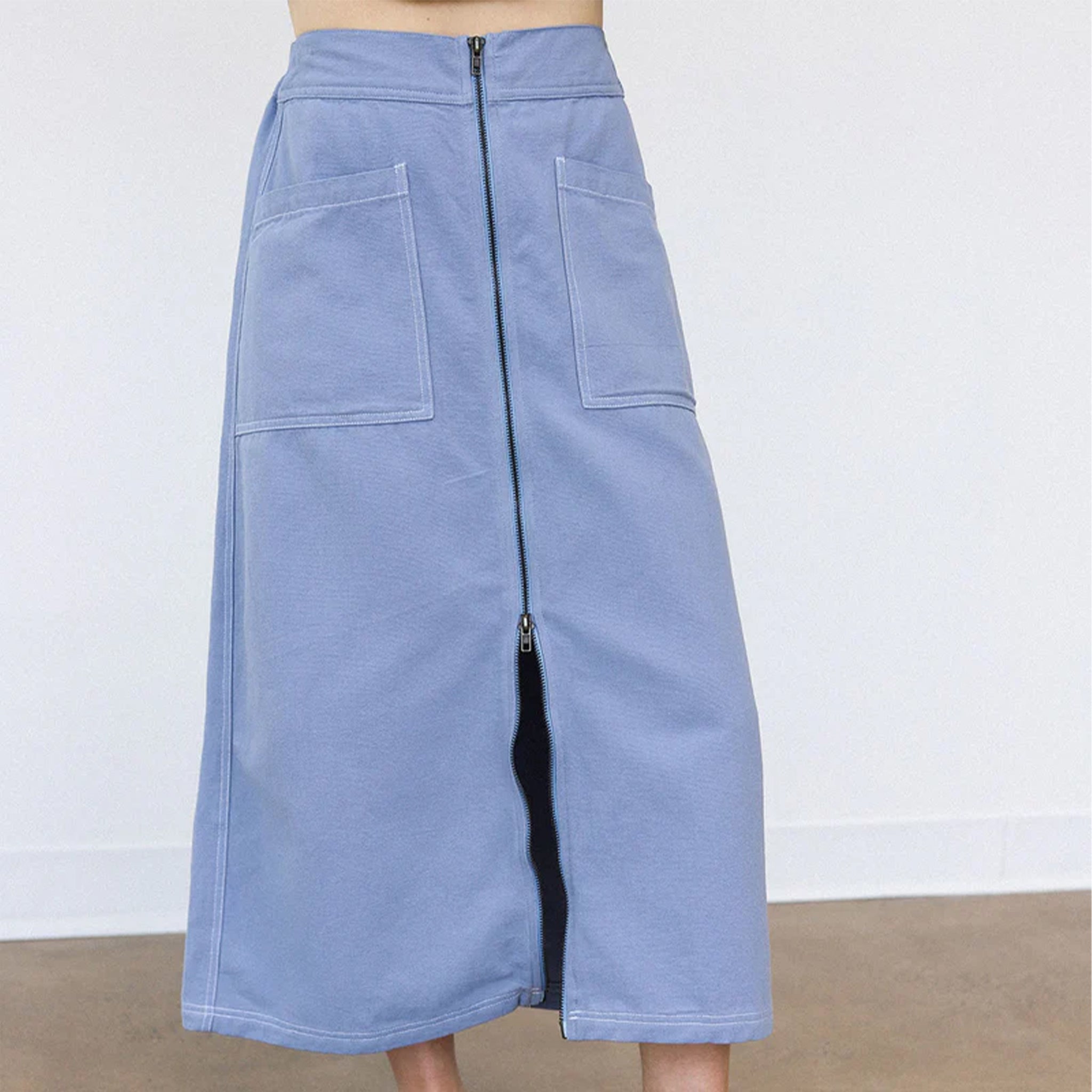 The midi zip-up skirt you didn't know you needed. Elastic back waist to work with your waist and not against it throughout the day. Features an extra high waist with a two way zipper, two pockets in the front and one in the back for all your stuff.