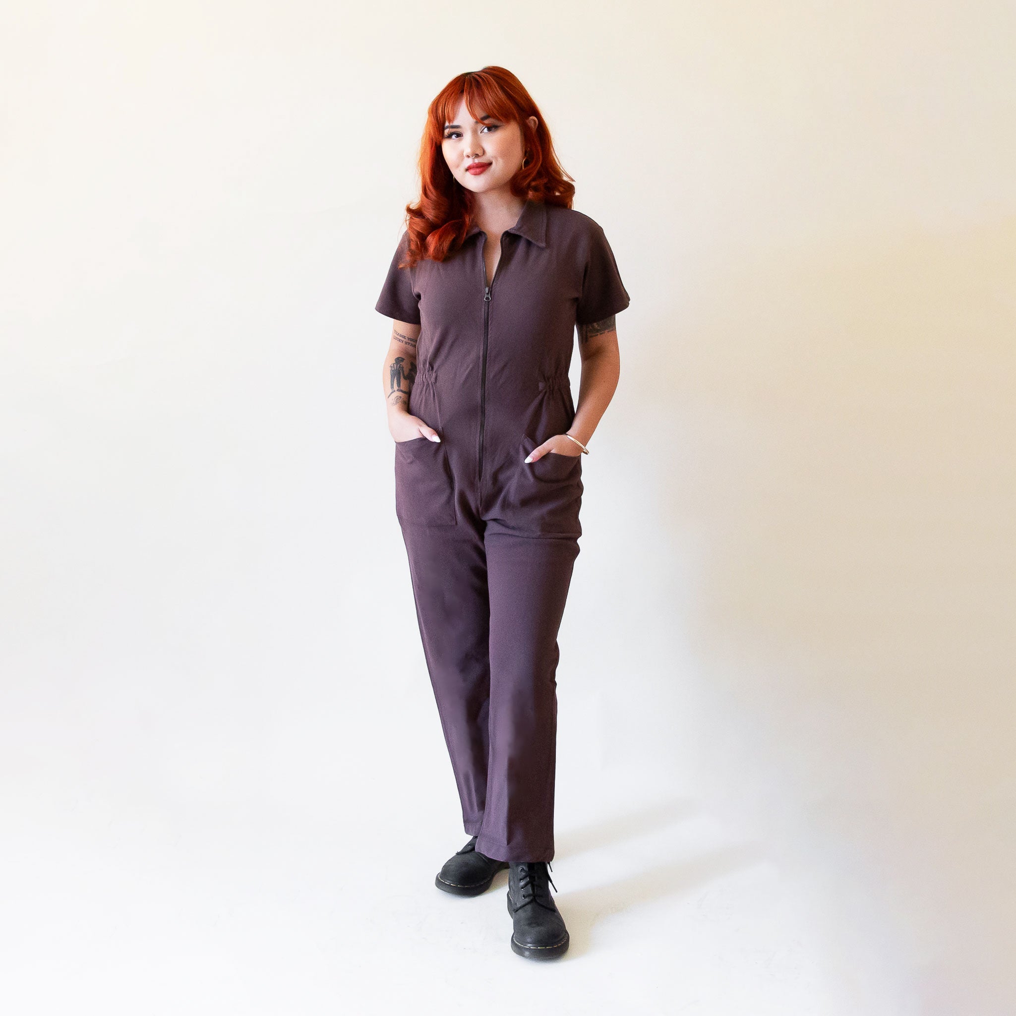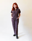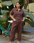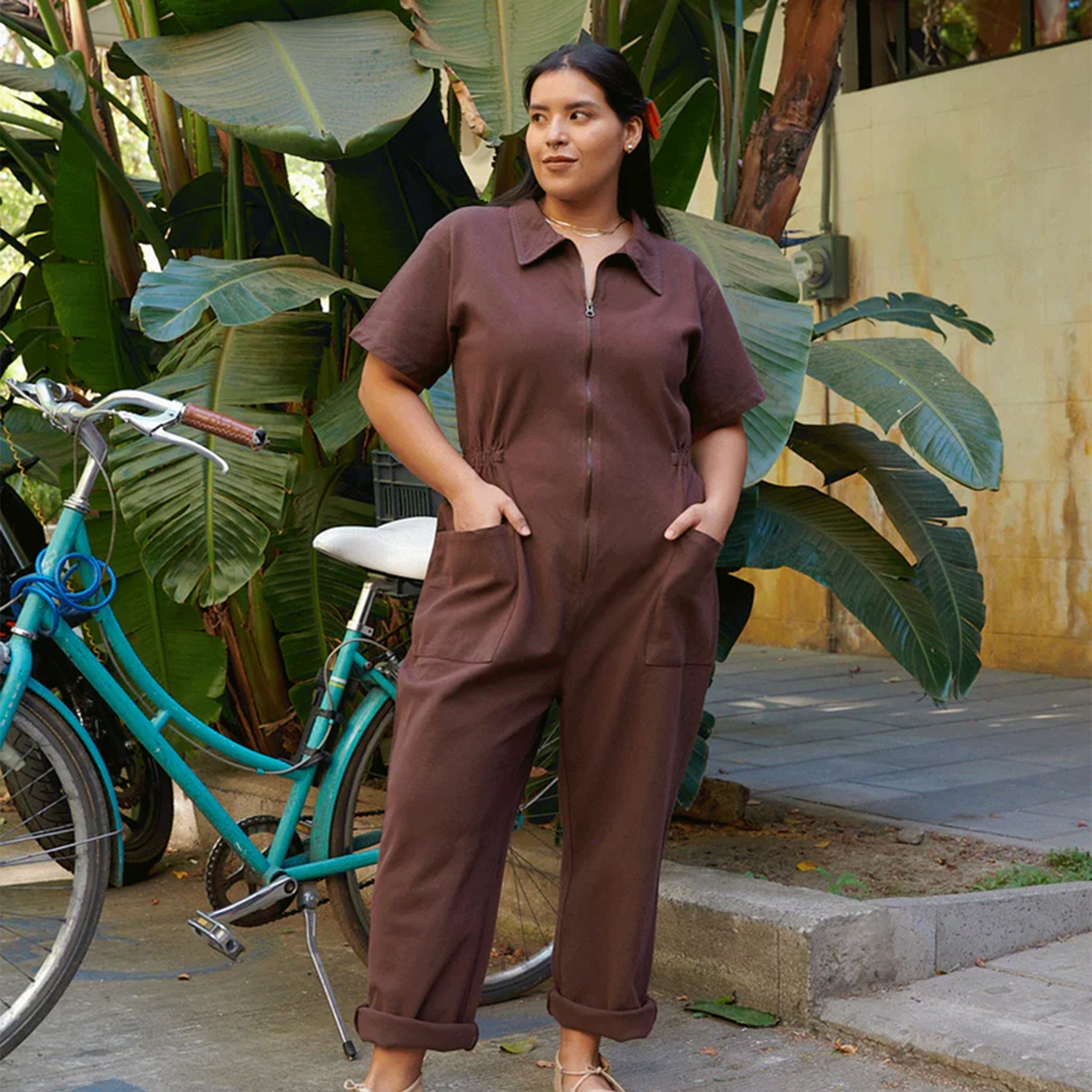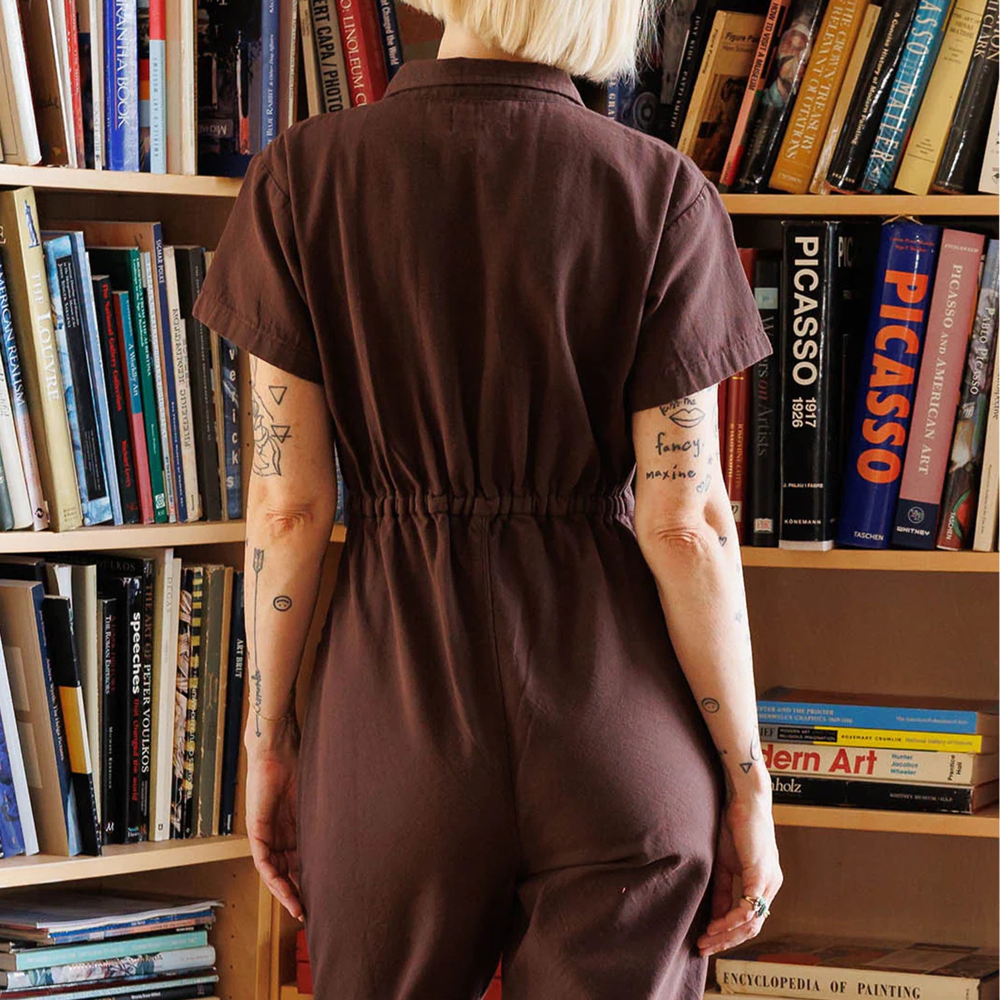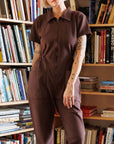 Noble Carriage's signature Utility Suit is finally available for adults to make all of your twinning jumpsuit dreams come true. Made in Peru with their durable yet buttery soft GOTS certified organic Pima cotton canvas in a brown Chocolate shade and featuring a cropped leg and cinched waist.