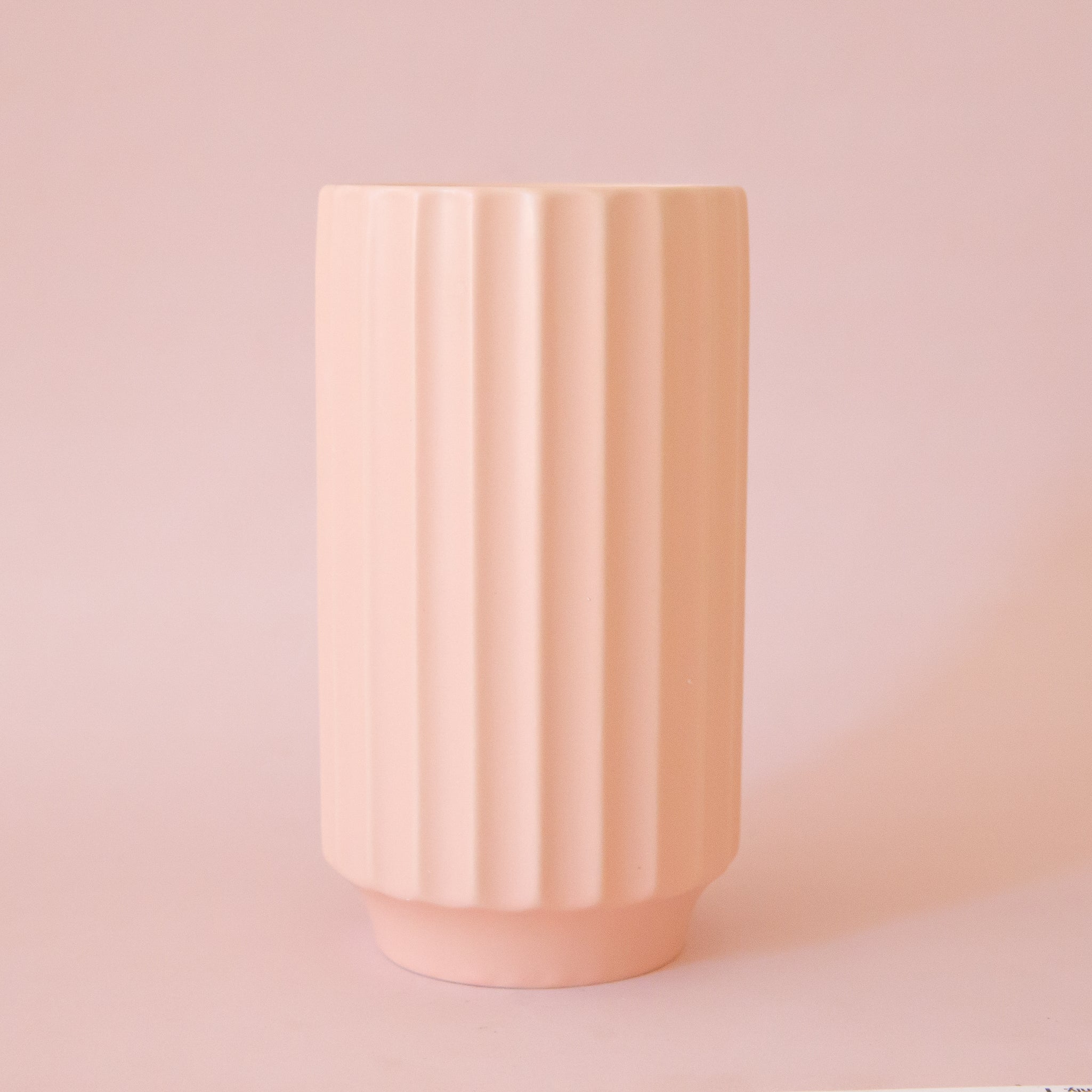 The Monroe Vase in Petal Pink brings textured elegance to your space. Its ribbed ceramic design and sleek finish make it a standout piece, whether styled with flowers or displayed on its own!