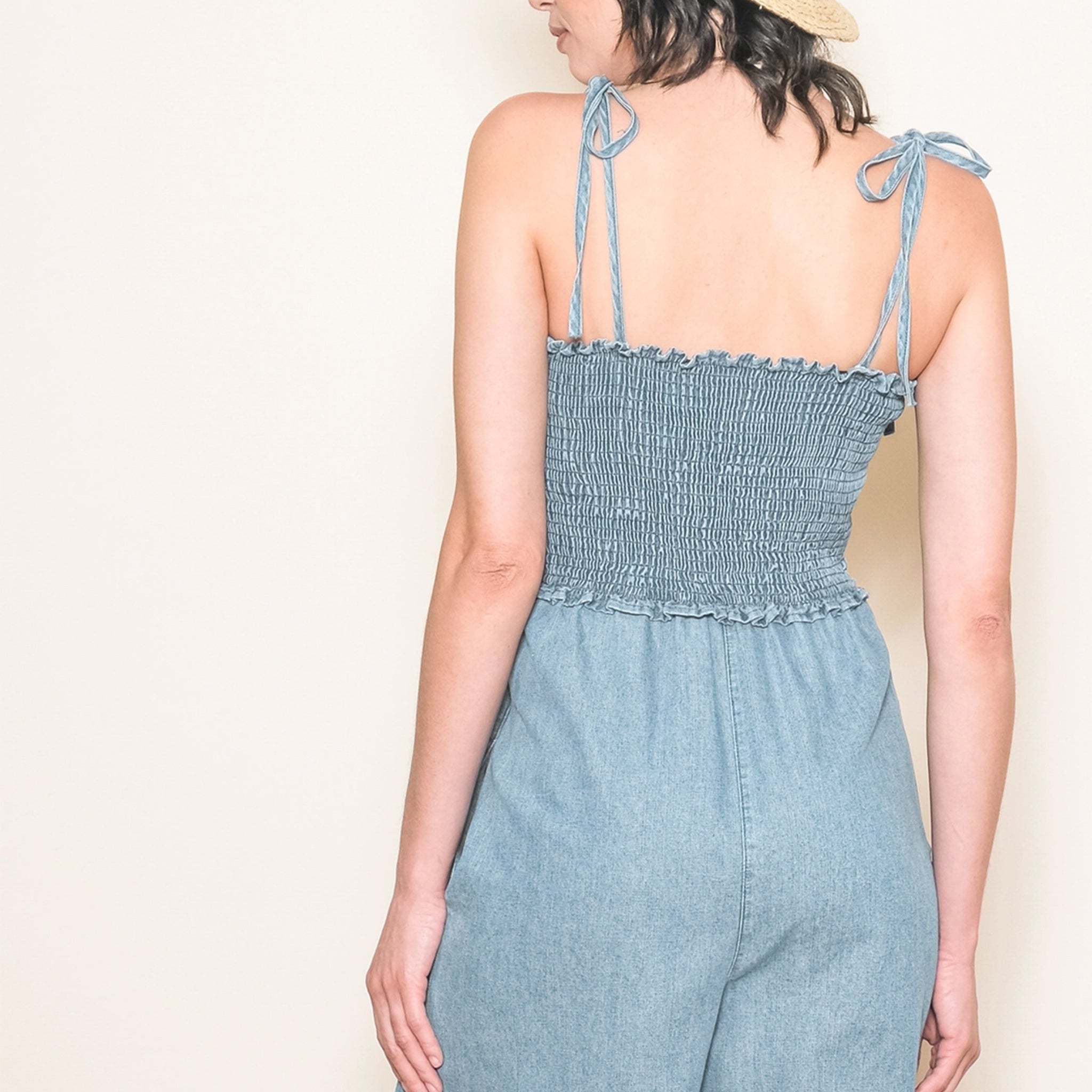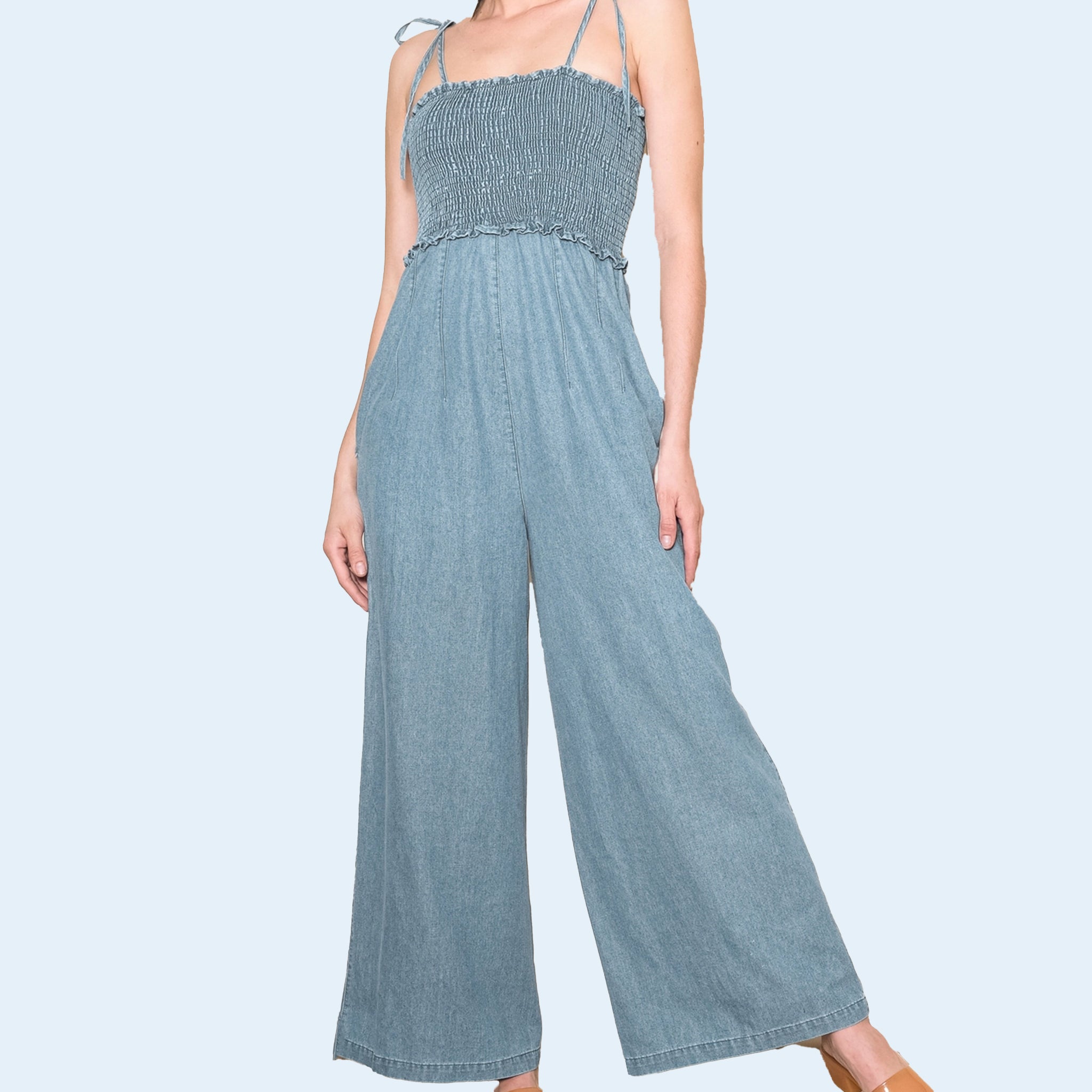Introducing the Vintage Smocked Denim Jumpsuit in the Light Blue shade. This adorable jumpsuit exudes retro charm with its vintage washed finish. Featuring a smocked chest and adjustable straps for comfort, it boasts two pockets for convenience. The relaxed fit and wide legs offer a trendy yet comfortable style for any occasion.